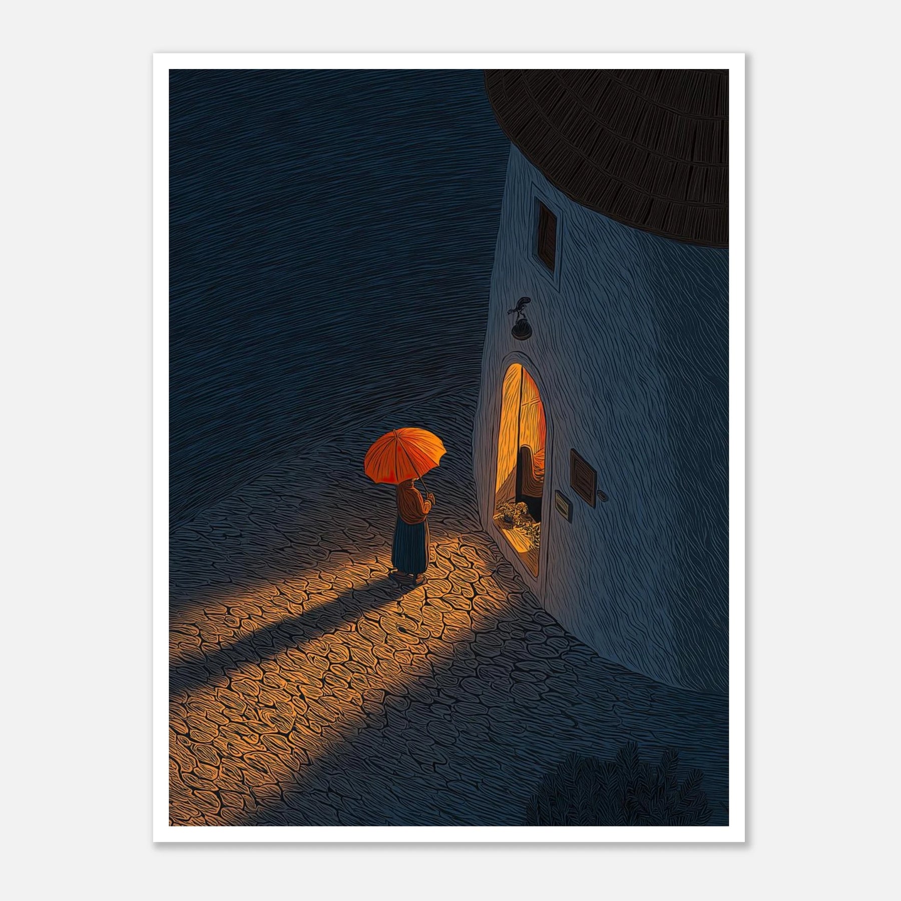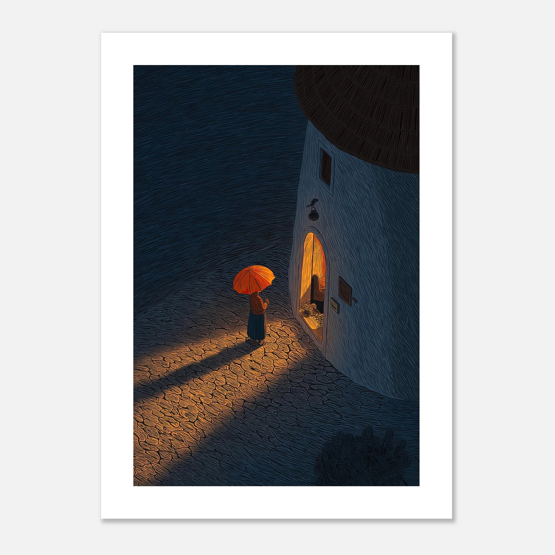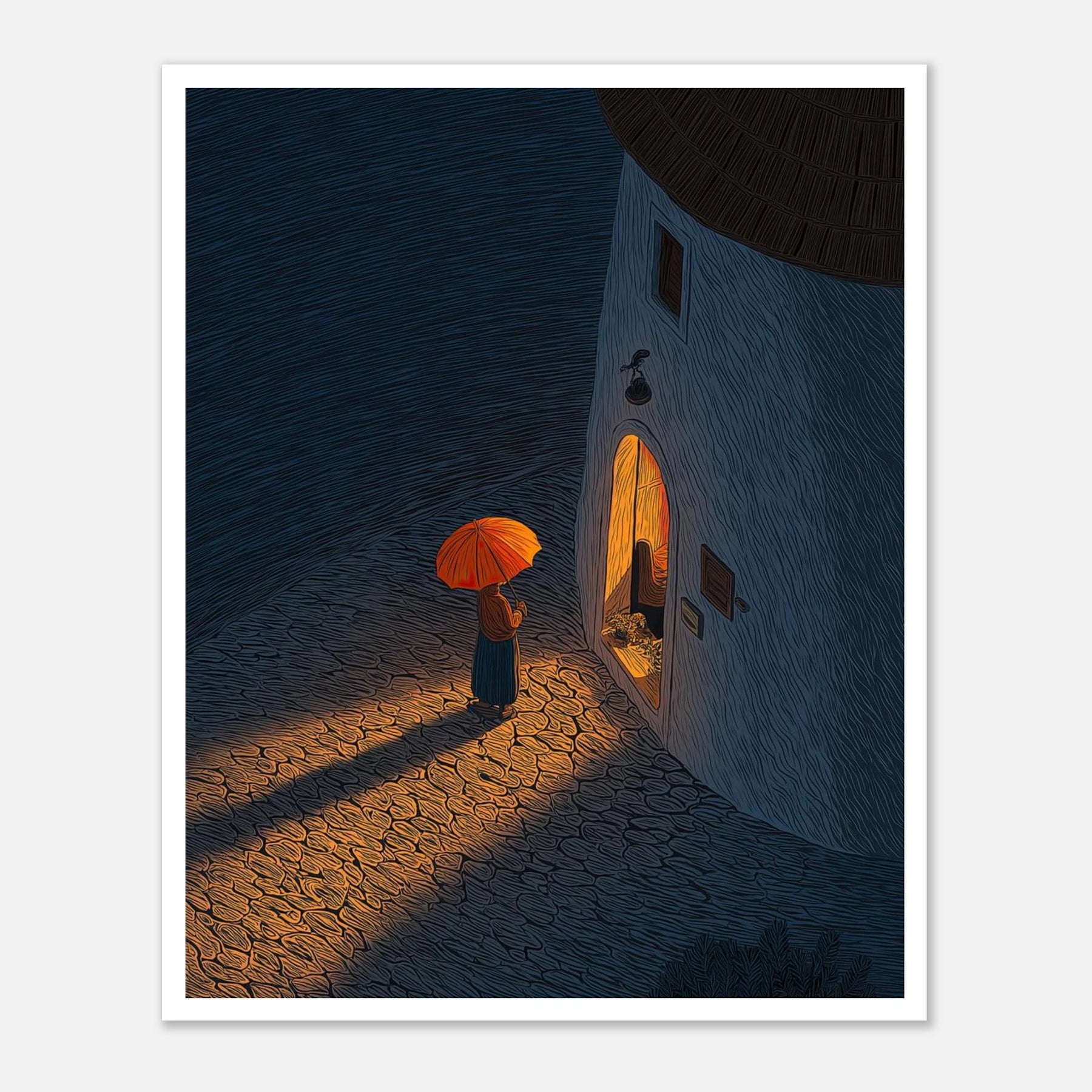 Standing in the cool night air with an umbrella, looking into a warm, inviting doorway. This piece perfectly captures that deep sigh of relief when you finally arrive exactly where you need to be.
