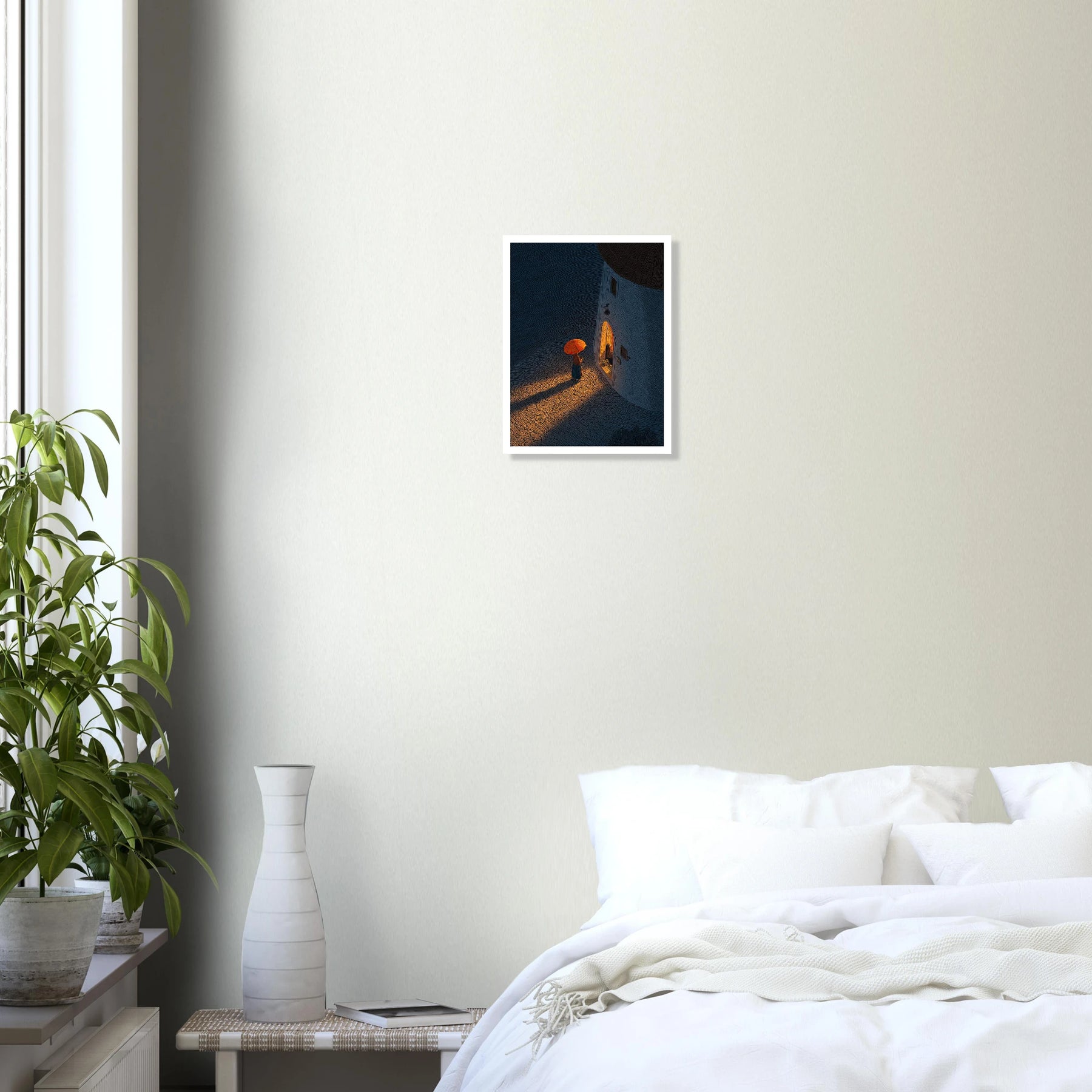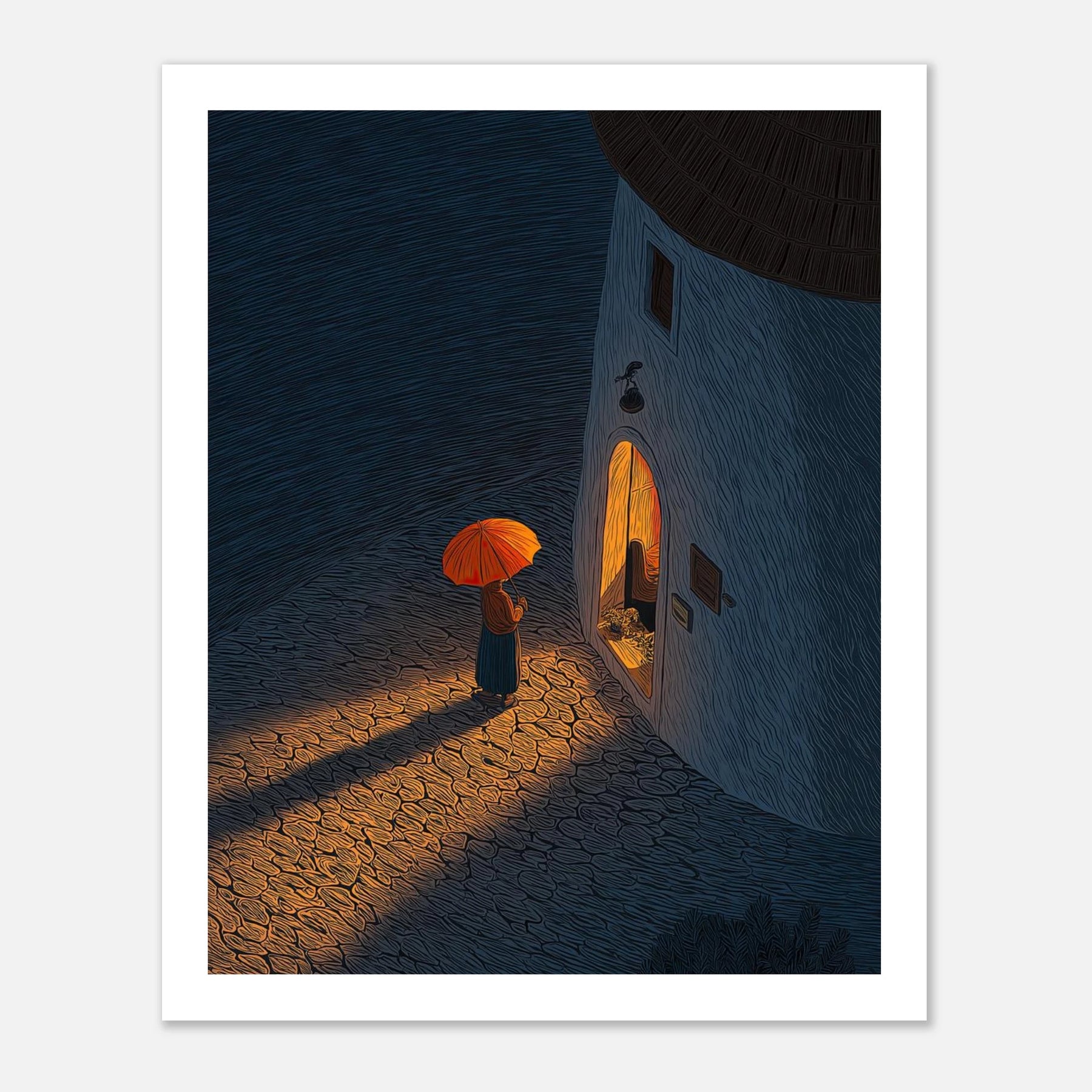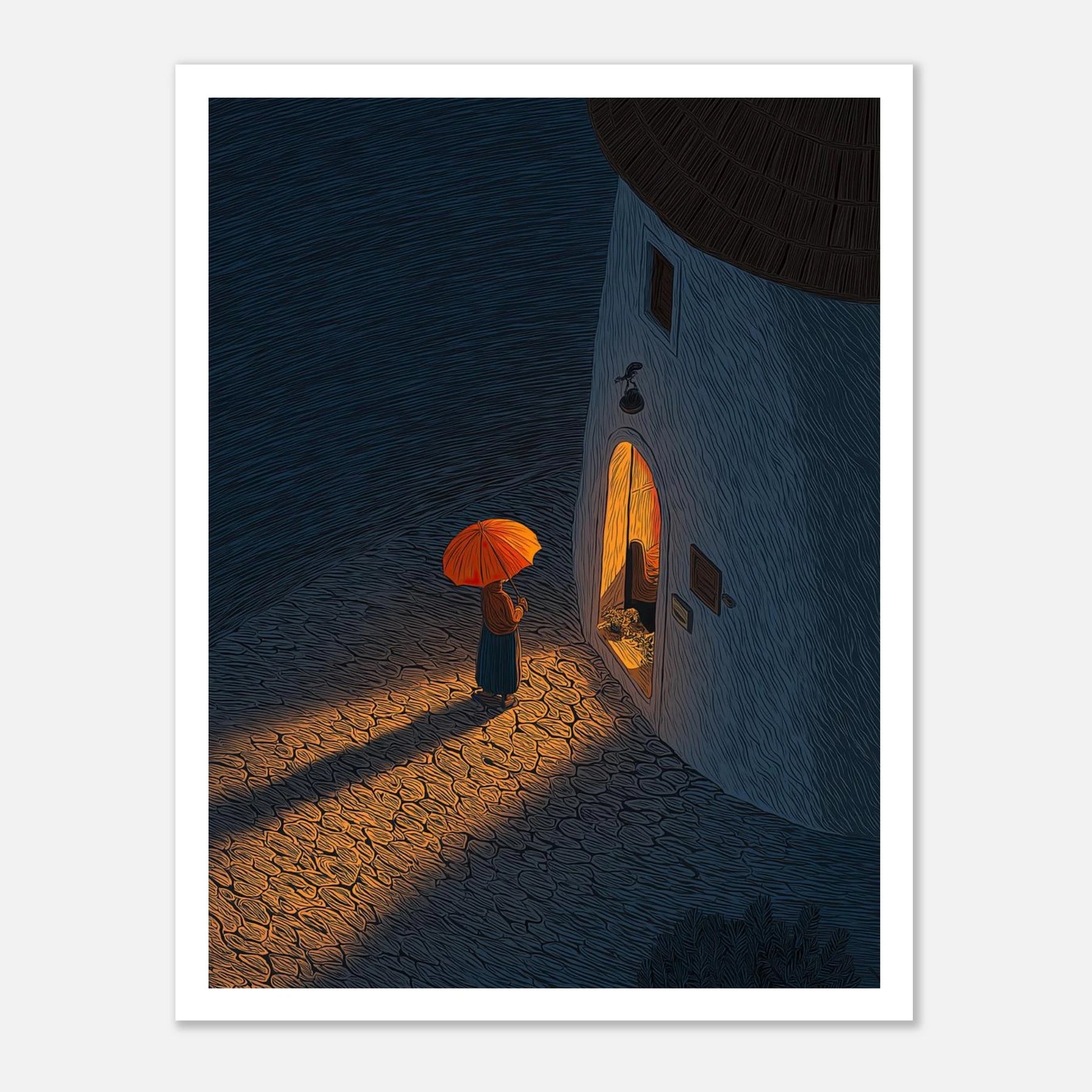 Standing in the cool night air with an umbrella, looking into a warm, inviting doorway. This piece perfectly captures that deep sigh of relief when you finally arrive exactly where you need to be.