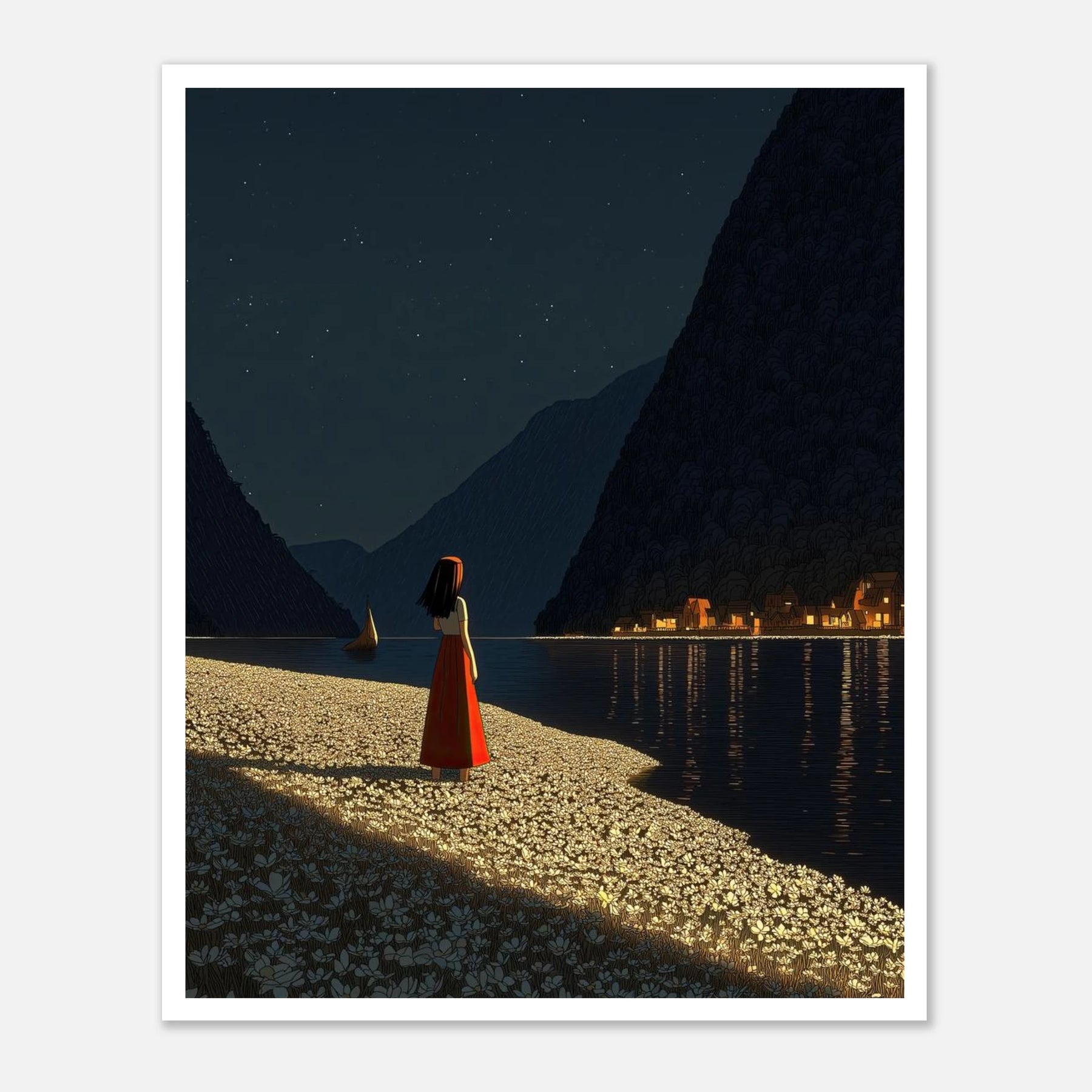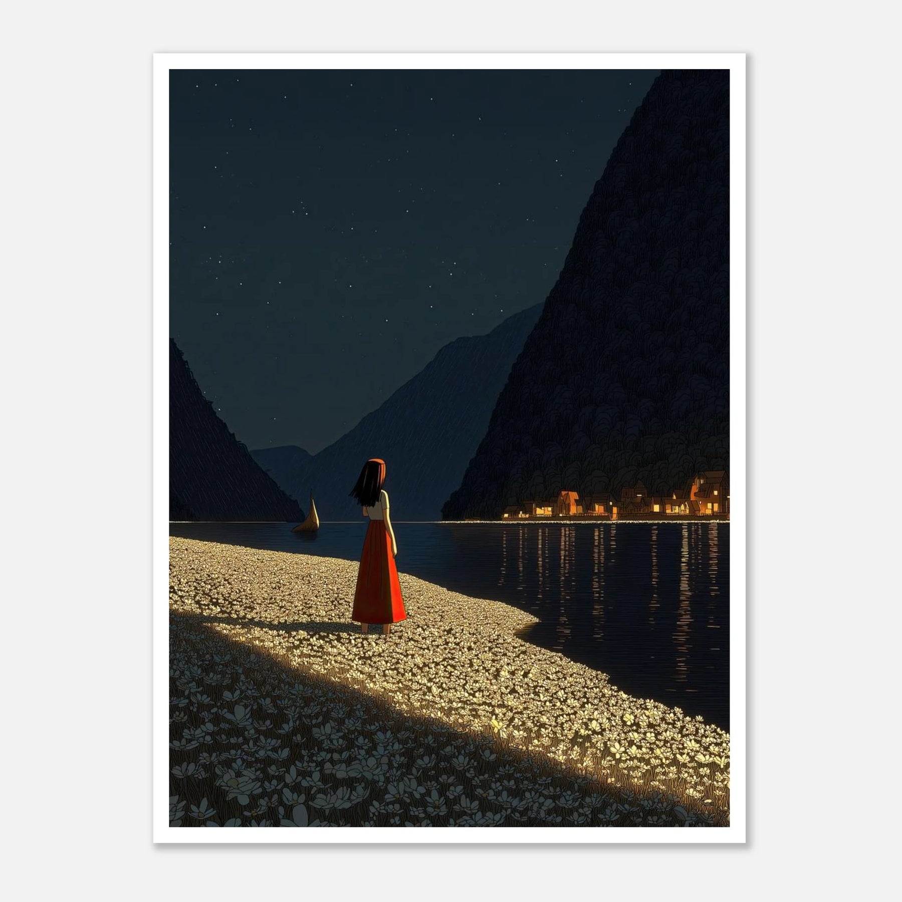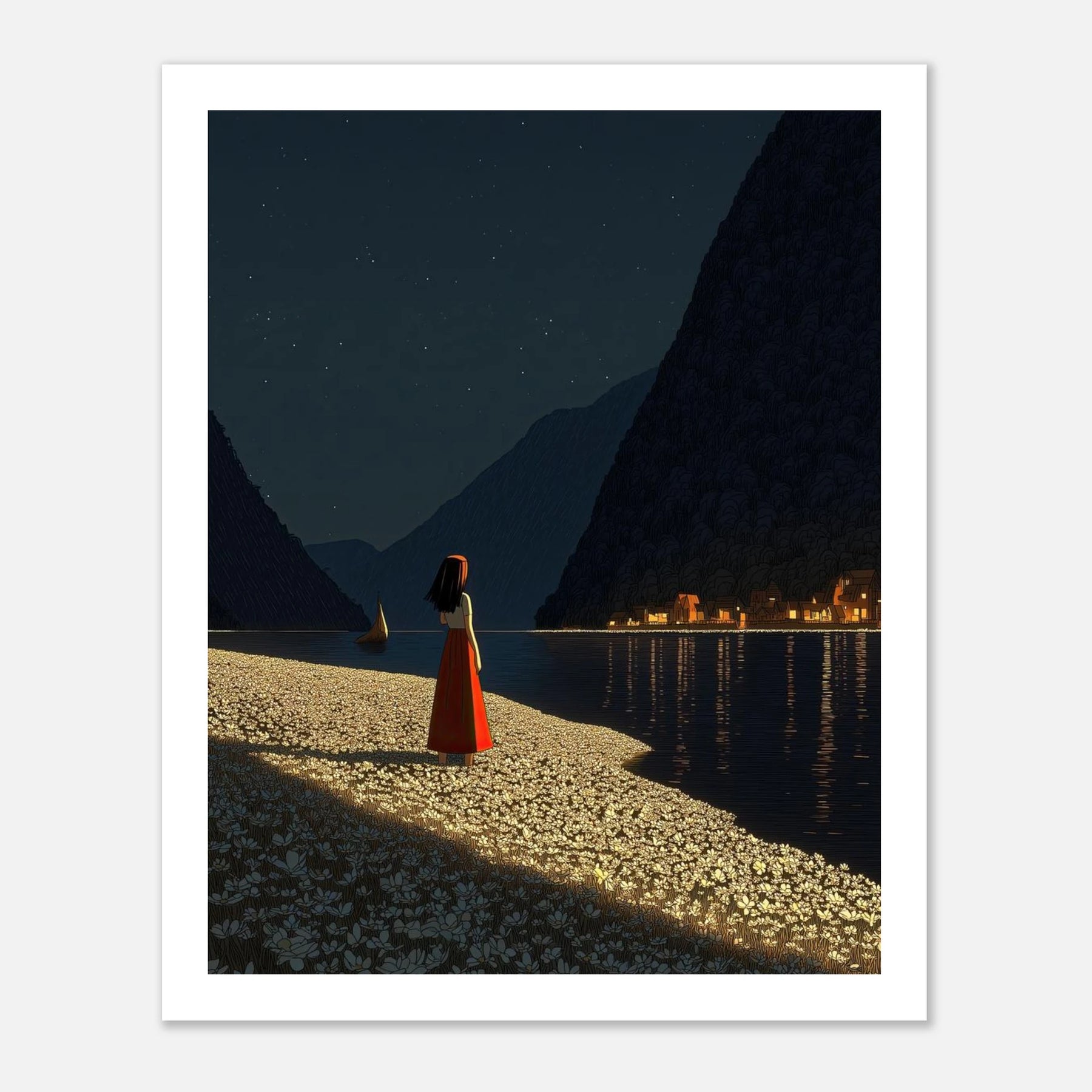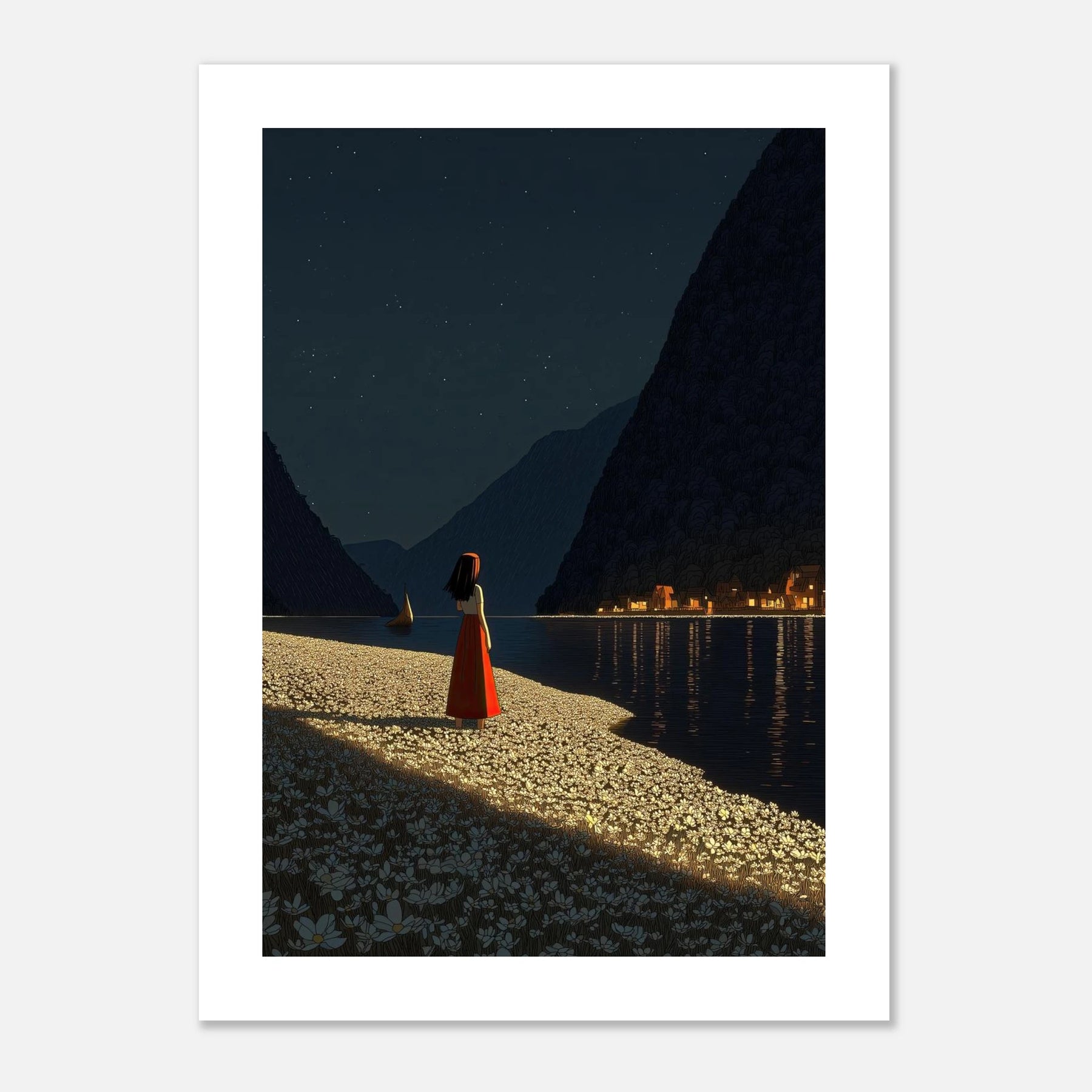 True light always stands out in the dark. A figure stands on a shore covered in white flowers, looking across a still, dark lake to a warm, glowing village. It captures that feeling of knowing where you want to go, and taking a deep breath before you start the journey. A beautiful, soul-touching piece for your wall.