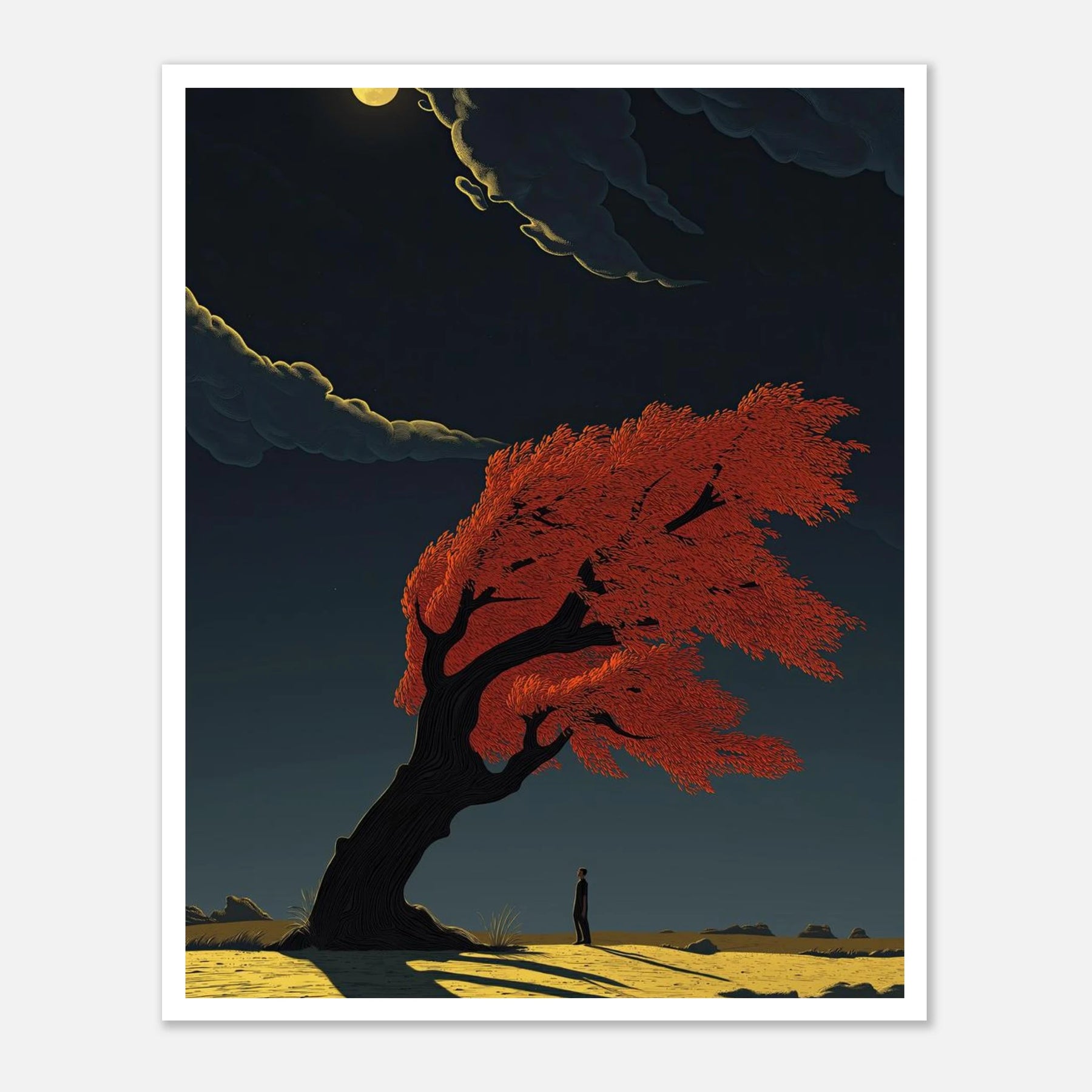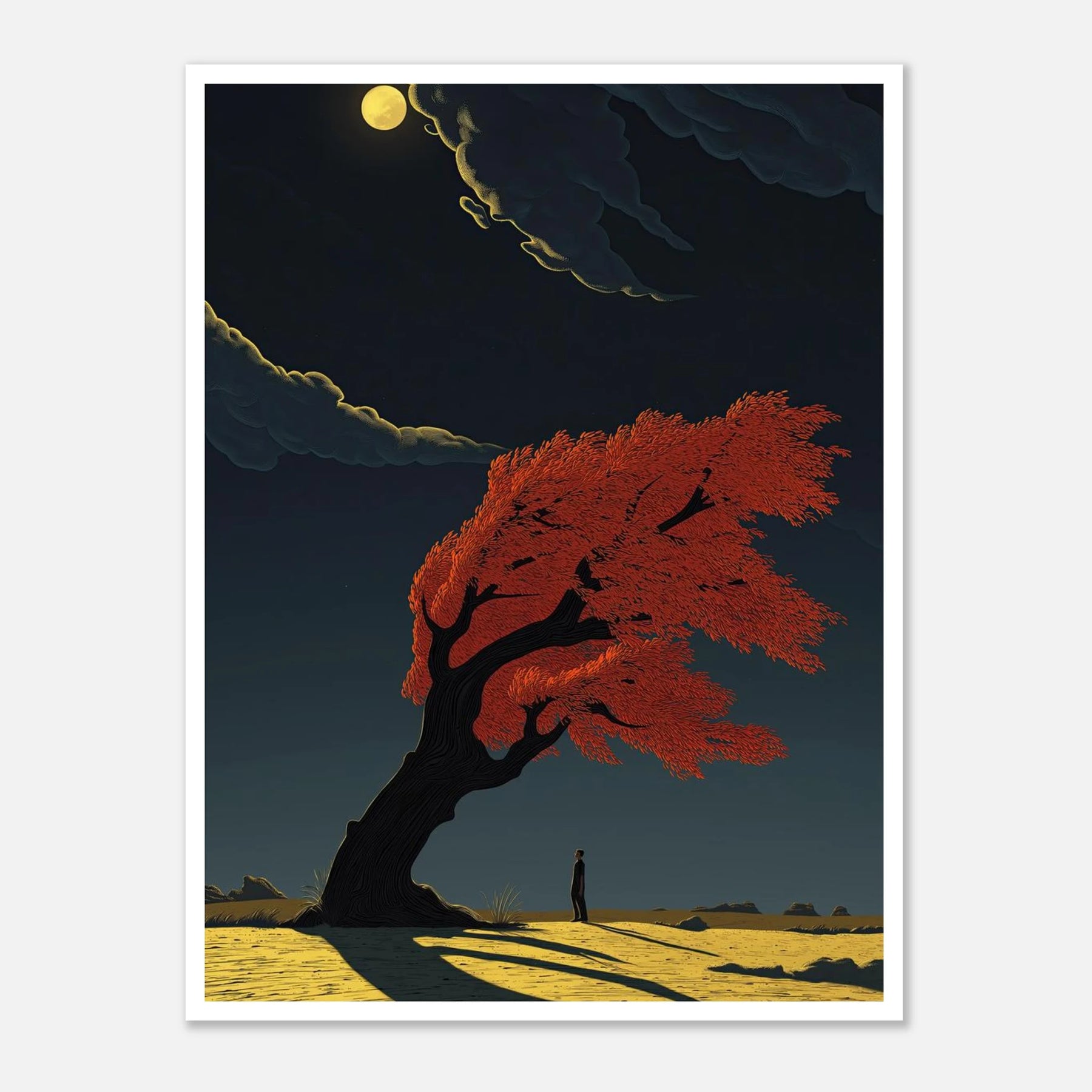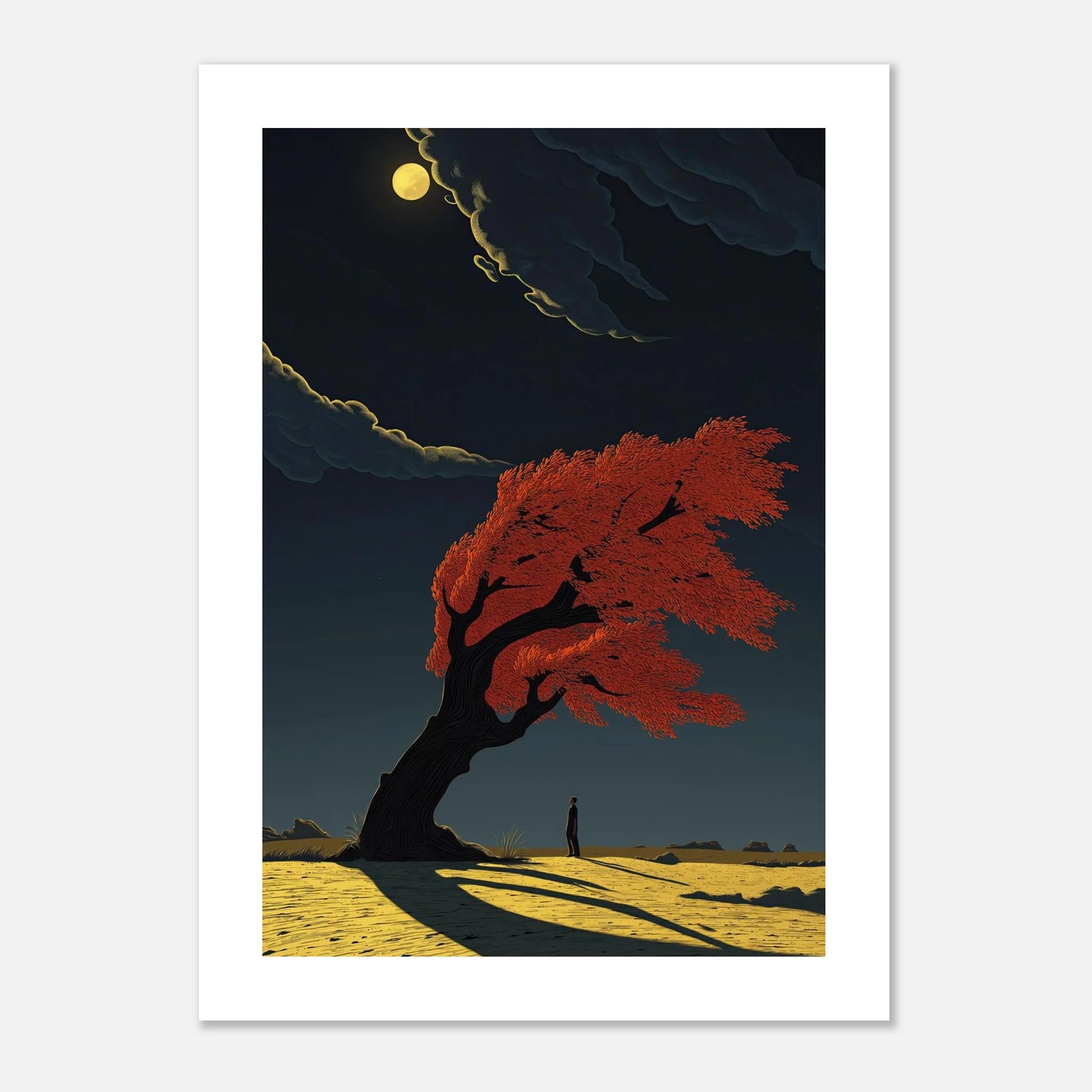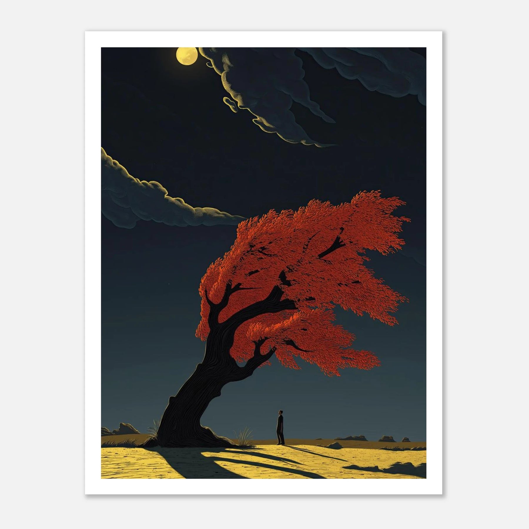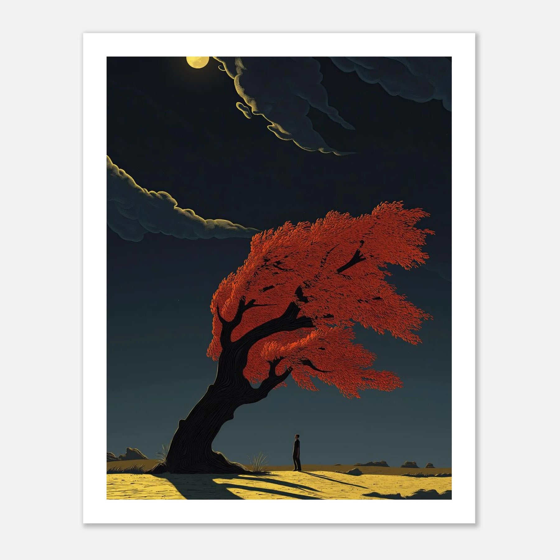 A dramatic study of movement and light. A lone figure stands beneath a magnificent, wind-swept tree with fiery red foliage, its form bending but not breaking against a gale. The long, sharp shadow cast across the golden earth creates a powerful sense of timing and atmospheric depth.