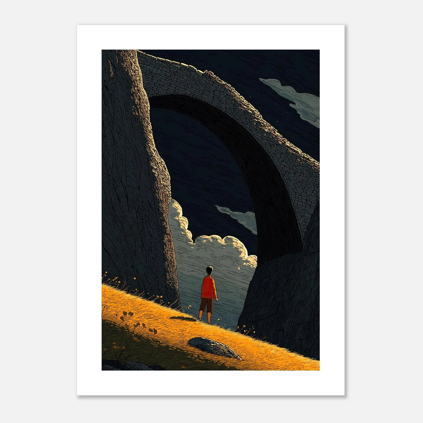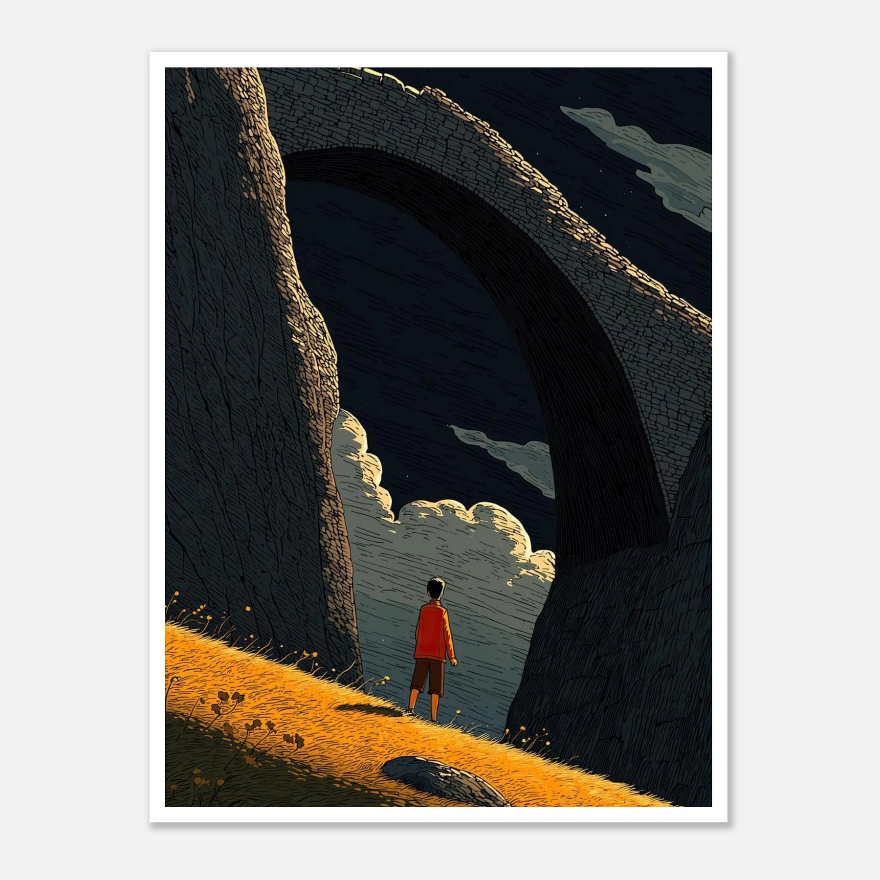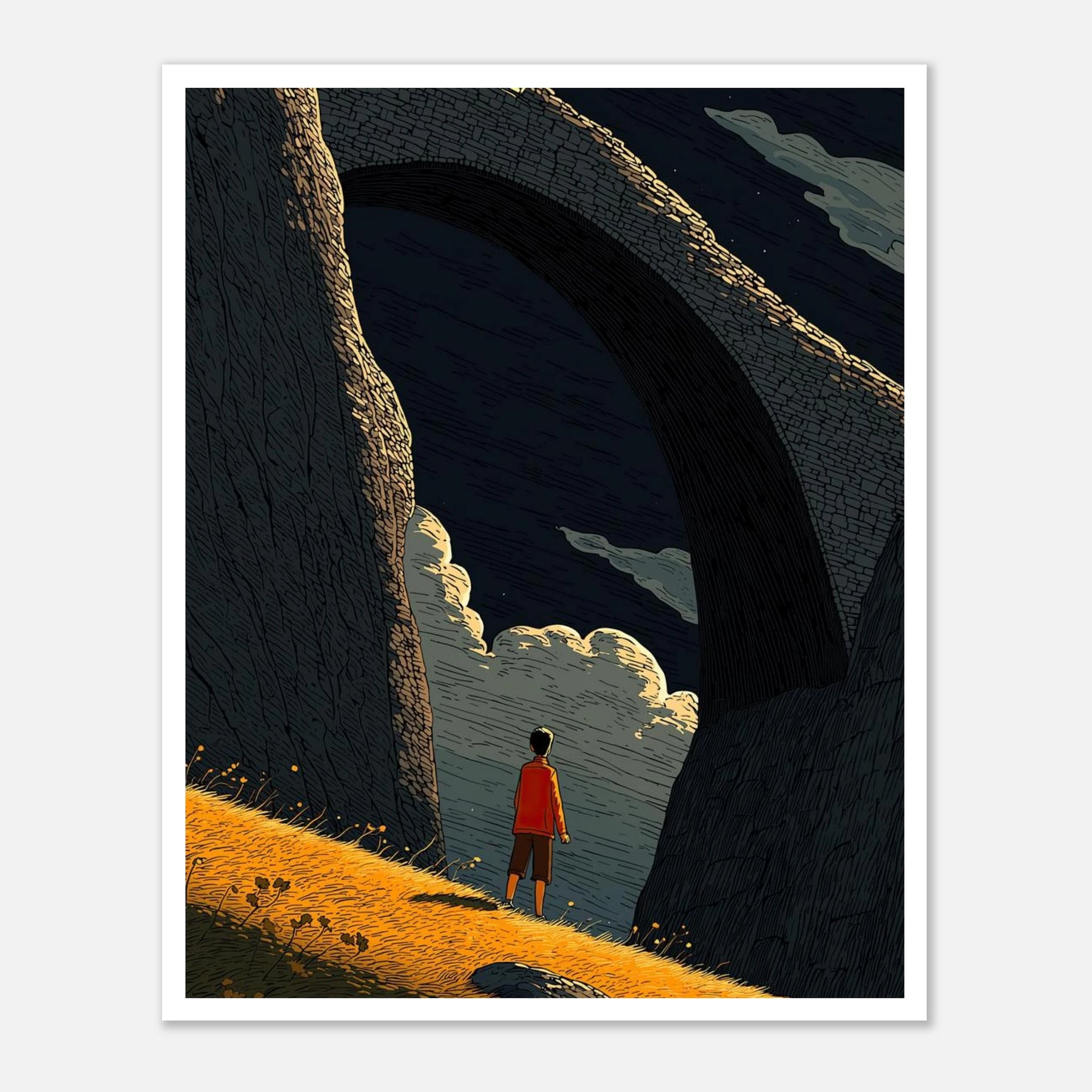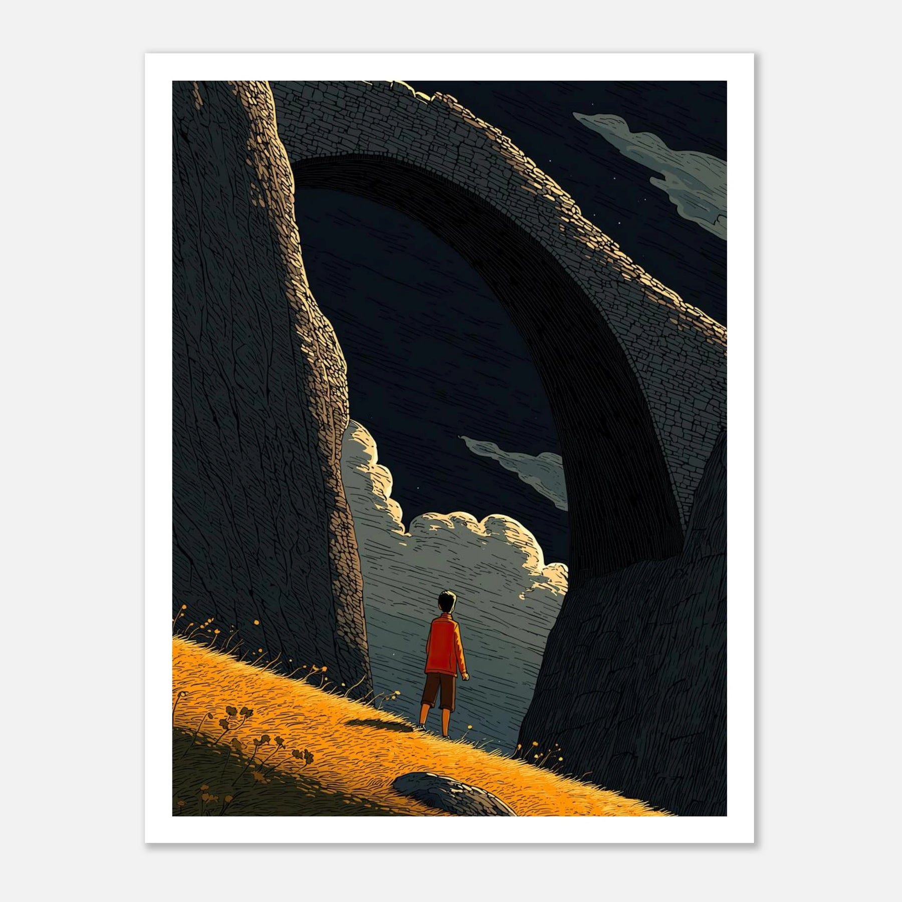 Capture the feeling of absolute awe with this dramatic landscape. A lone figure stands dwarfed by a colossal, ancient stone archway that stretches across the night sky. The warm, golden light illuminating the grassy hillside beautifully offsets the deep, textured shadows of the stone and the drifting night clouds. A powerful statement piece for lovers of epic fantasy.