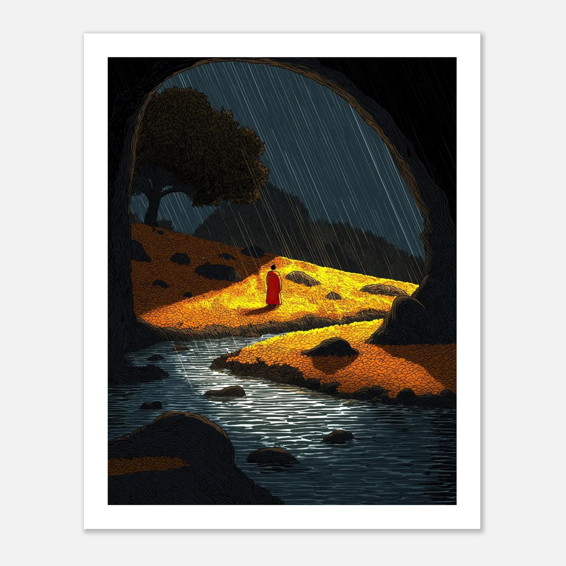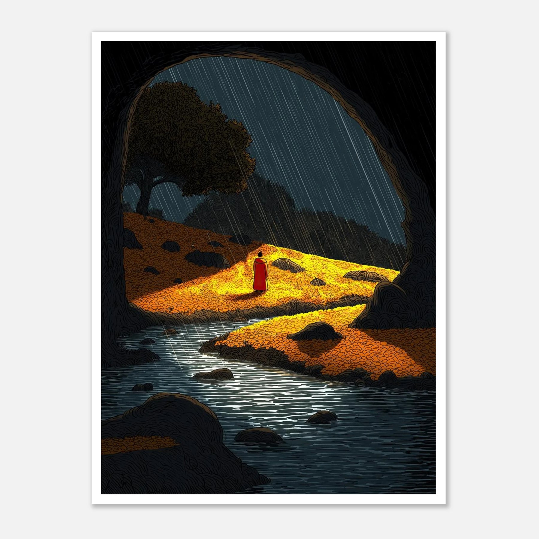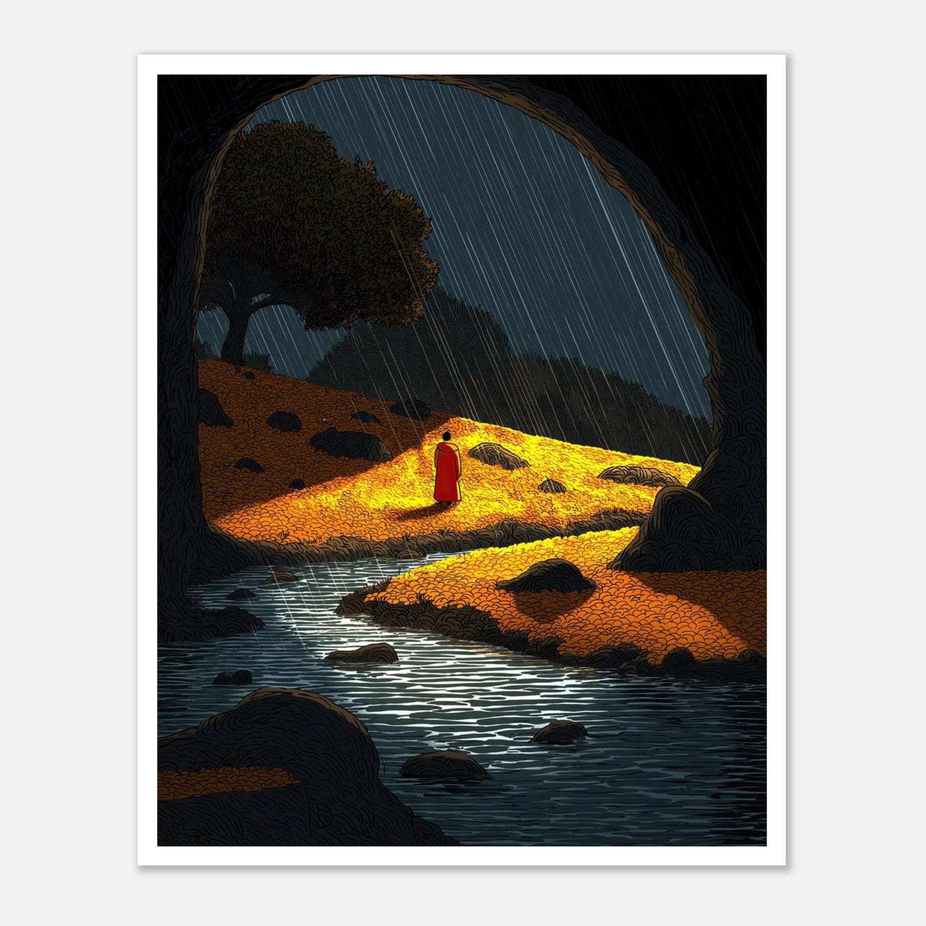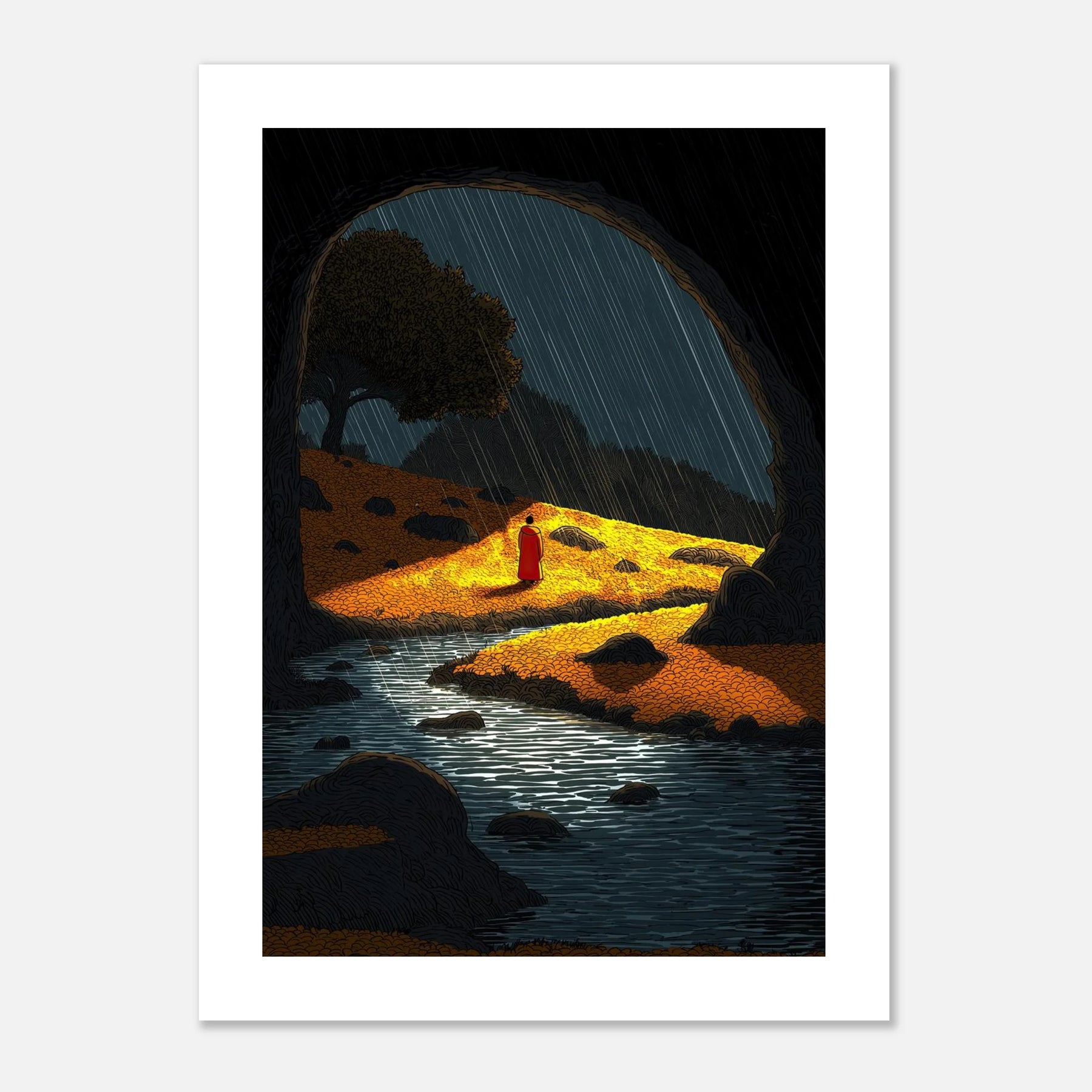Framed by the shadowed, rocky mouth of a cavern, a traveler steps into a glowing, rain-kissed landscape. The contrast between the dark, textured stone of the foreground and the brilliantly lit golden hills and winding stream creates a powerful sense of emerging into the light. A beautifully moody addition to your art collection.
