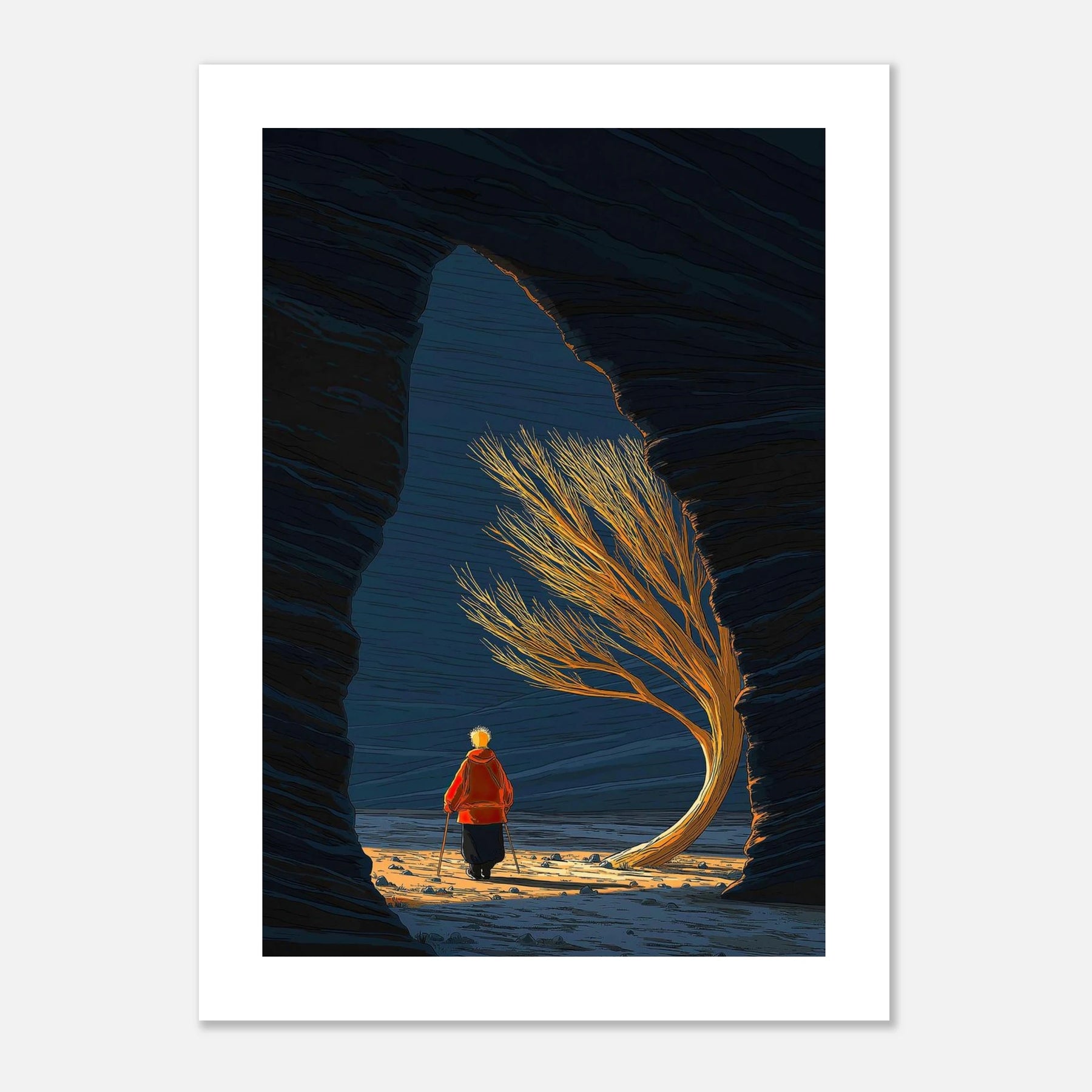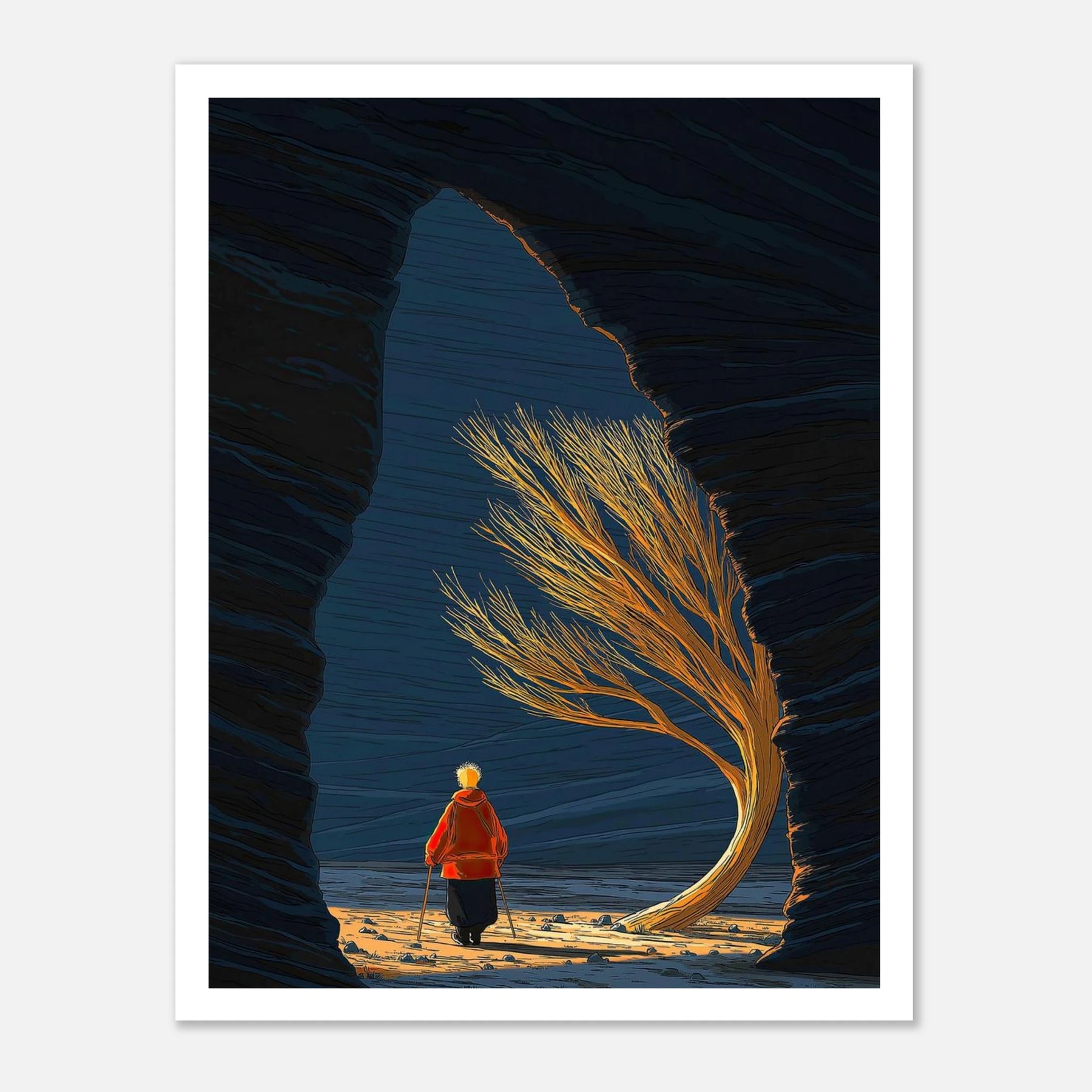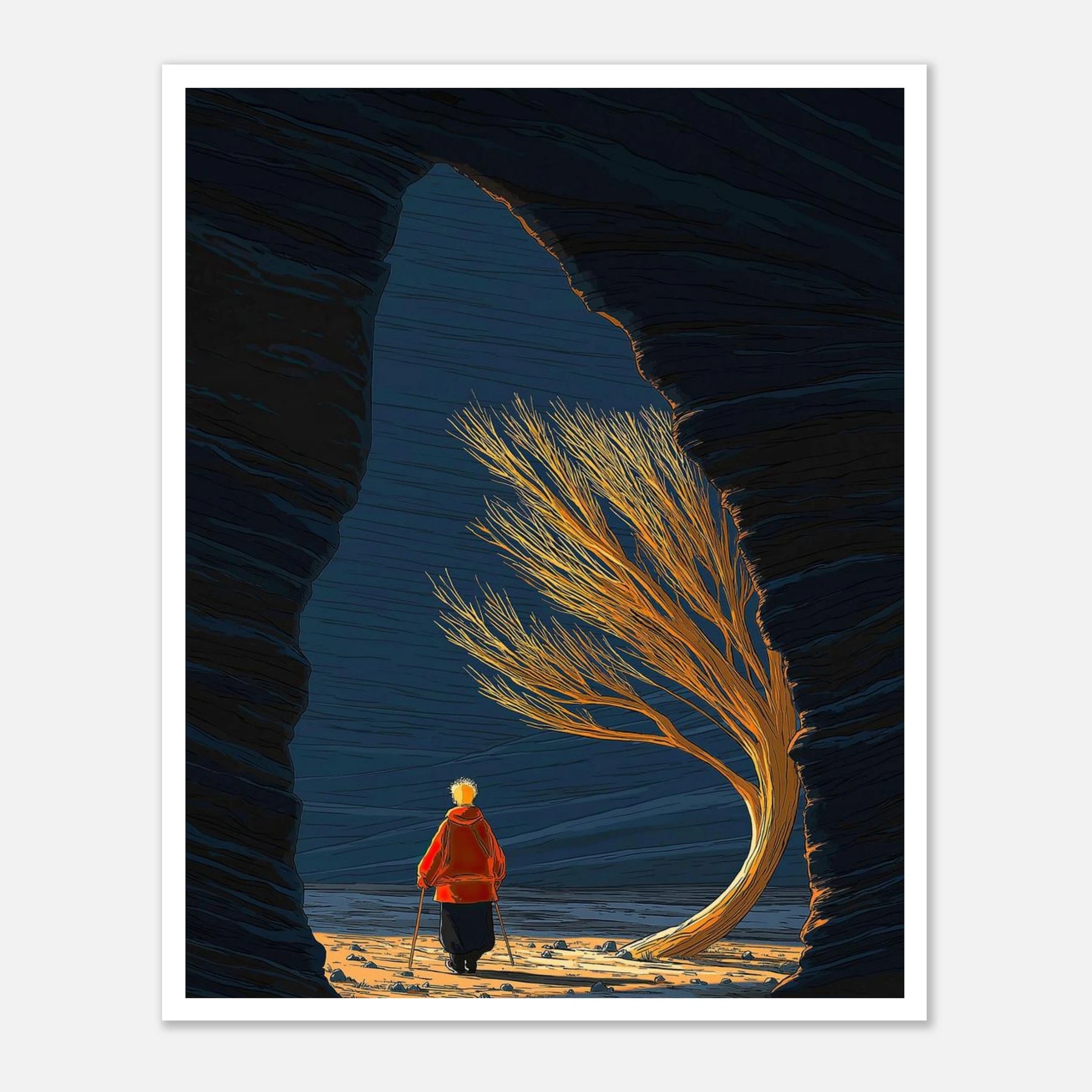 Step into a world of quiet mystery and epic scale. This captivating print features a solitary traveler in a striking red cloak, paused on a weathered suspension bridge over a rushing river. Dwarfed by massive, beautifully detailed storm clouds and a vast starry sky pierced by a crimson moon, the figure stands at the threshold of the unknown. The vibrant yellow floral fields contrast brilliantly against the deep shadows of the gorge, making this a visually arresting centerpiece for any room. Perfect for dreamers, adventurers, and lovers of fantasy landscapes.