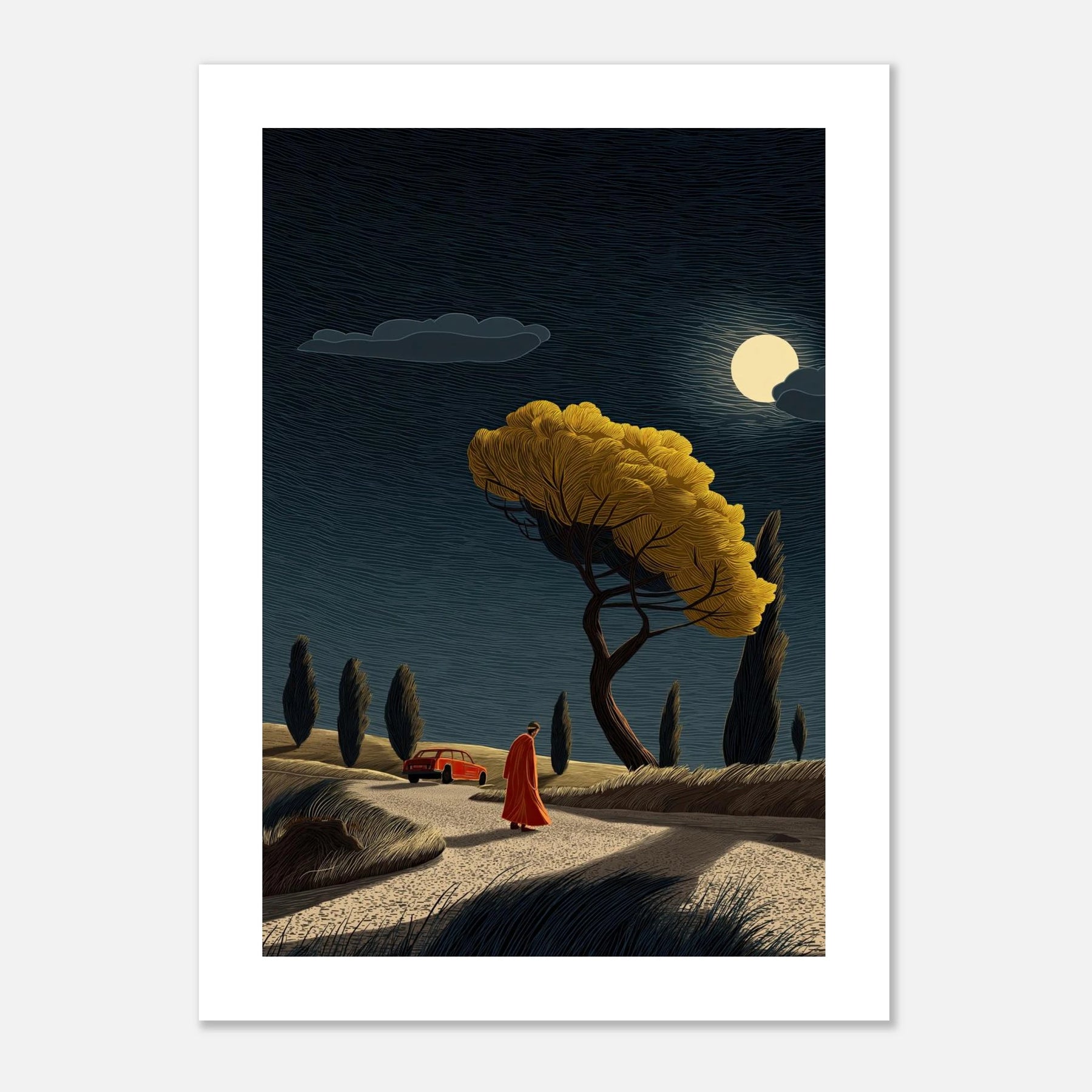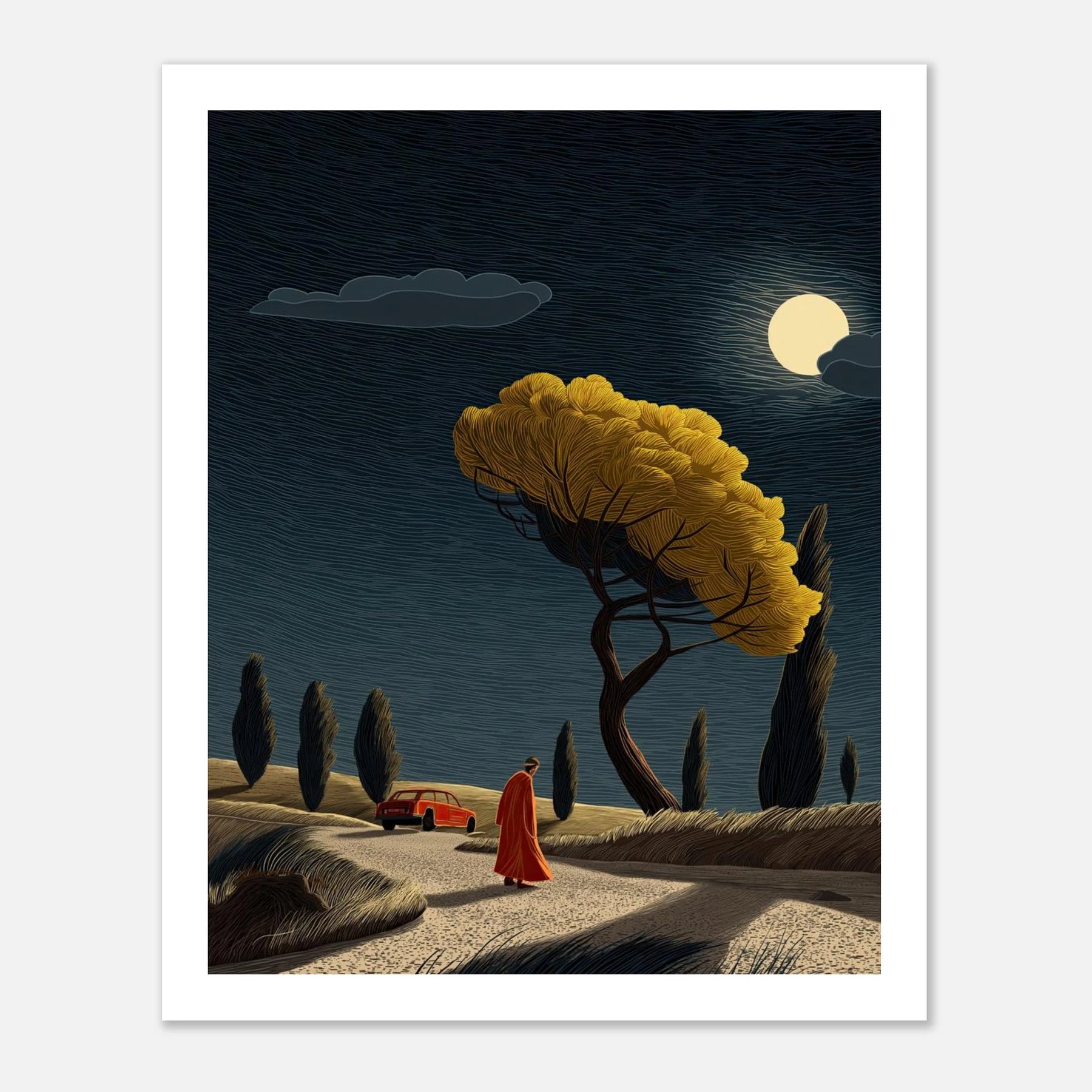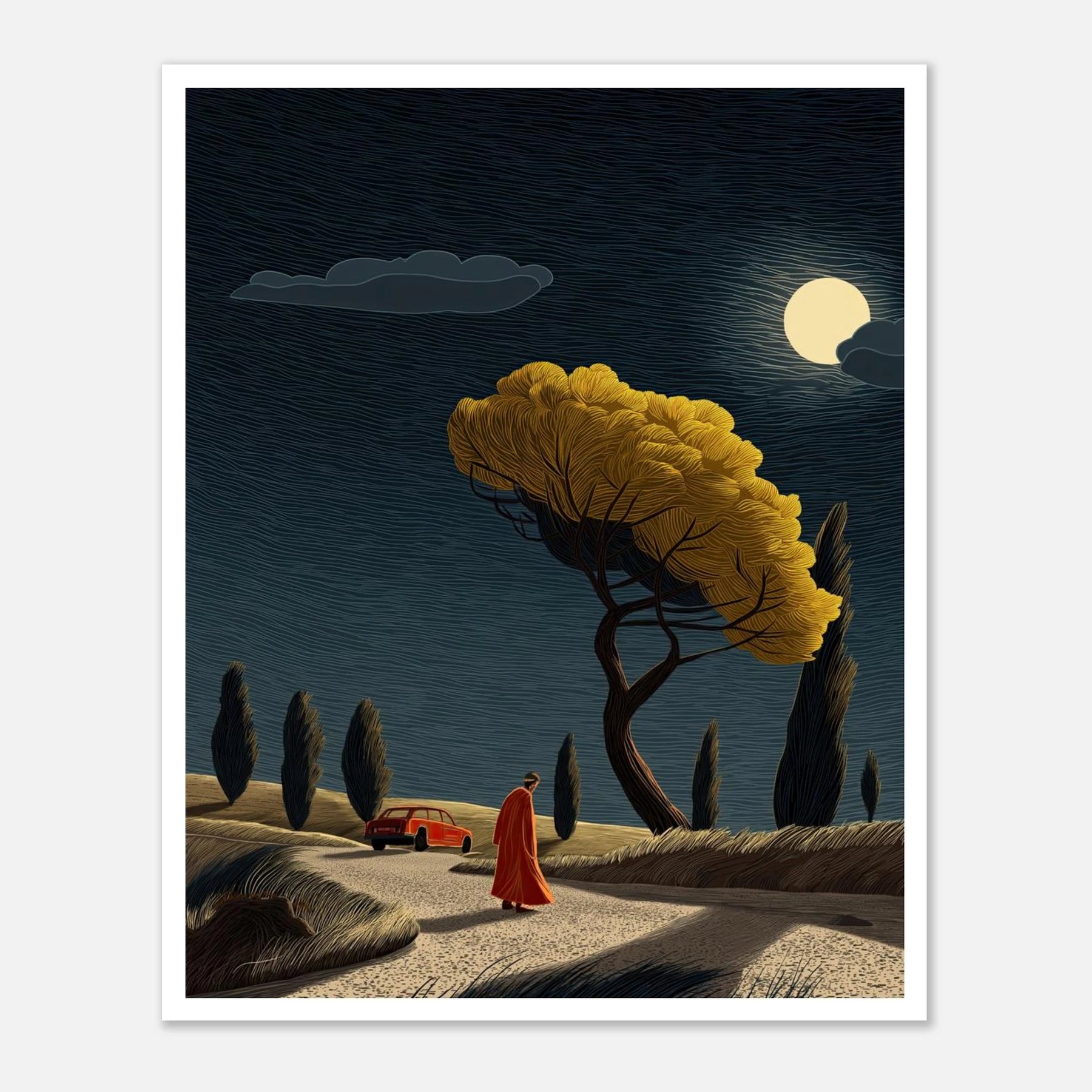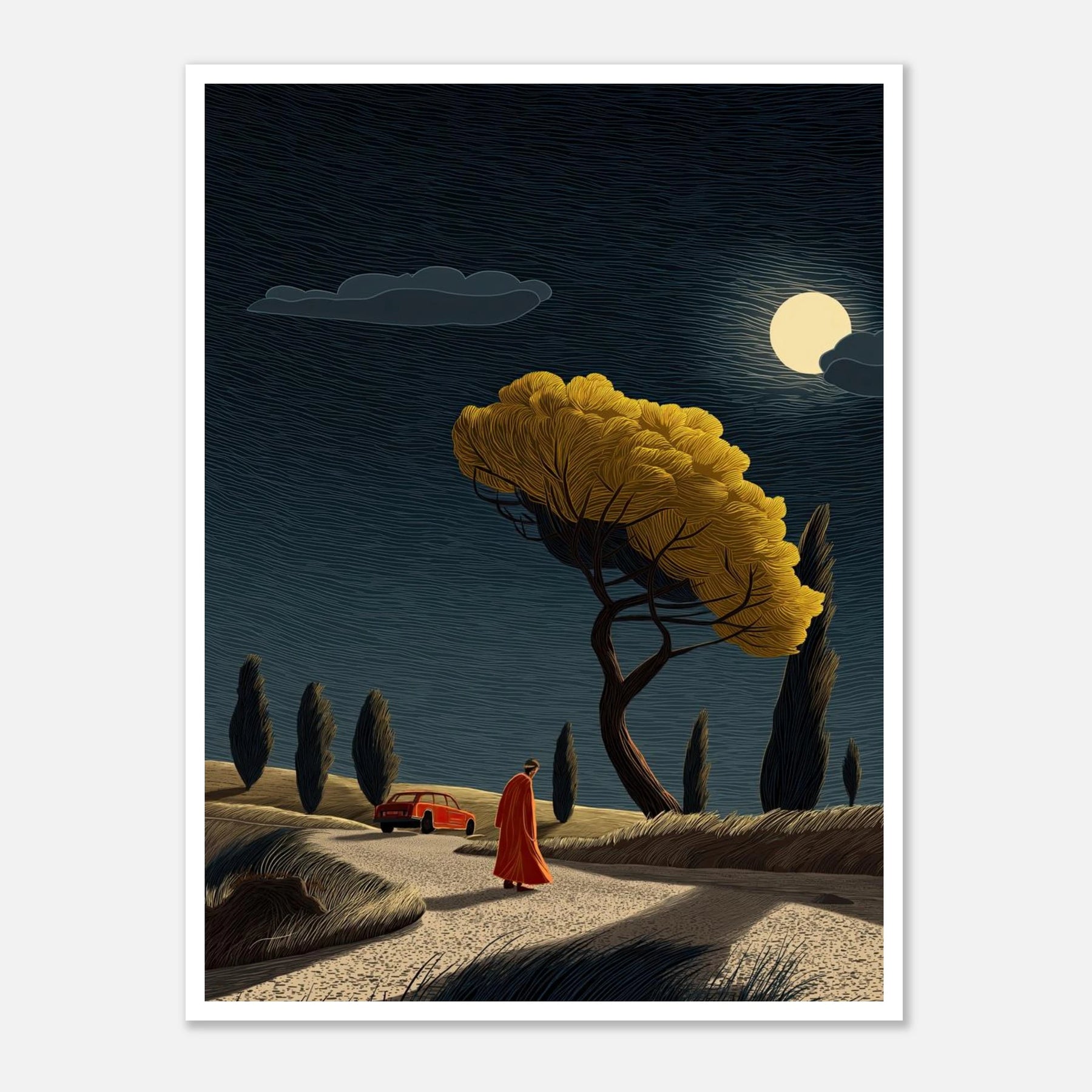 A car parked in the distance, a quiet walk toward a brightly lit tree under the full moon. This captures the exact moment you decide to walk away from what drains you and step toward what brings you life. This poster is a beautiful daily reminder that it is completely okay to change directions to protect your peace.