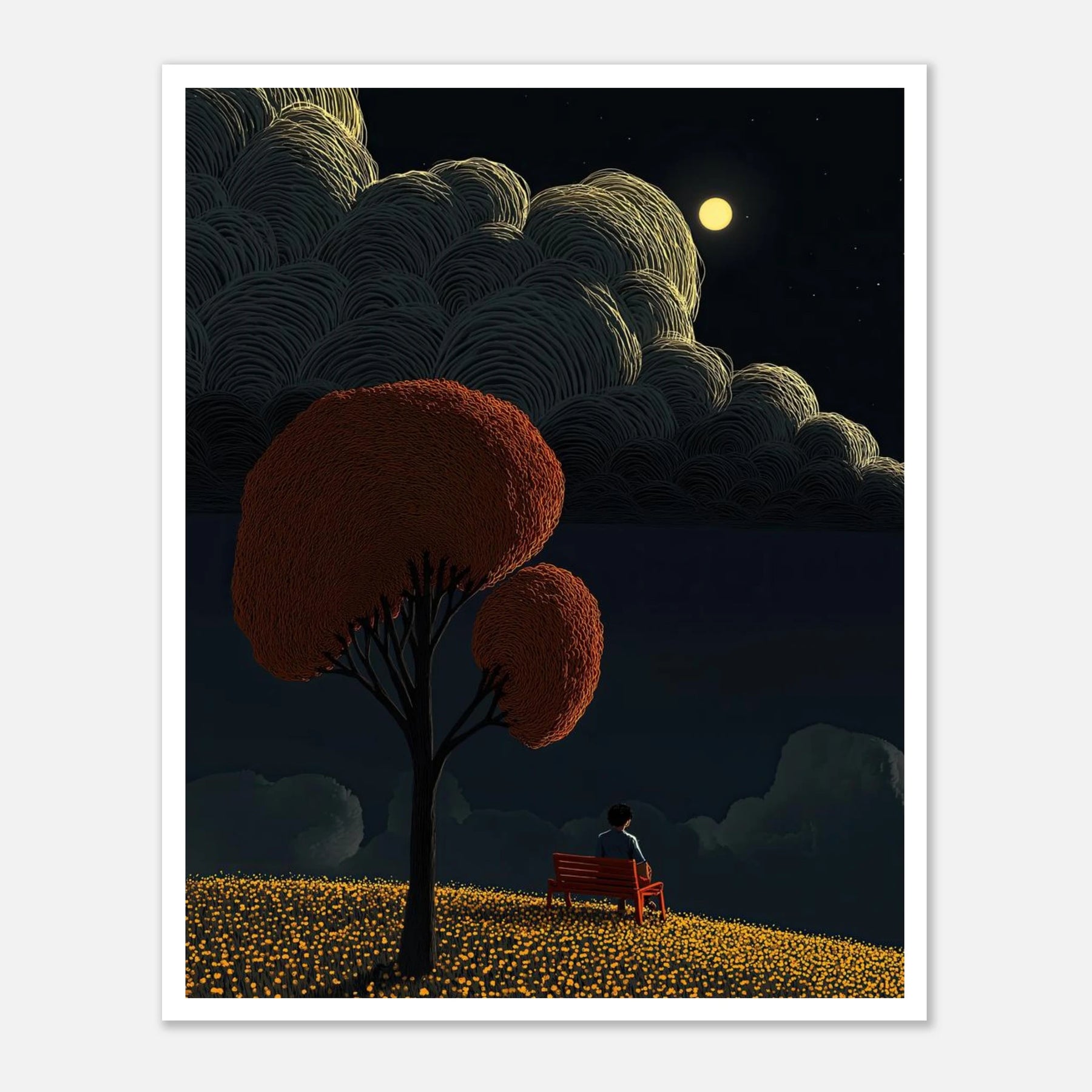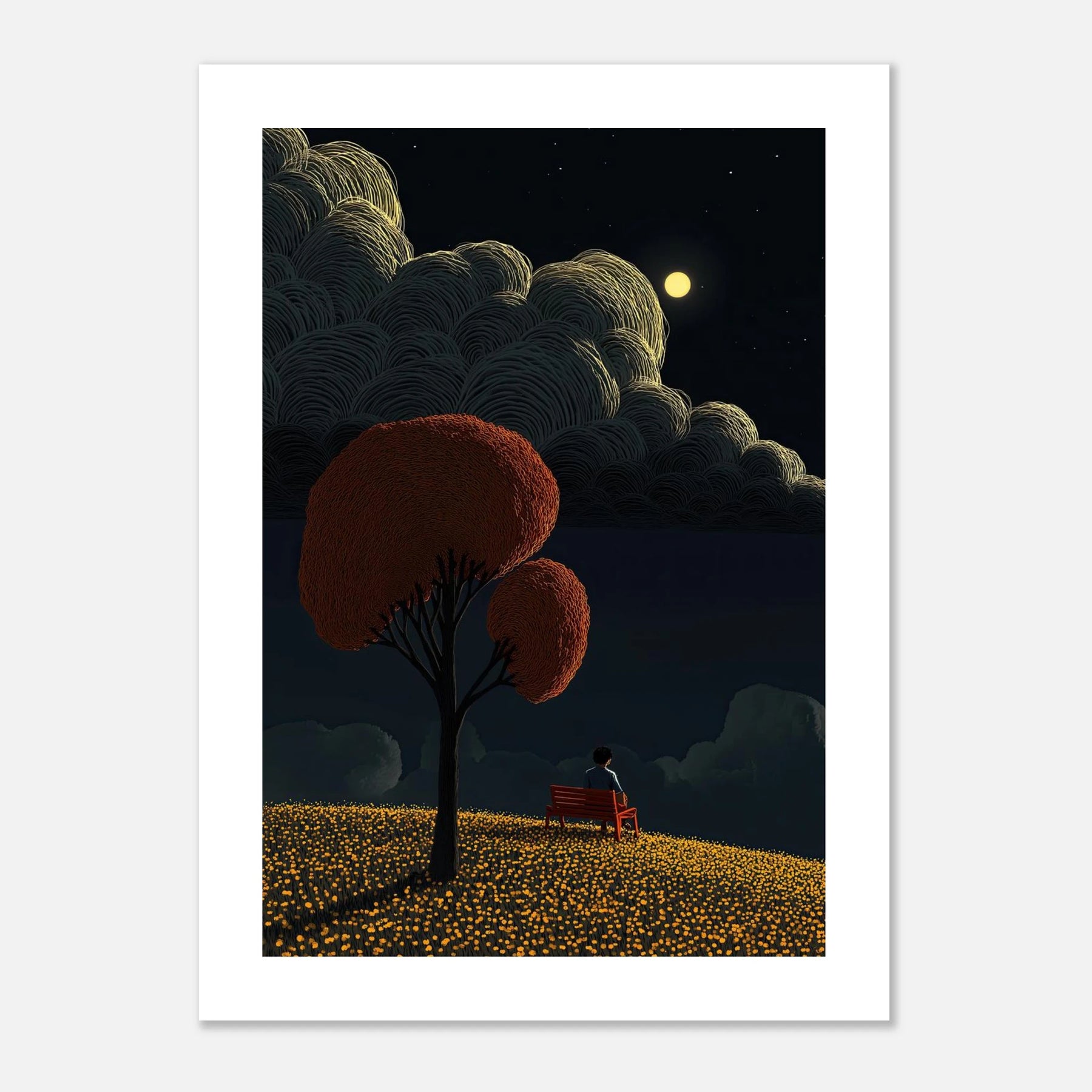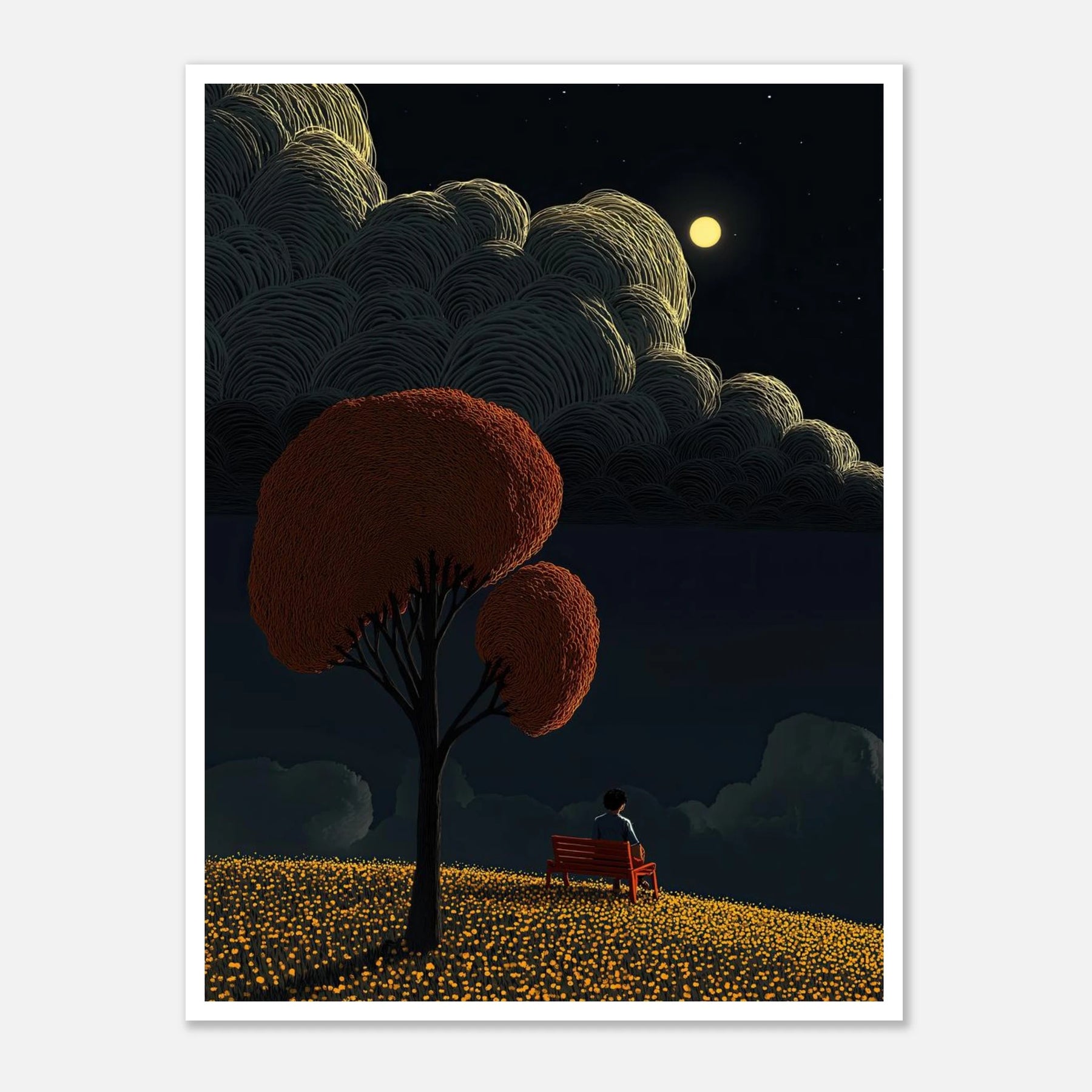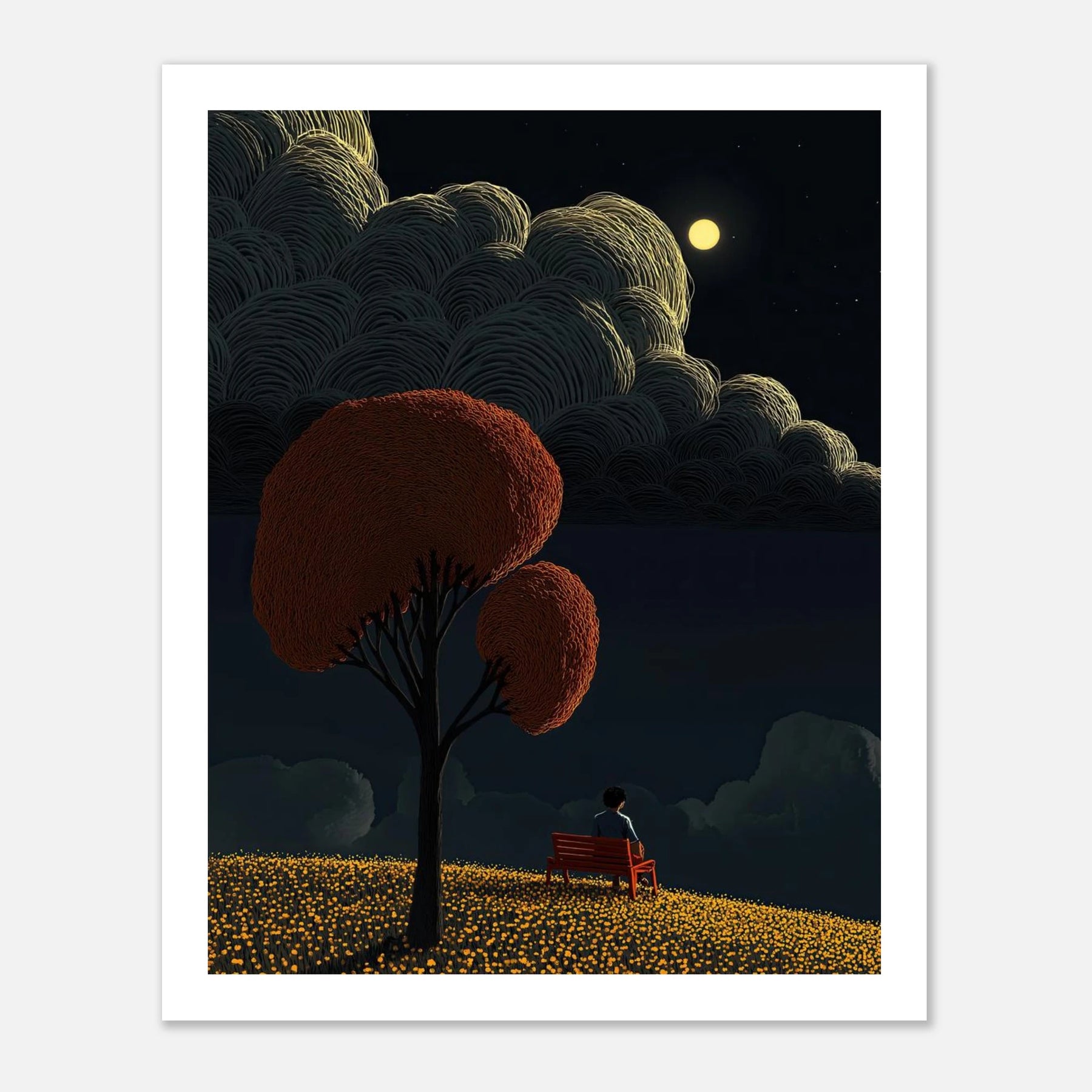 Lose yourself in the tranquility of a moonlit night. This artwork features a solitary figure resting on a red bench, overlooking a rolling field of glowing yellow flowers. The true star of the piece is the sky—filled with voluminous, deeply textured clouds illuminated by a bright full moon. A deeply calming piece for a bedroom or reading nook.