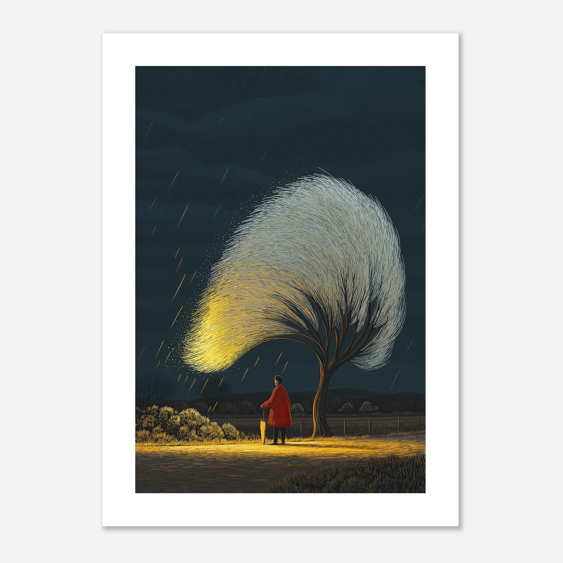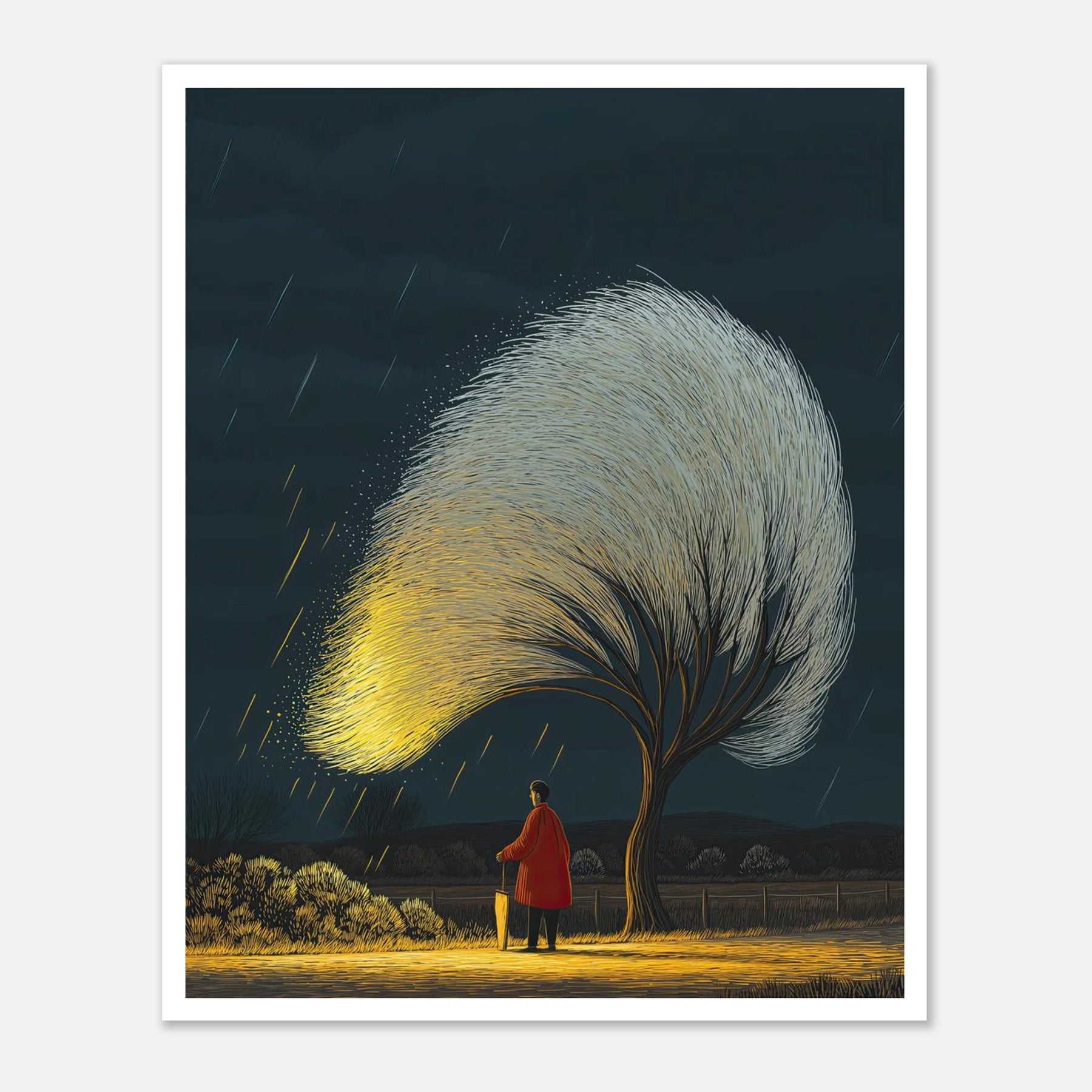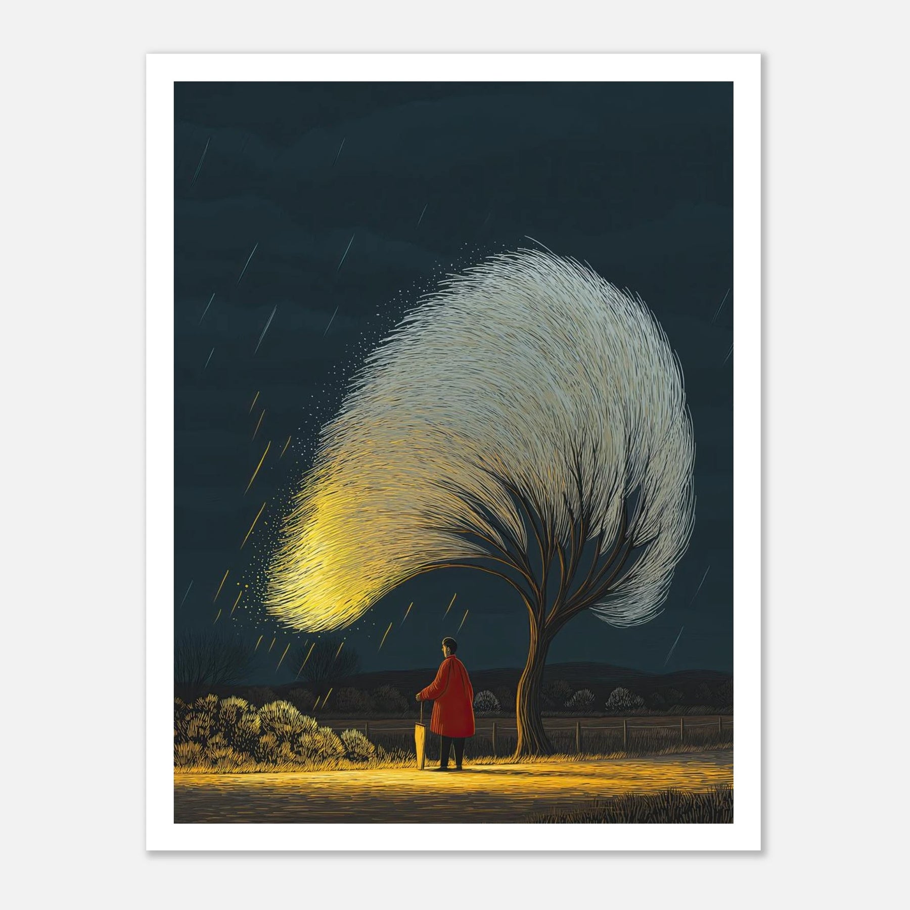 When life pours down on you, you have to find the things that still glow. This poster shows a quiet moment of comfort under a bright tree during a storm. It is a reminder to protect your boundaries, find your safe space, and let the storm pass.