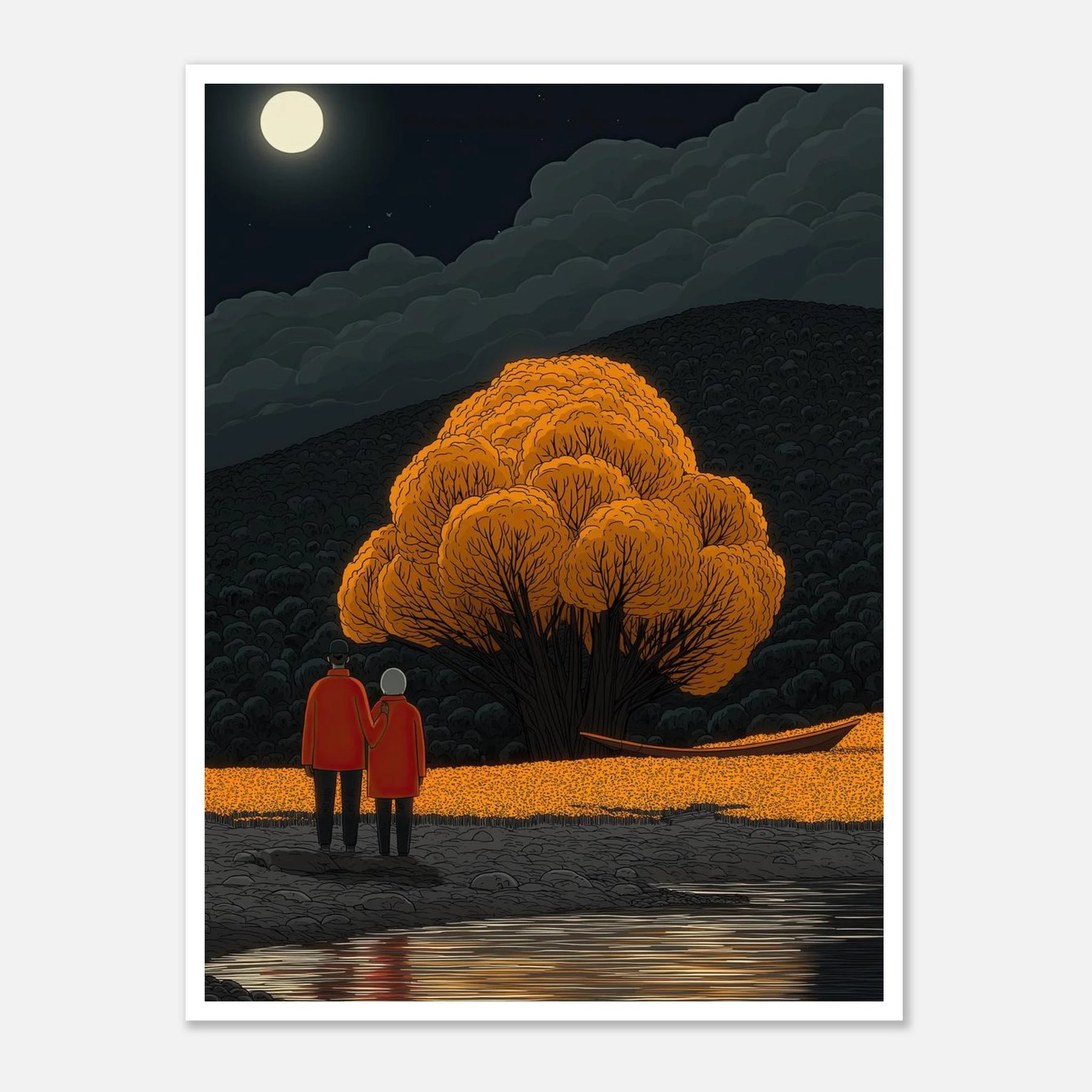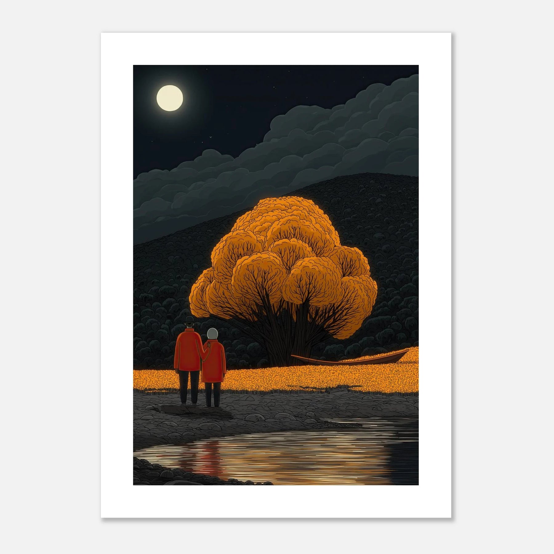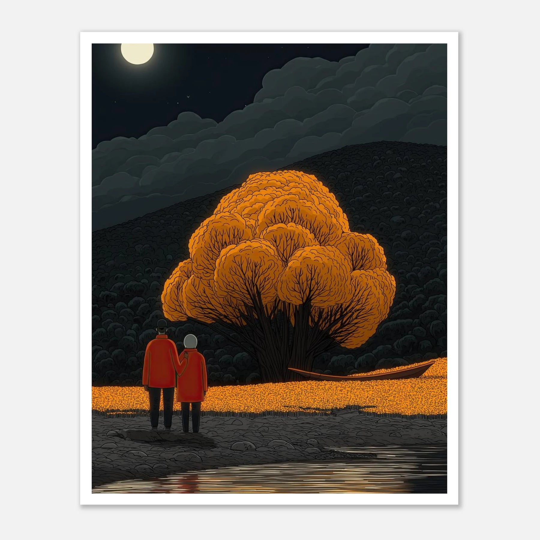 A couple stands on a rocky shore, arm in arm, gazing at a breathtakingly vibrant orange tree across a still, reflecting pool. The dark, cloudy sky and bright full moon perfectly balance the brilliant warmth of the illuminated foliage.