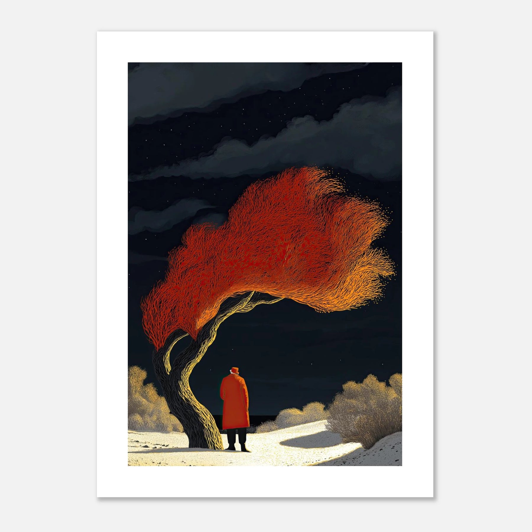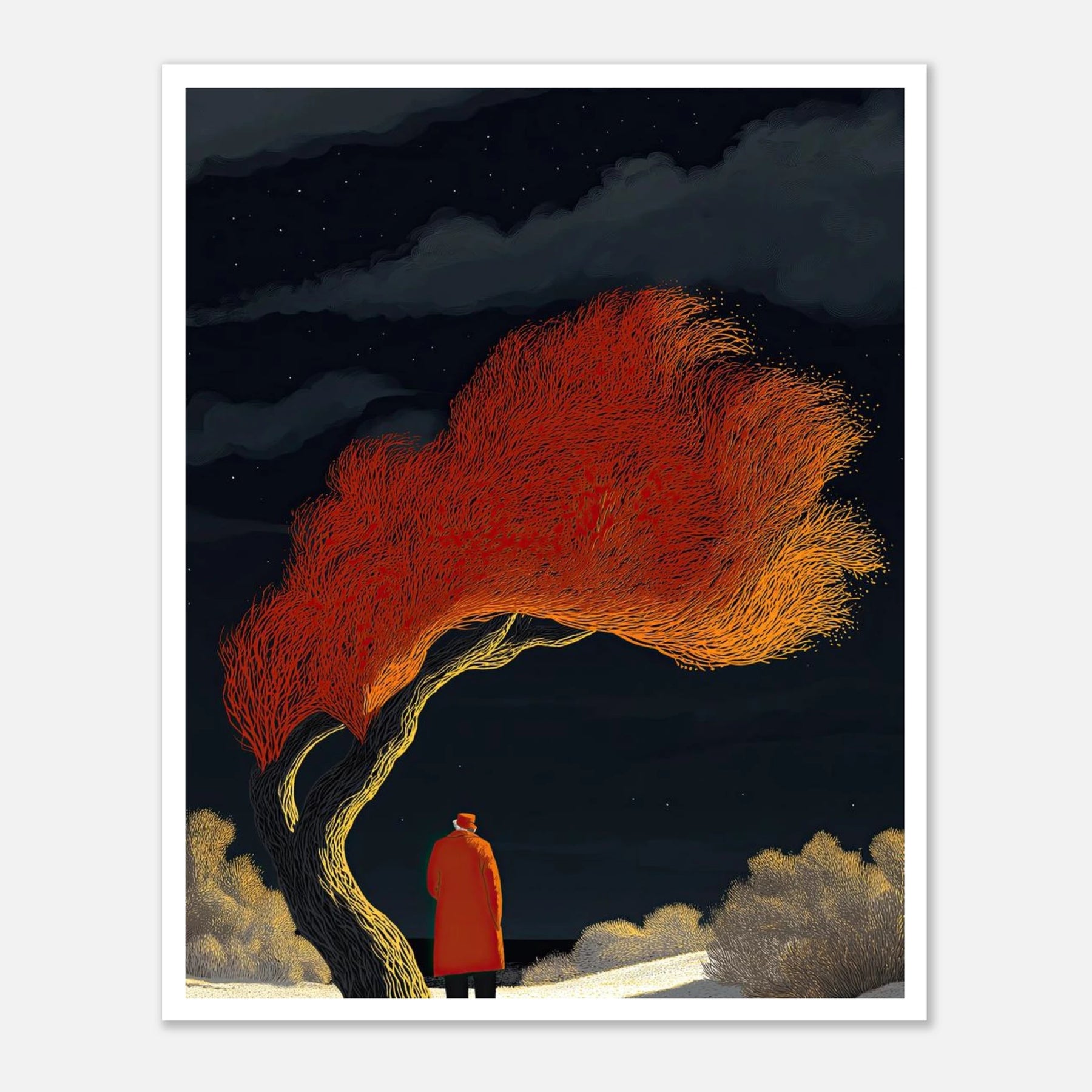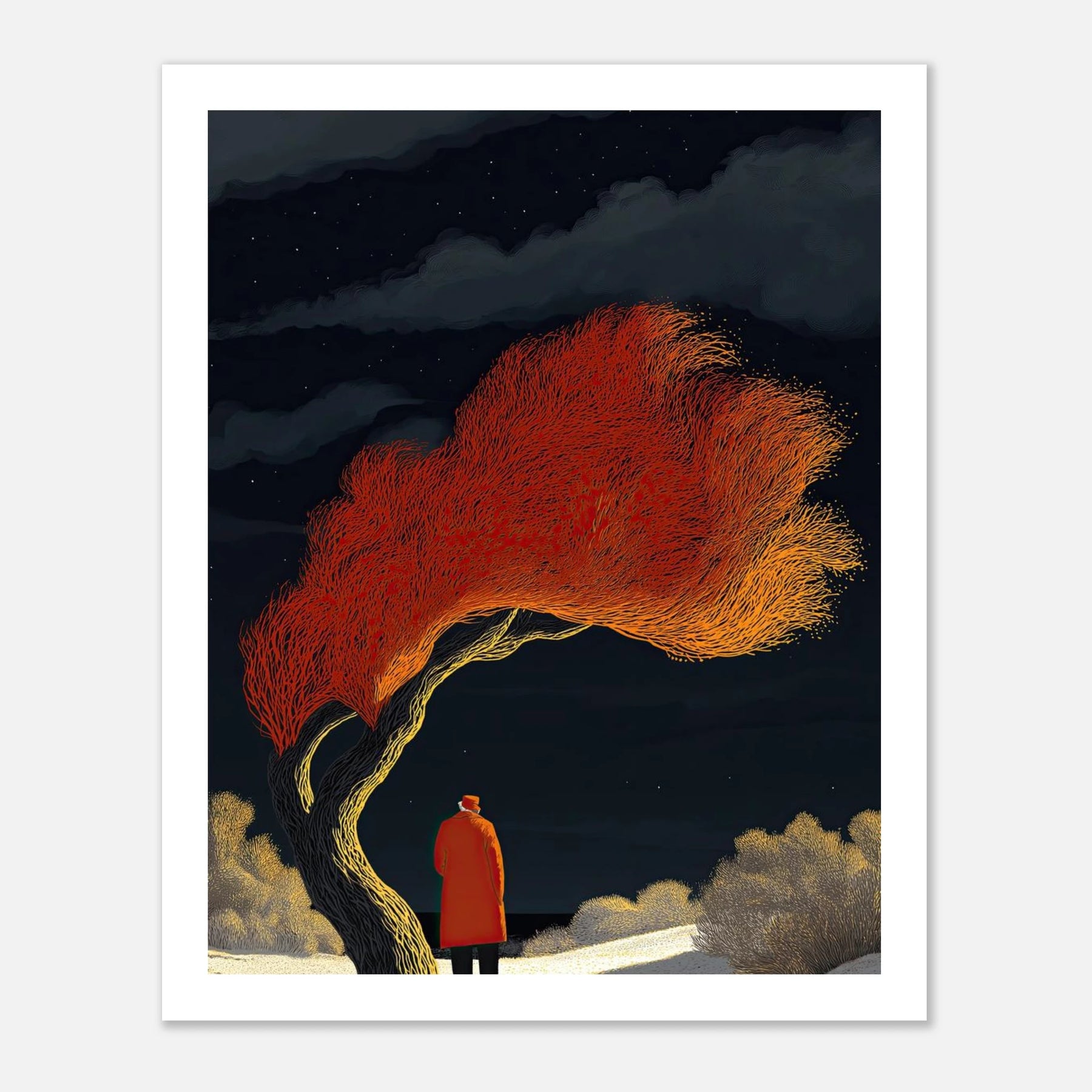 The wind always blows the hardest when you stand apart from the crowd. The person in this art isn't running from the cold night; they are watching the tree hold onto its fire. This piece is about quiet confidence. It’s perfect for the wall of anyone who knows that true inner peace means letting the world spin around you while you stay completely grounded.