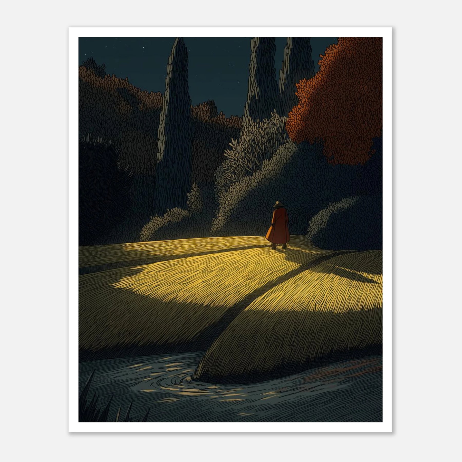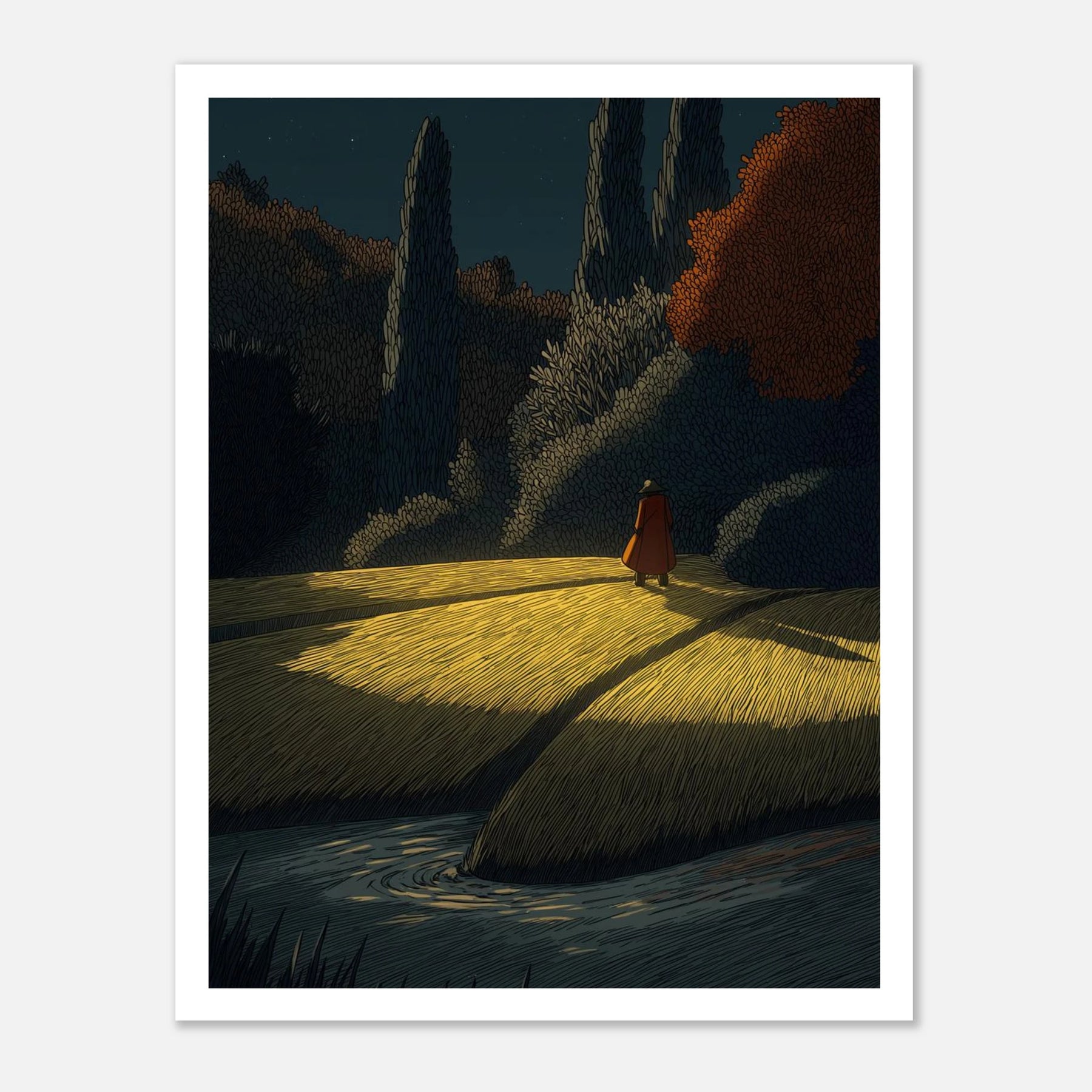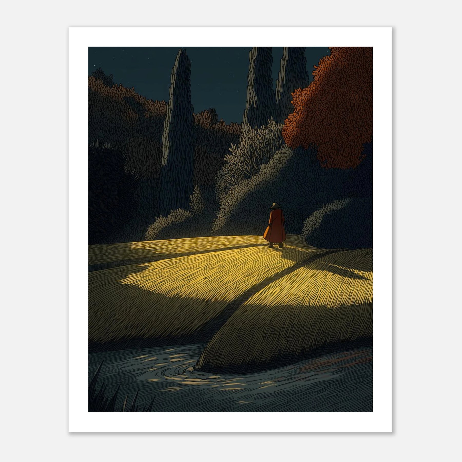 Sometimes you have to stand at the edge of the dark woods to appreciate the light. This poster captures a quiet moment by the river, serving as a reminder that you don't have to cross every boundary right away. Finding your own peace exactly where you are is enough.