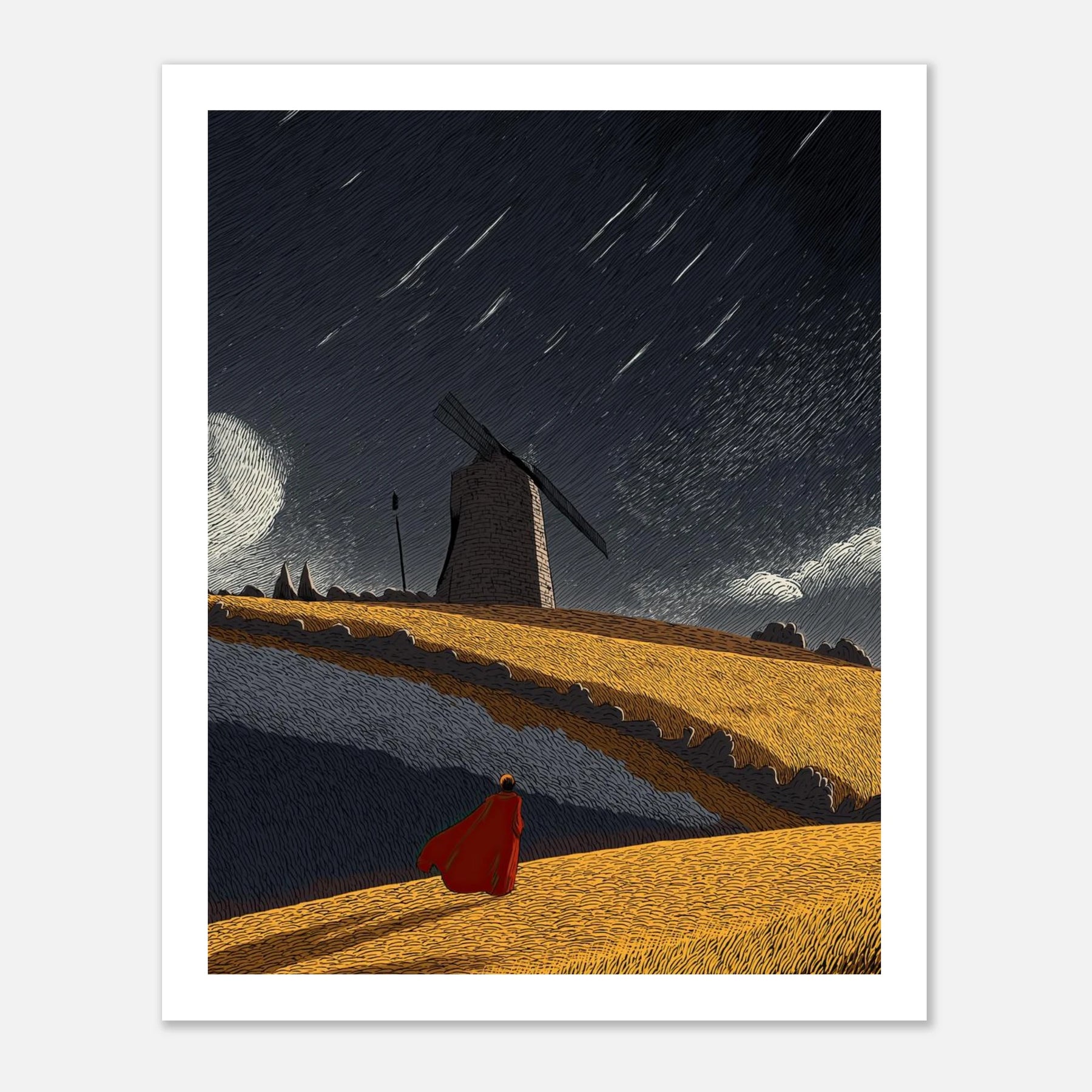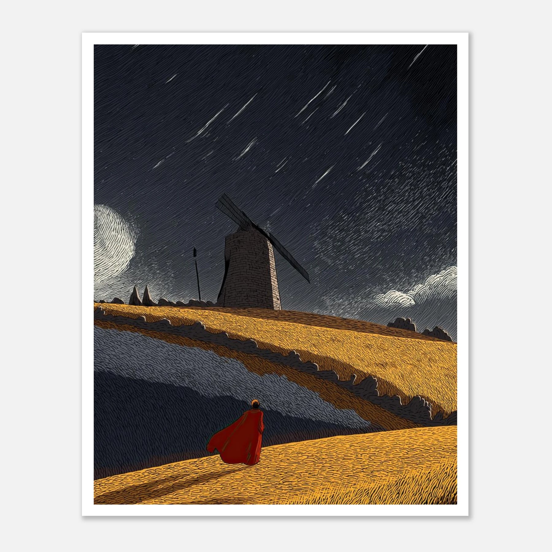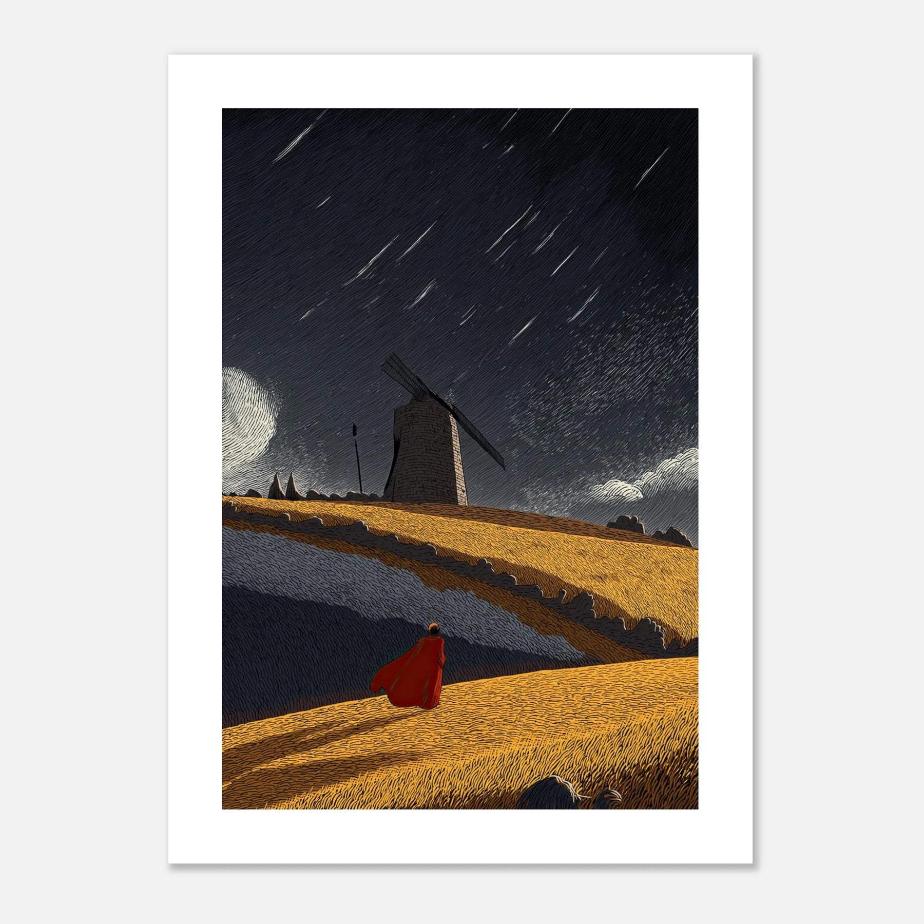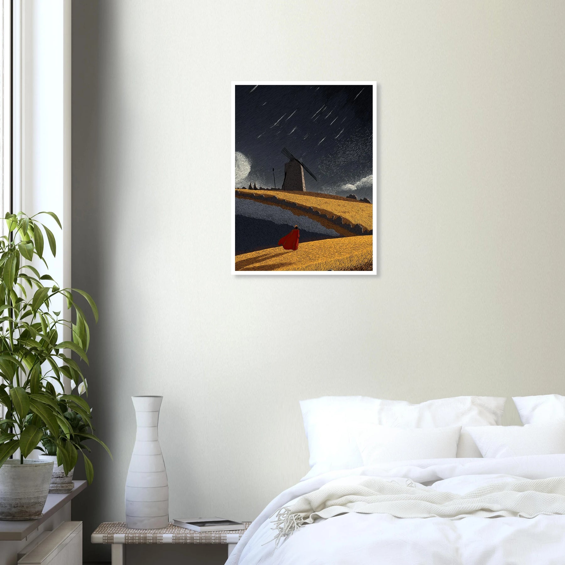 A lone walk through golden fields under a shower of falling stars. This artwork is for anyone brave enough to walk their own path, even when the sky is dark. Let this poster be a daily reminder to trust your own journey and keep moving forward, no matter how far away your destination seems.