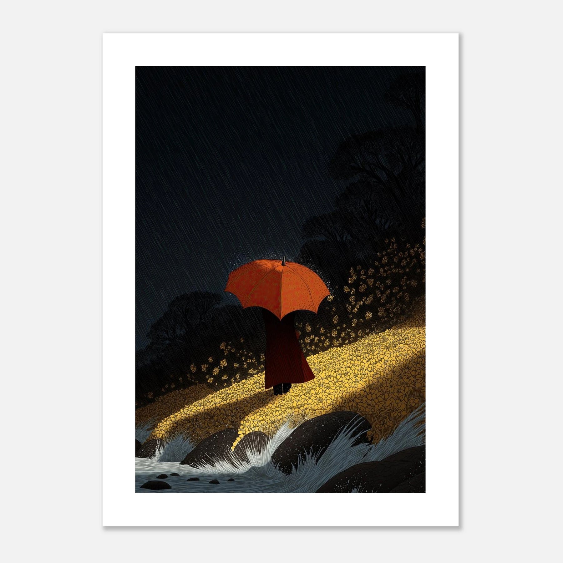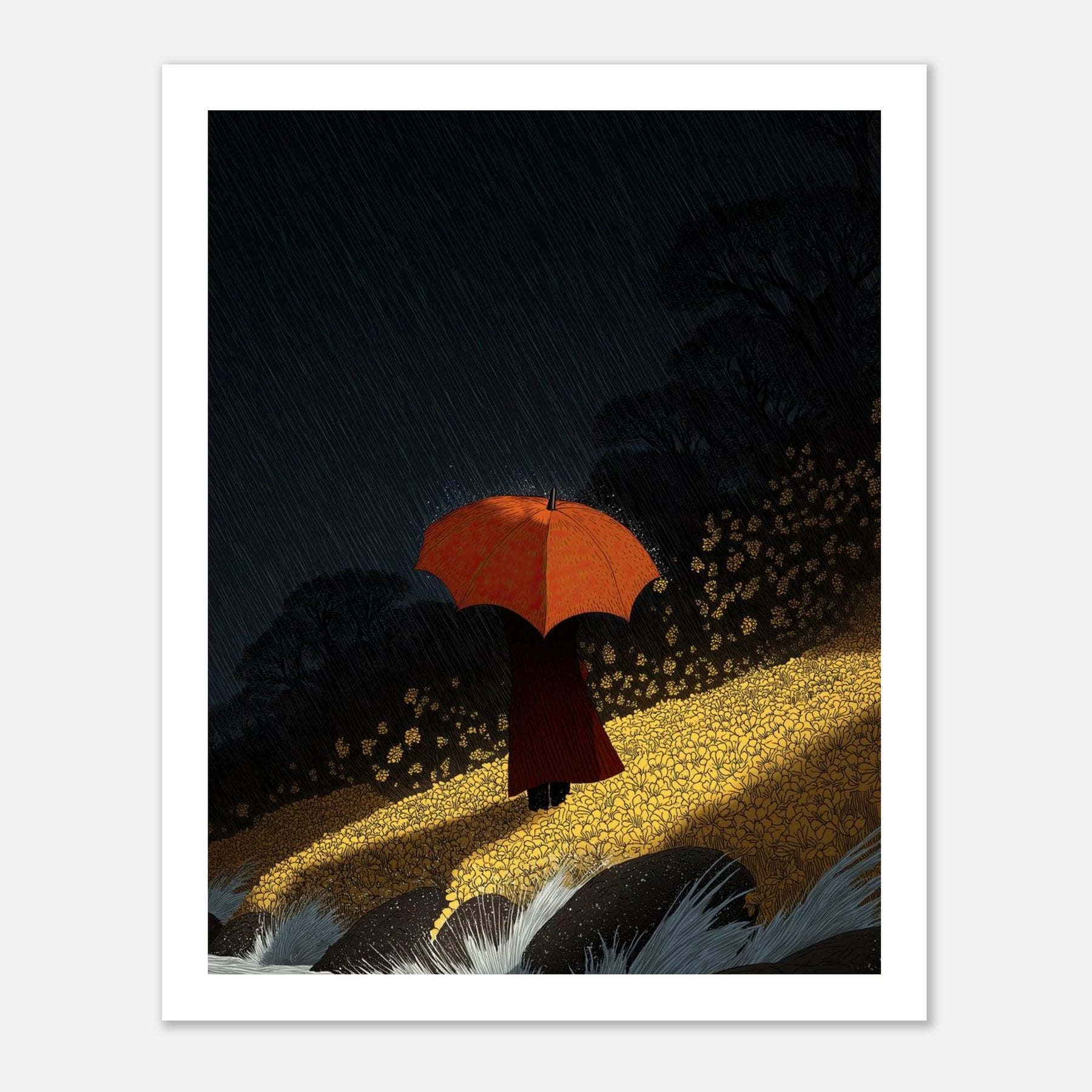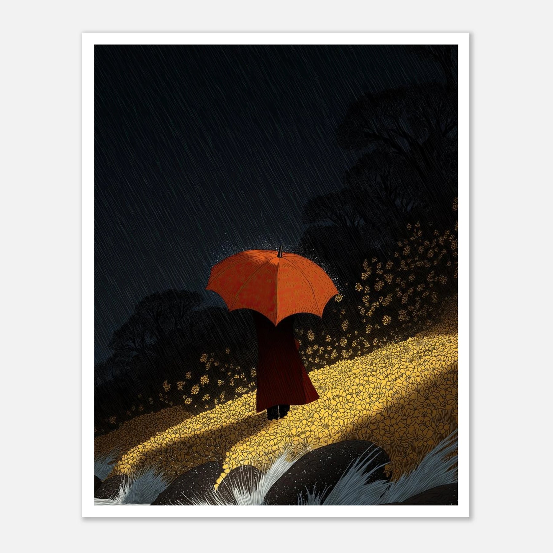 A solitary figure holding a vibrant orange umbrella stands on a glowing yellow embankment, facing turbulent, crashing waves under a heavy night rain. The stark contrast between the moody, dark sky and the brilliantly illuminated foreground makes this a visually arresting piece.