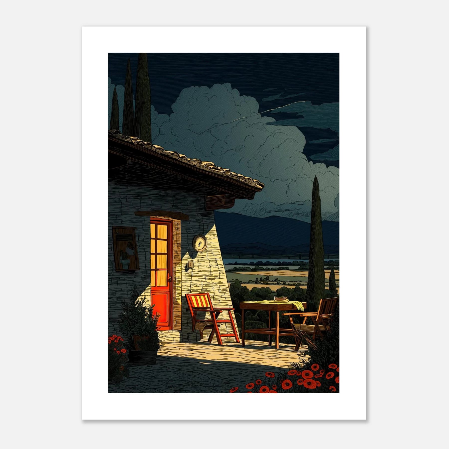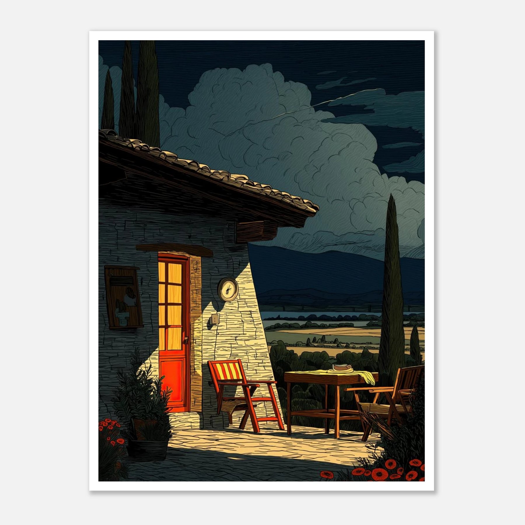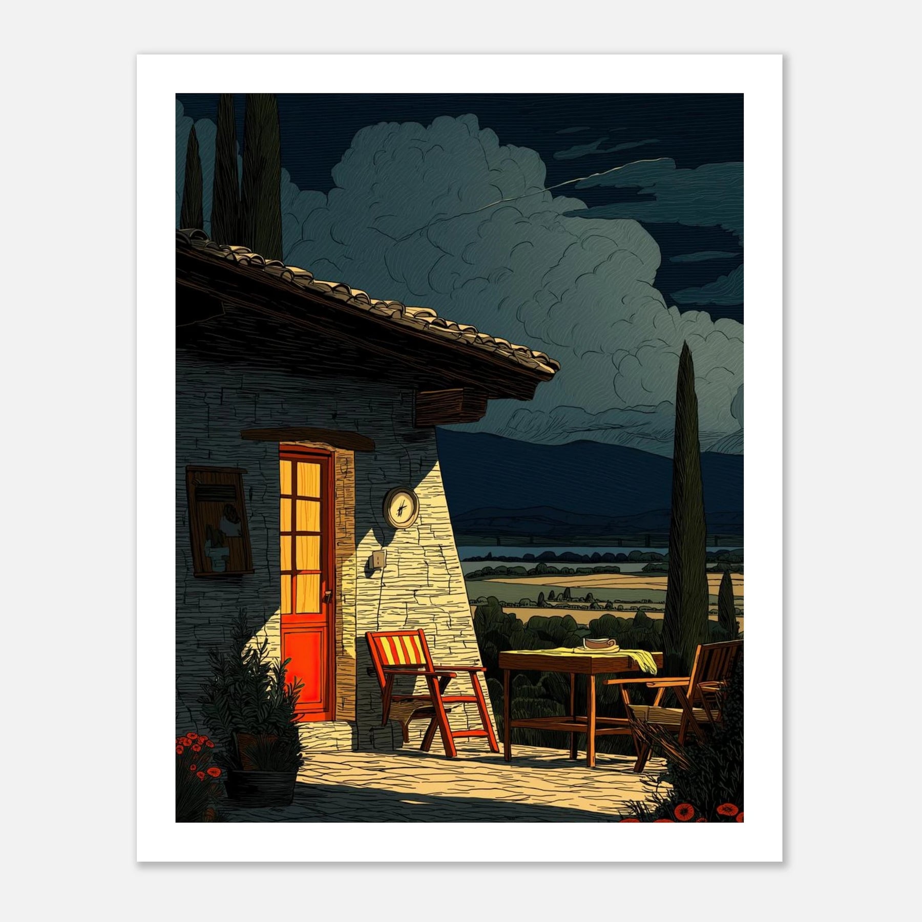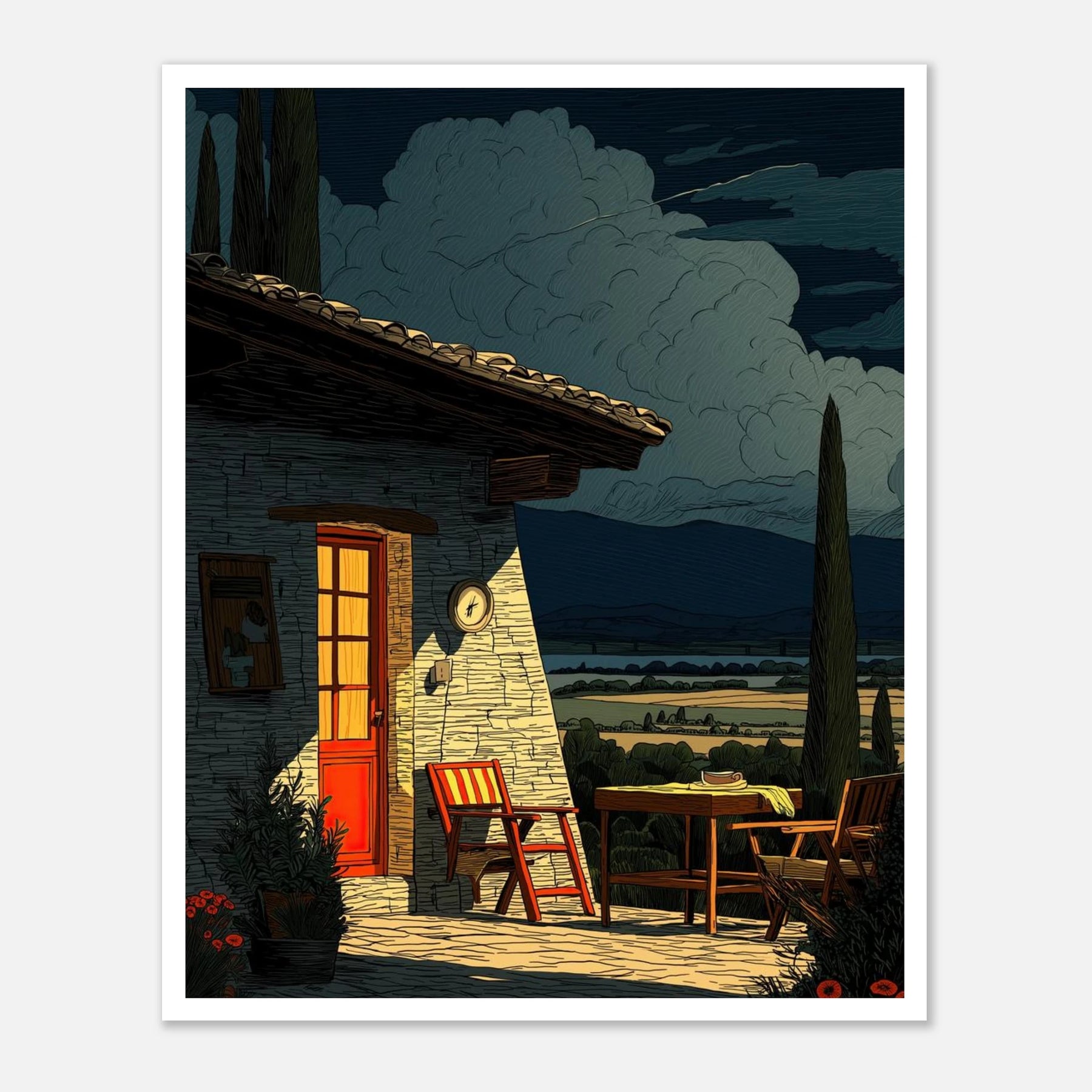 Two empty chairs wait outside a stone house with a bright red door, overlooking a wide valley. It brings a feeling of complete relaxation and simple living right into your home.