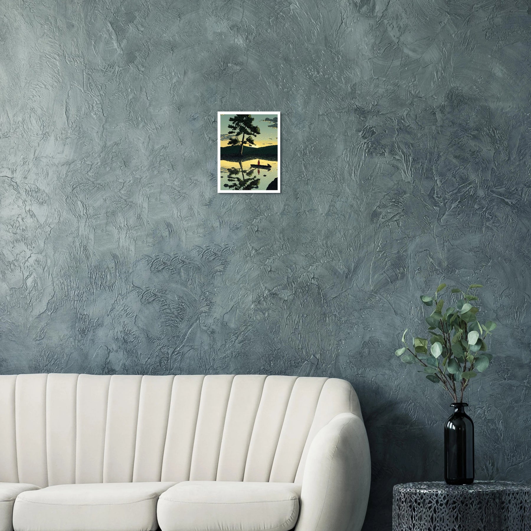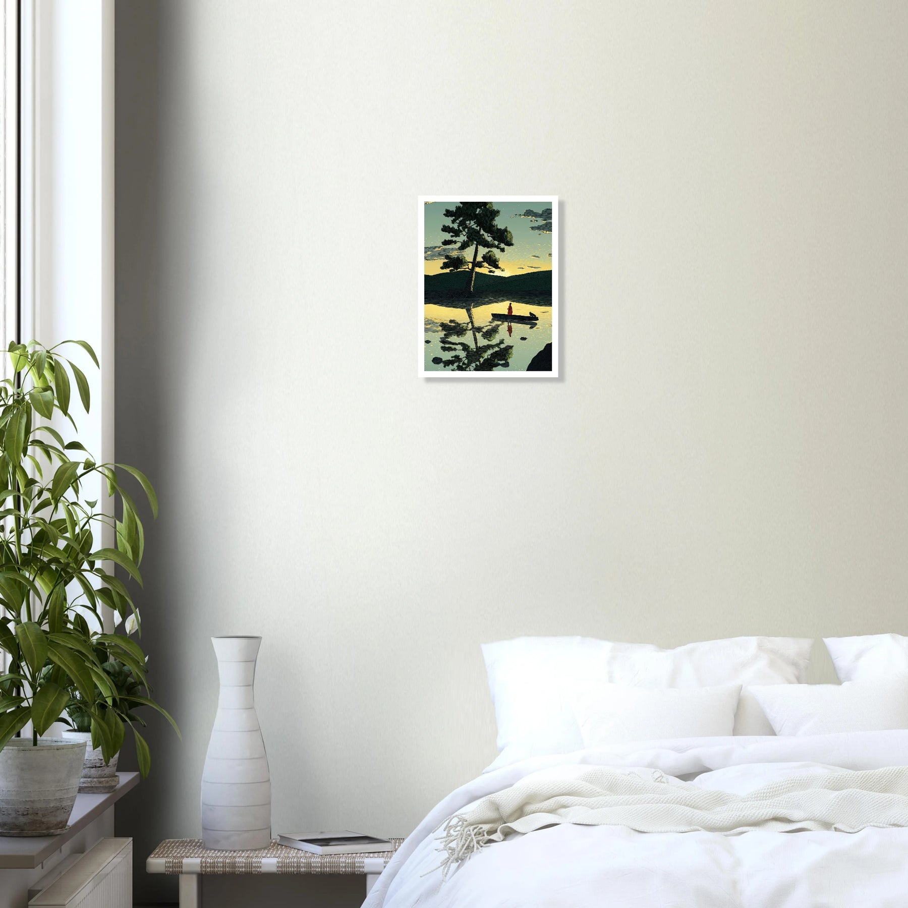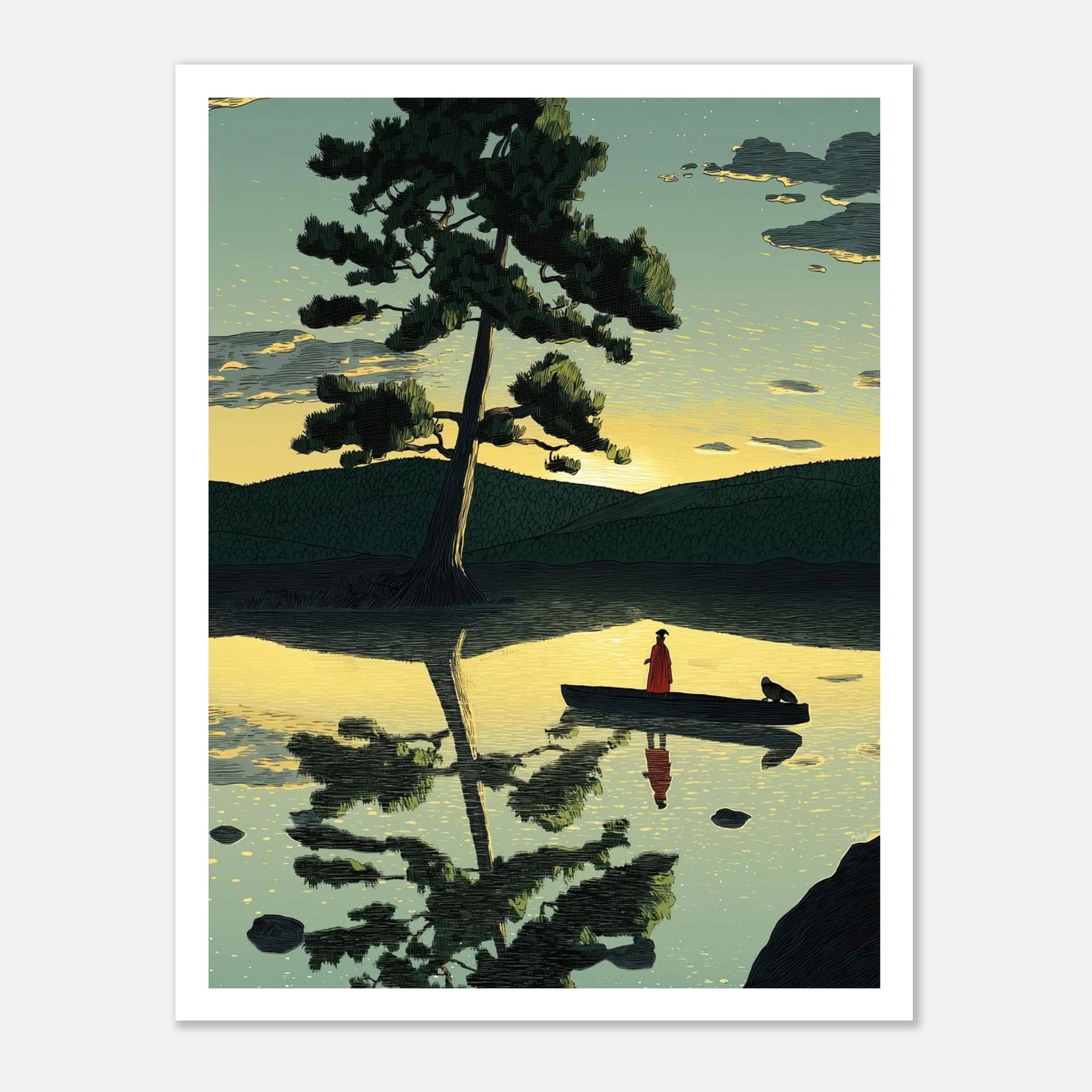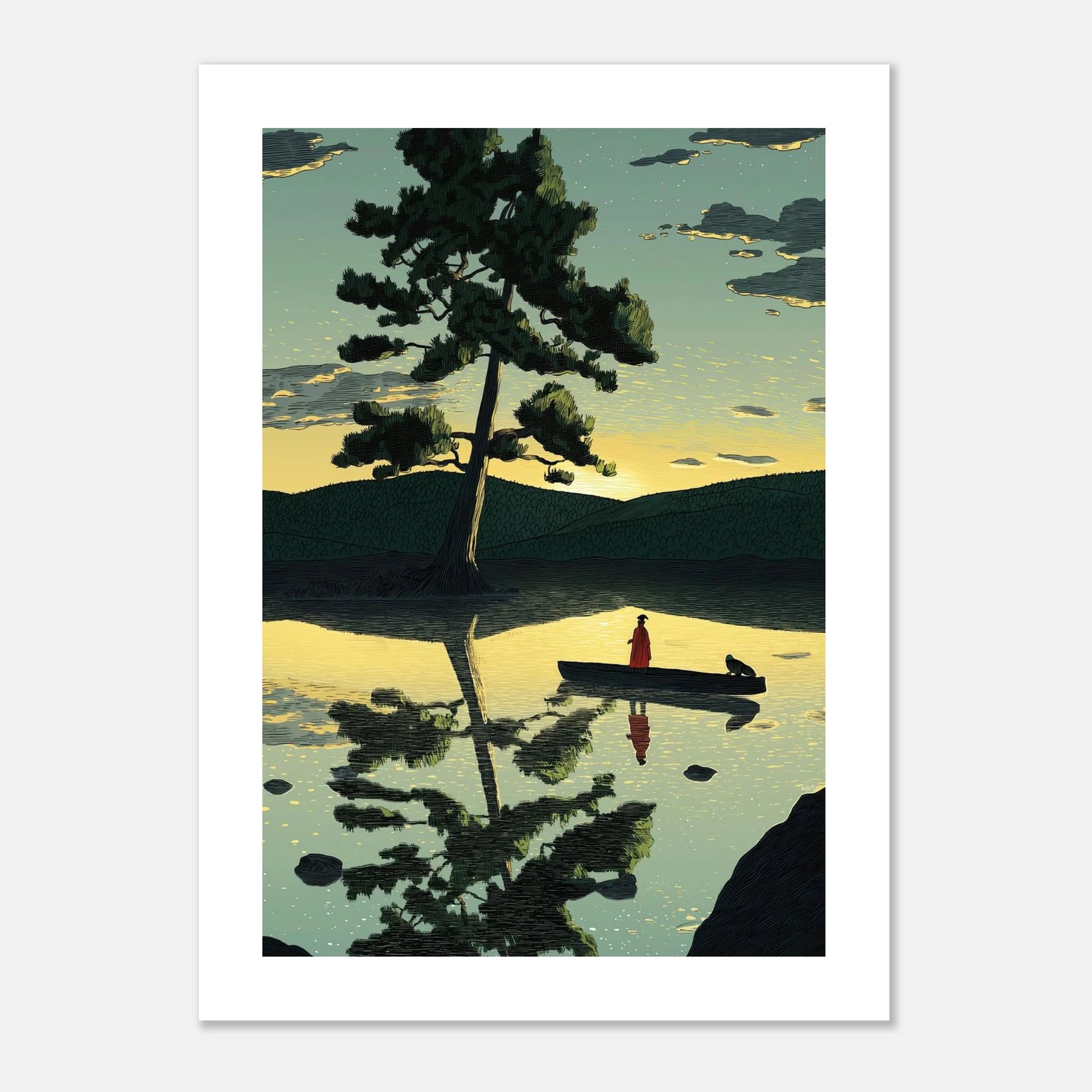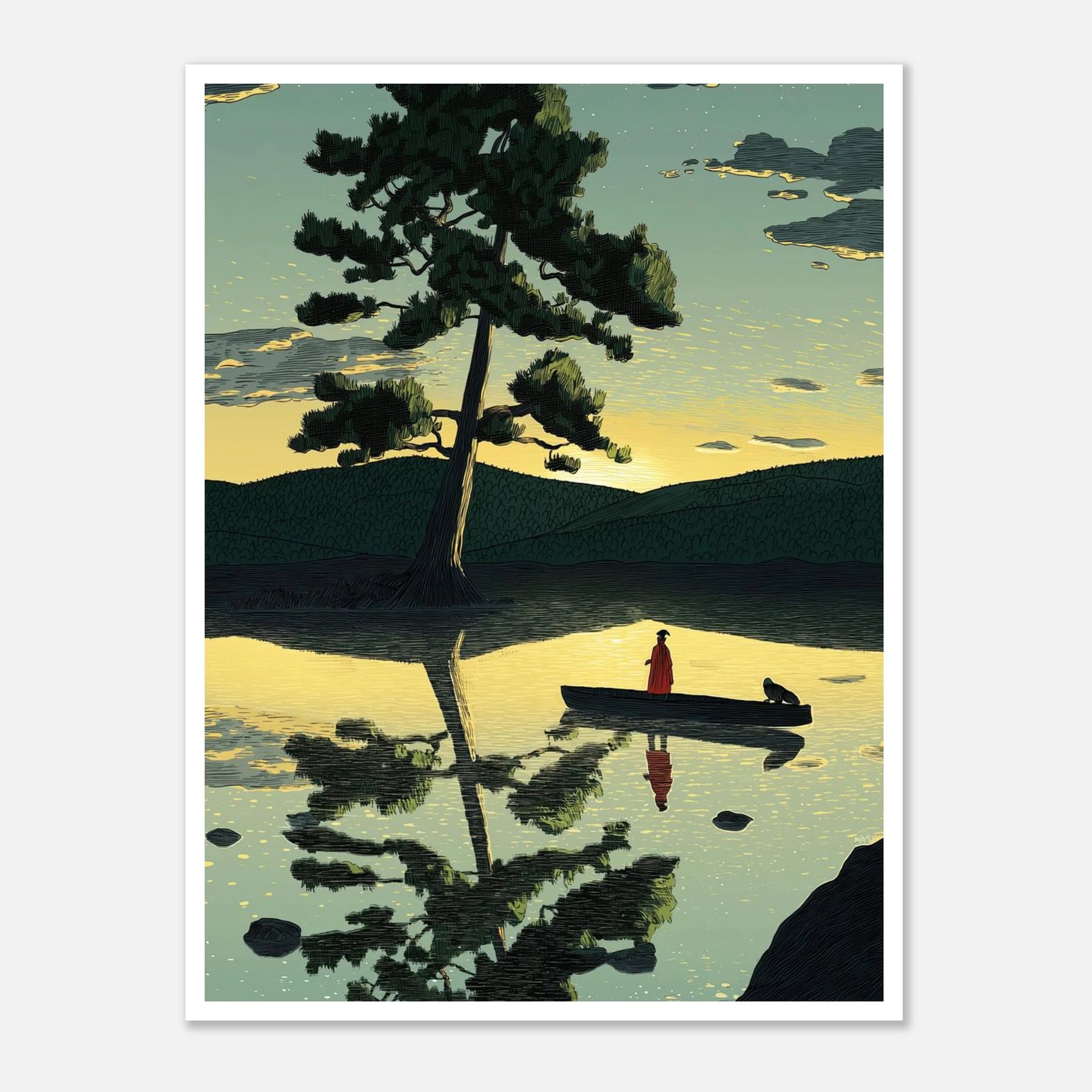 A lone traveler and their companion float on a calm, golden lake beneath a towering pine tree. This high-contrast illustration masterfully captures the perfect reflection on the water, symbolizing the delicate balance between our inner and outer worlds. A beautiful, tranquil statement piece that brings a profound sense of inner peace to any room.