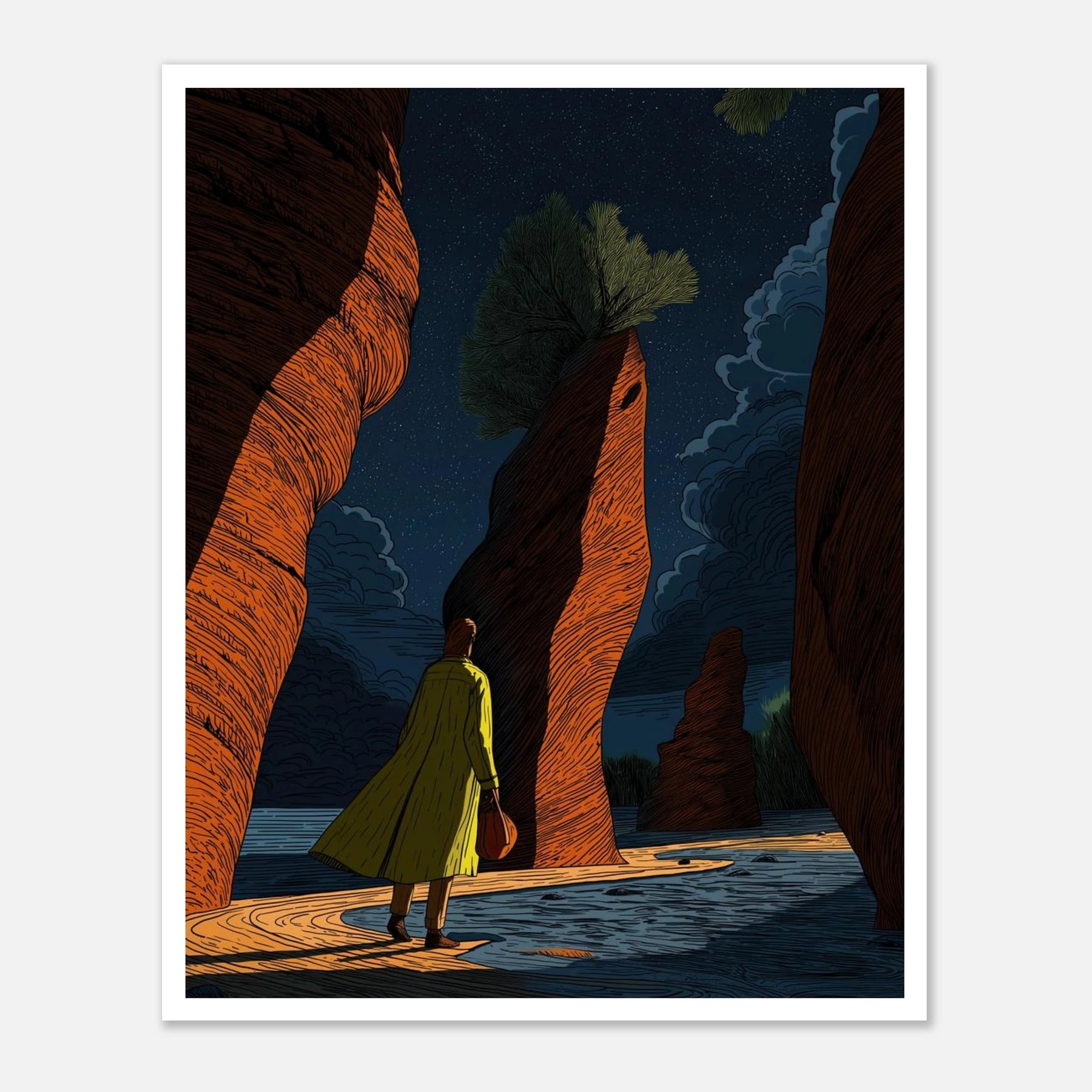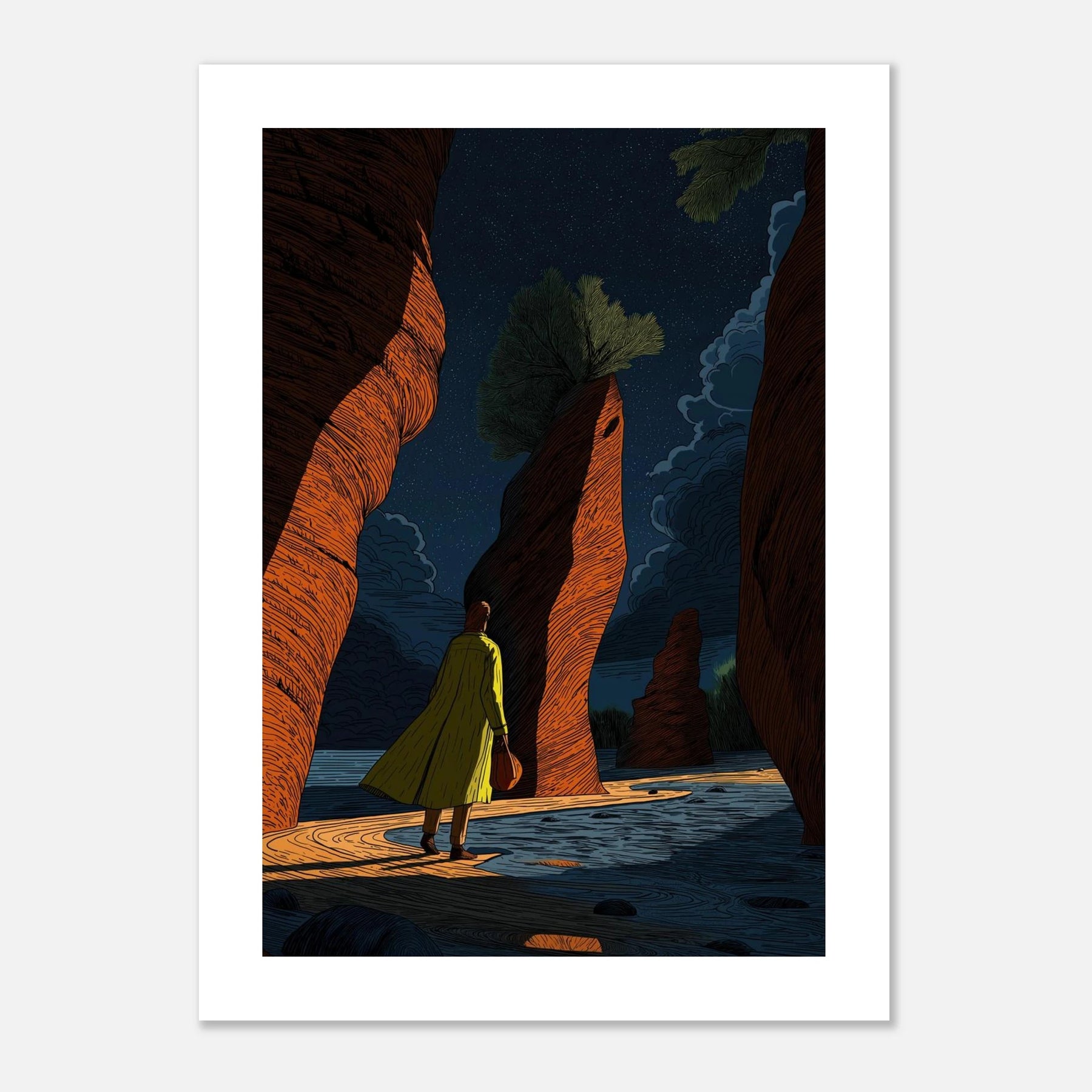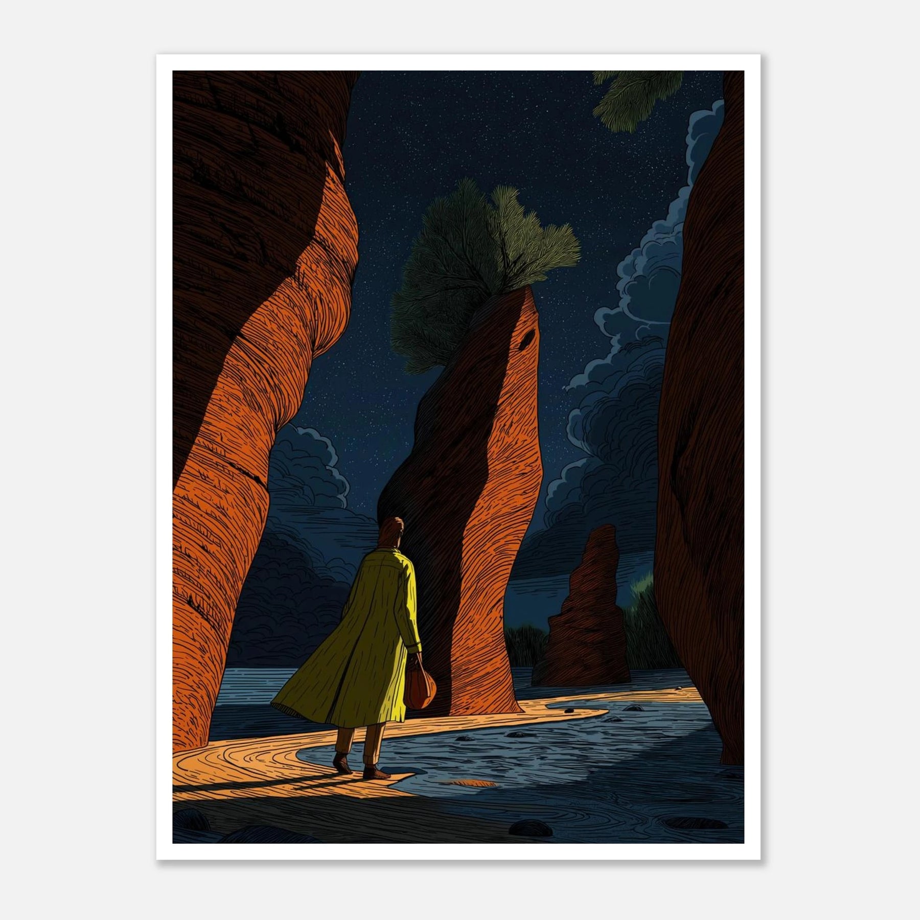 Featuring deep, rich tones and towering earthen walls under a starlit sky, this piece illustrates the journey of self-actualization. It speaks to the quiet confidence required to navigate life's narrow passages. Hang this print as a reminder to move forward with purpose, trusting your direction while letting go of external judgment.