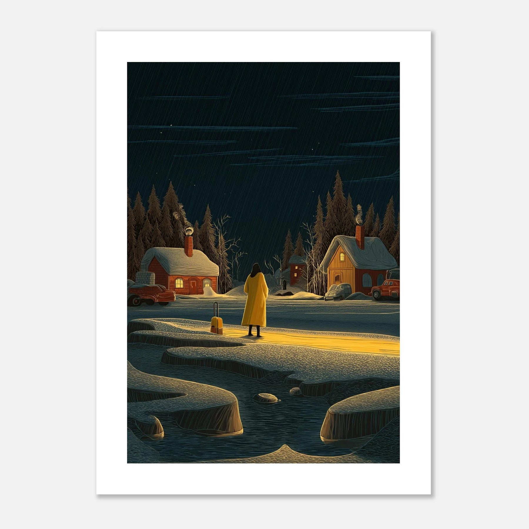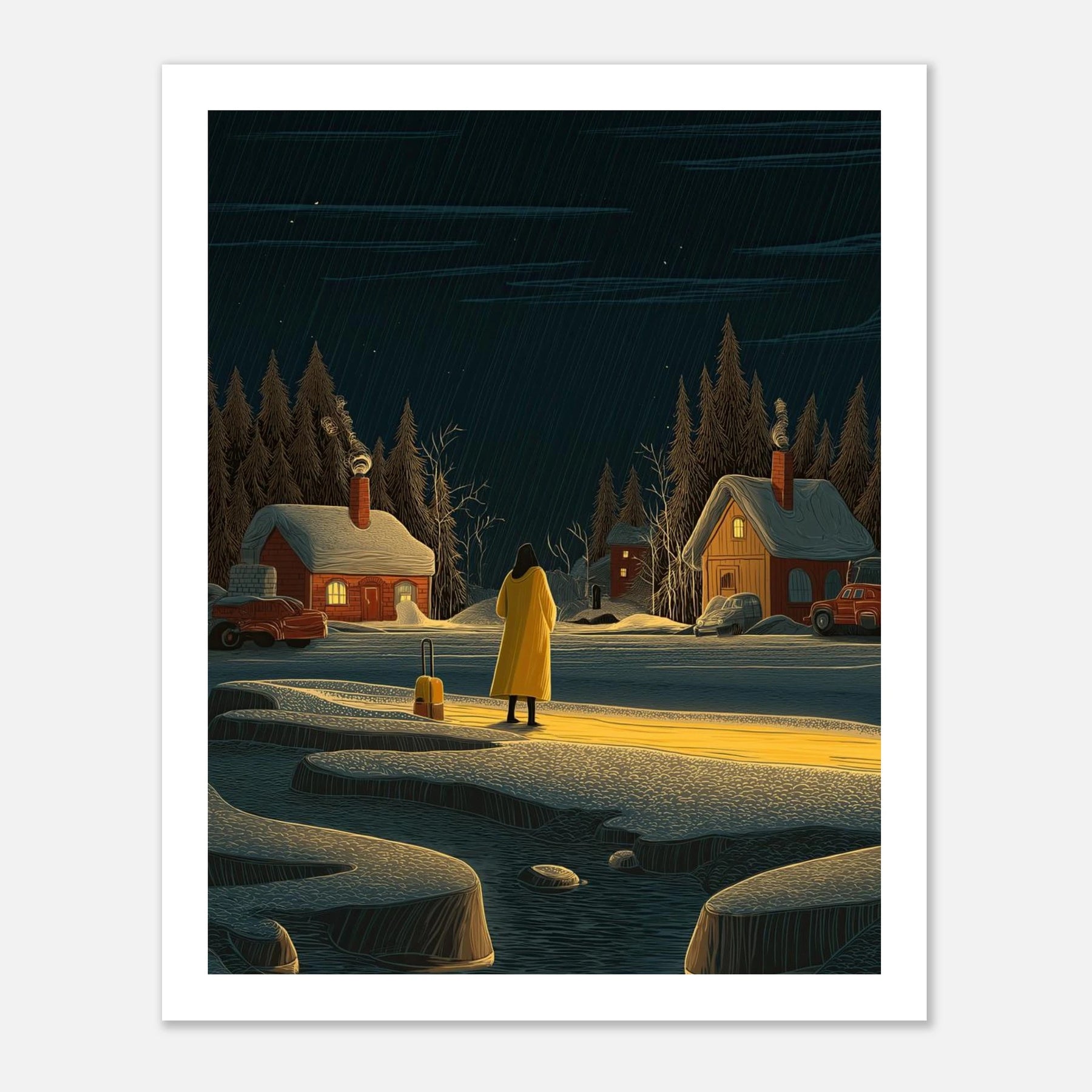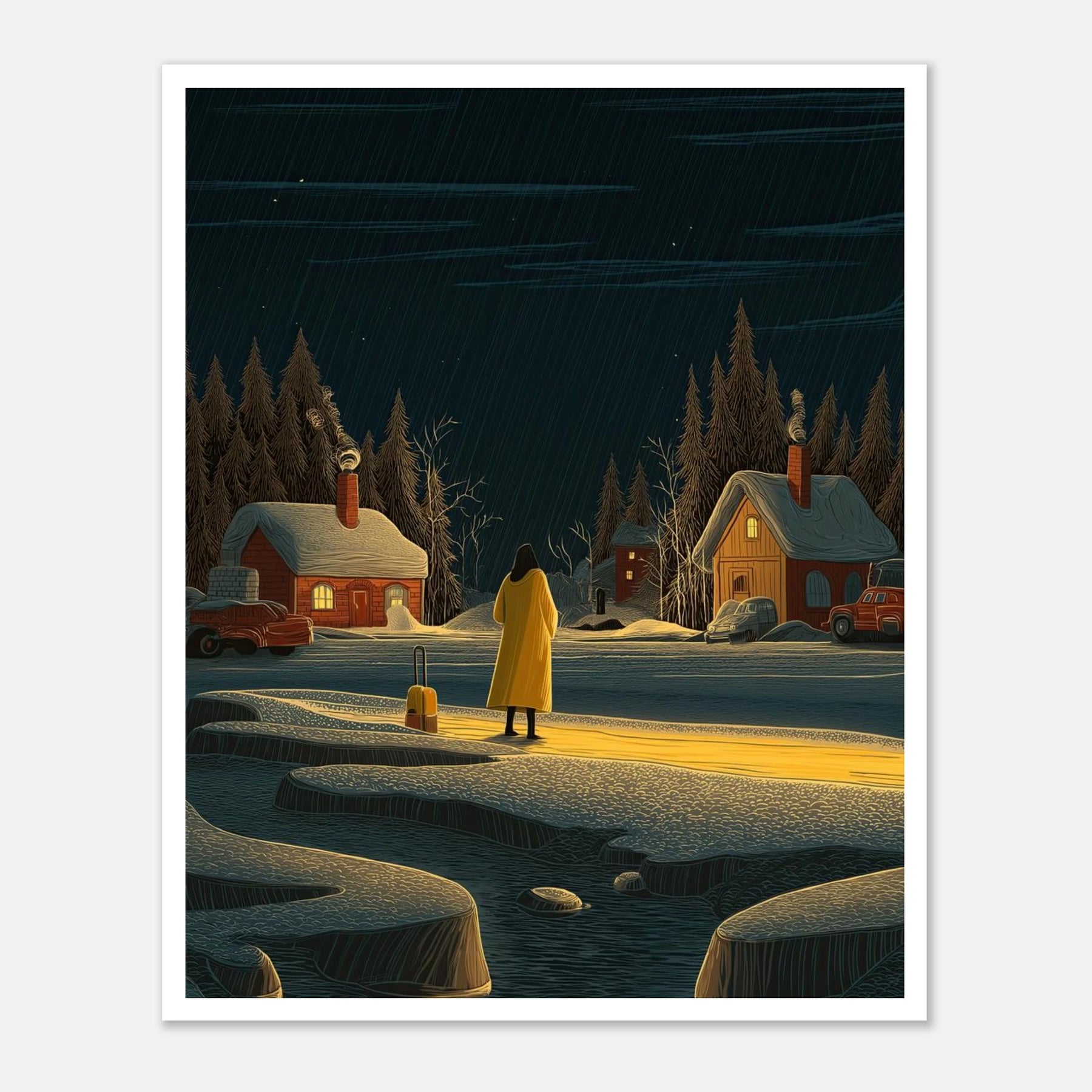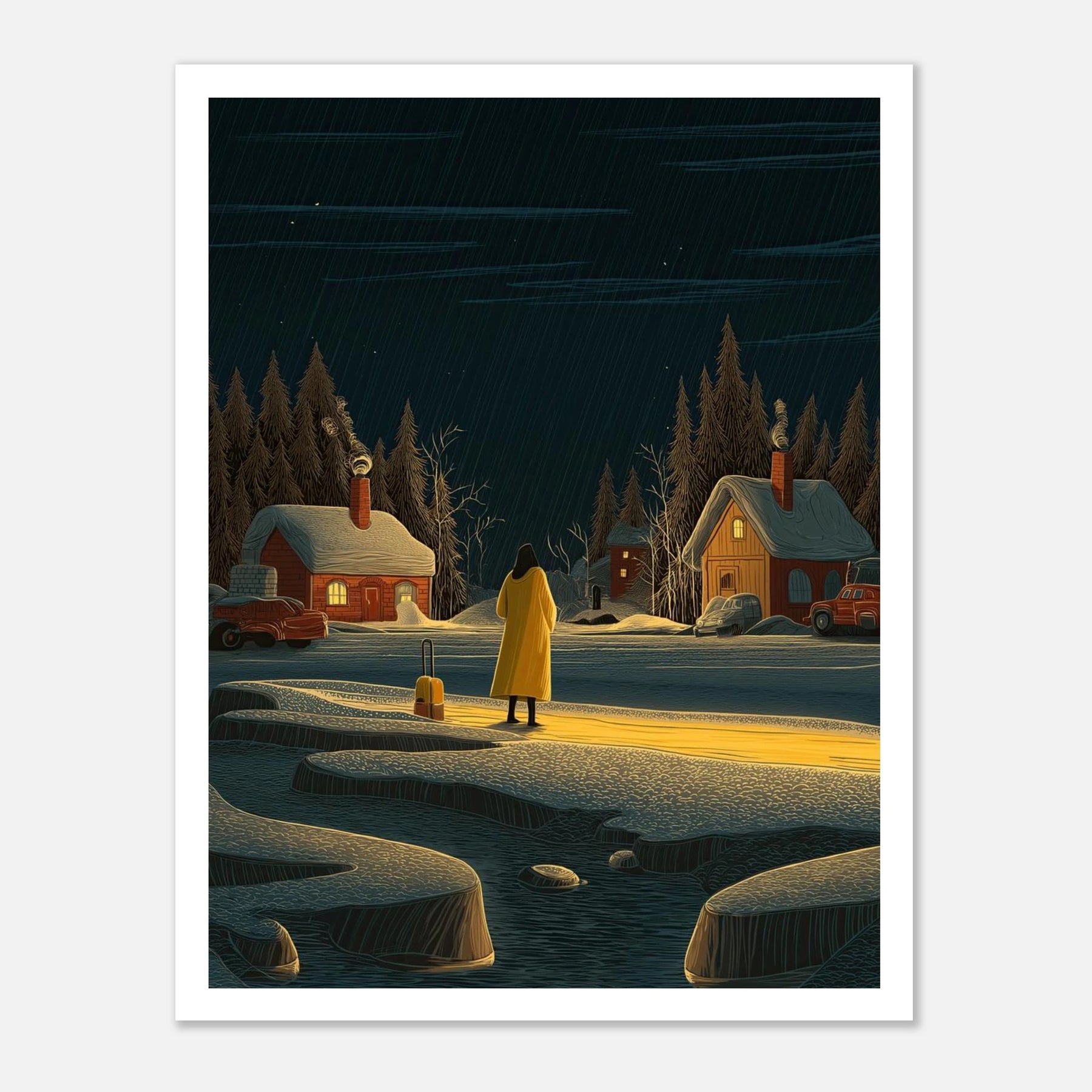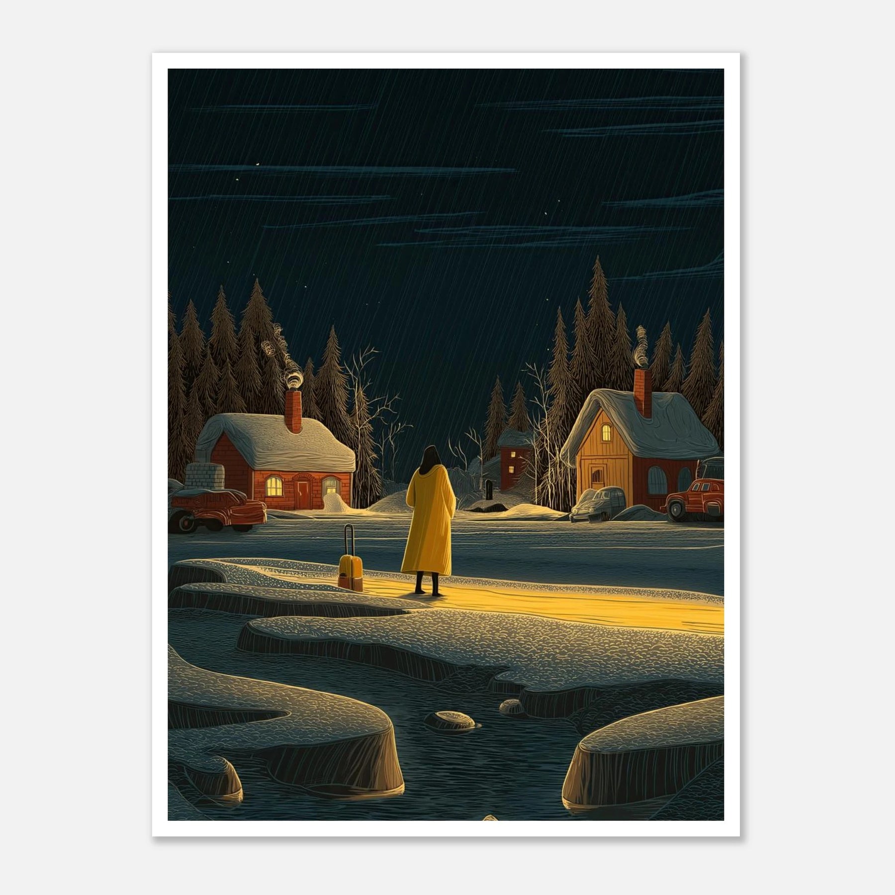 Sometimes the longest journeys lead us to the quietest places. This poster shows a lone traveler in a bright yellow coat, standing before a snowy village lit up against the dark night. It is a simple reminder that no matter how cold things get on the outside, there is always a place of warmth waiting for you to find it. Perfect for any room where you want to feel grounded and at peace.