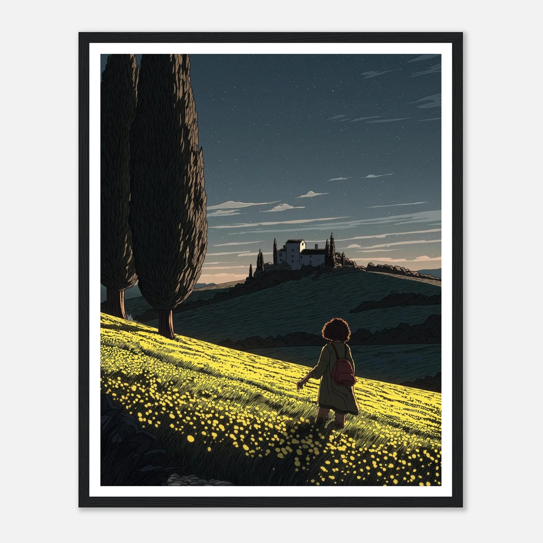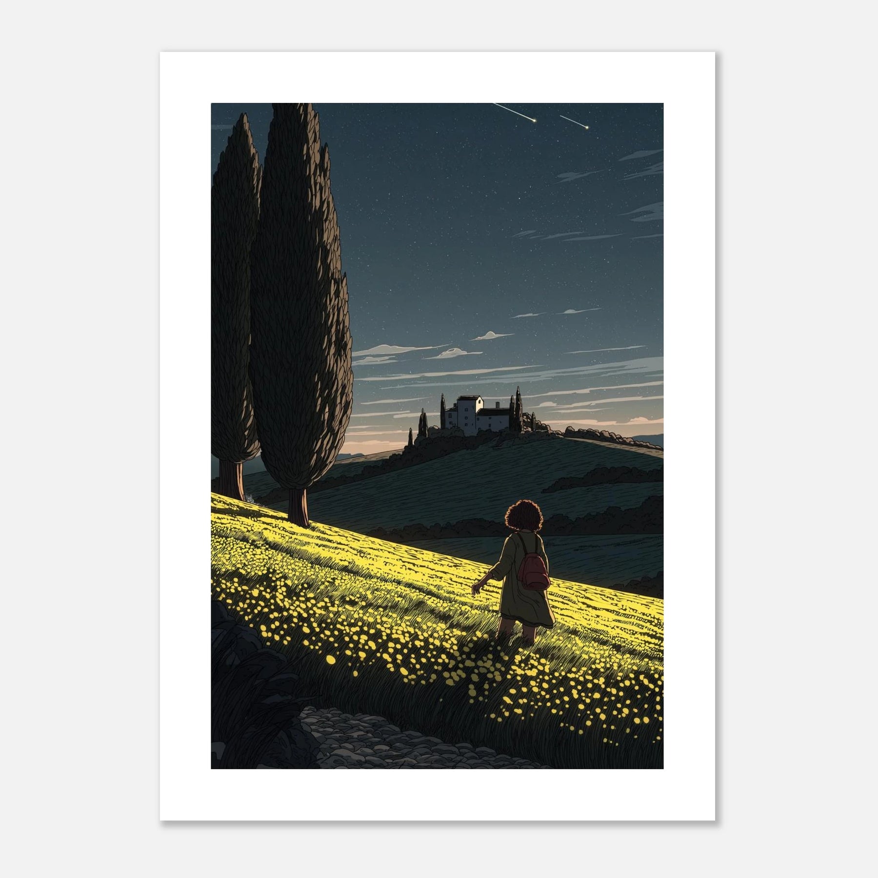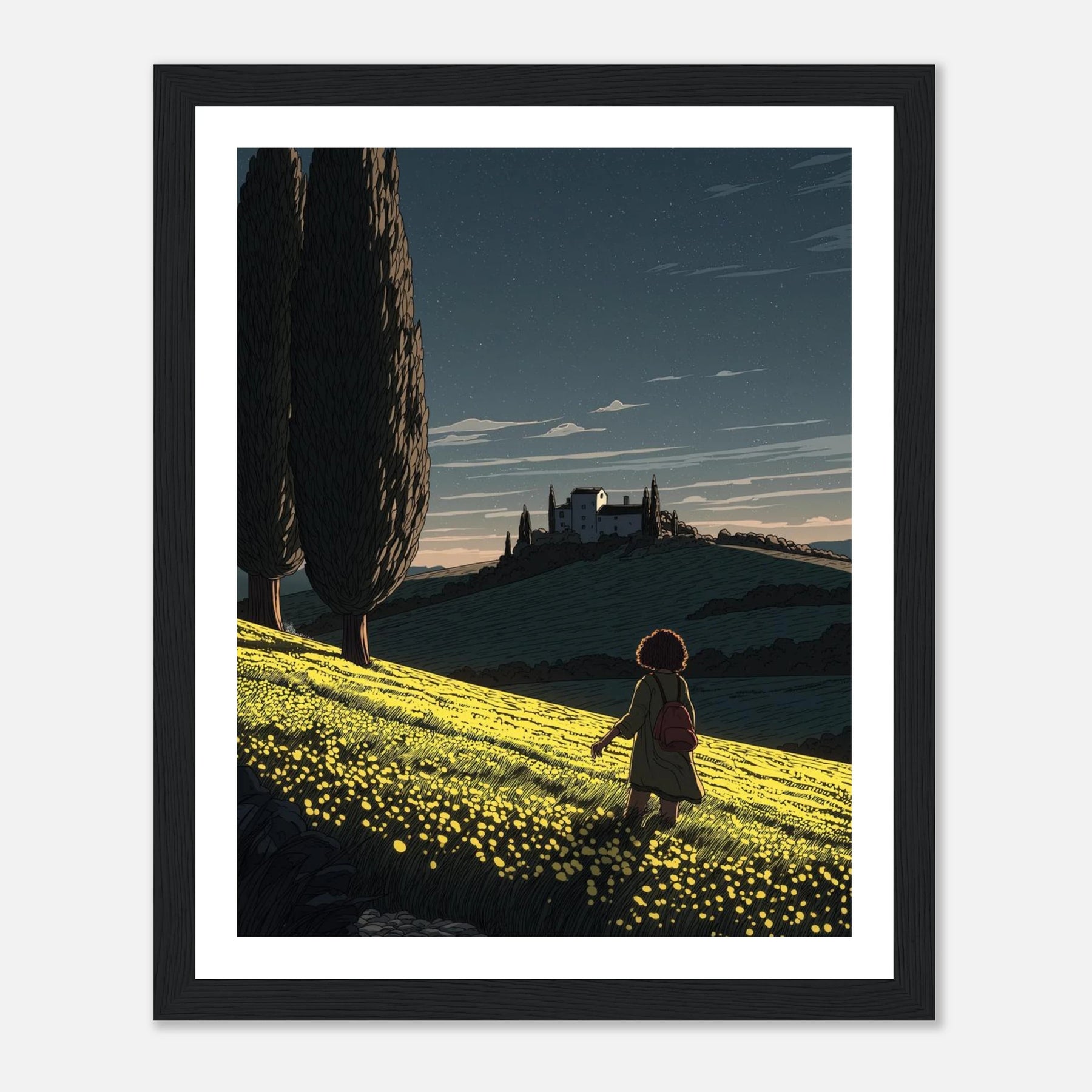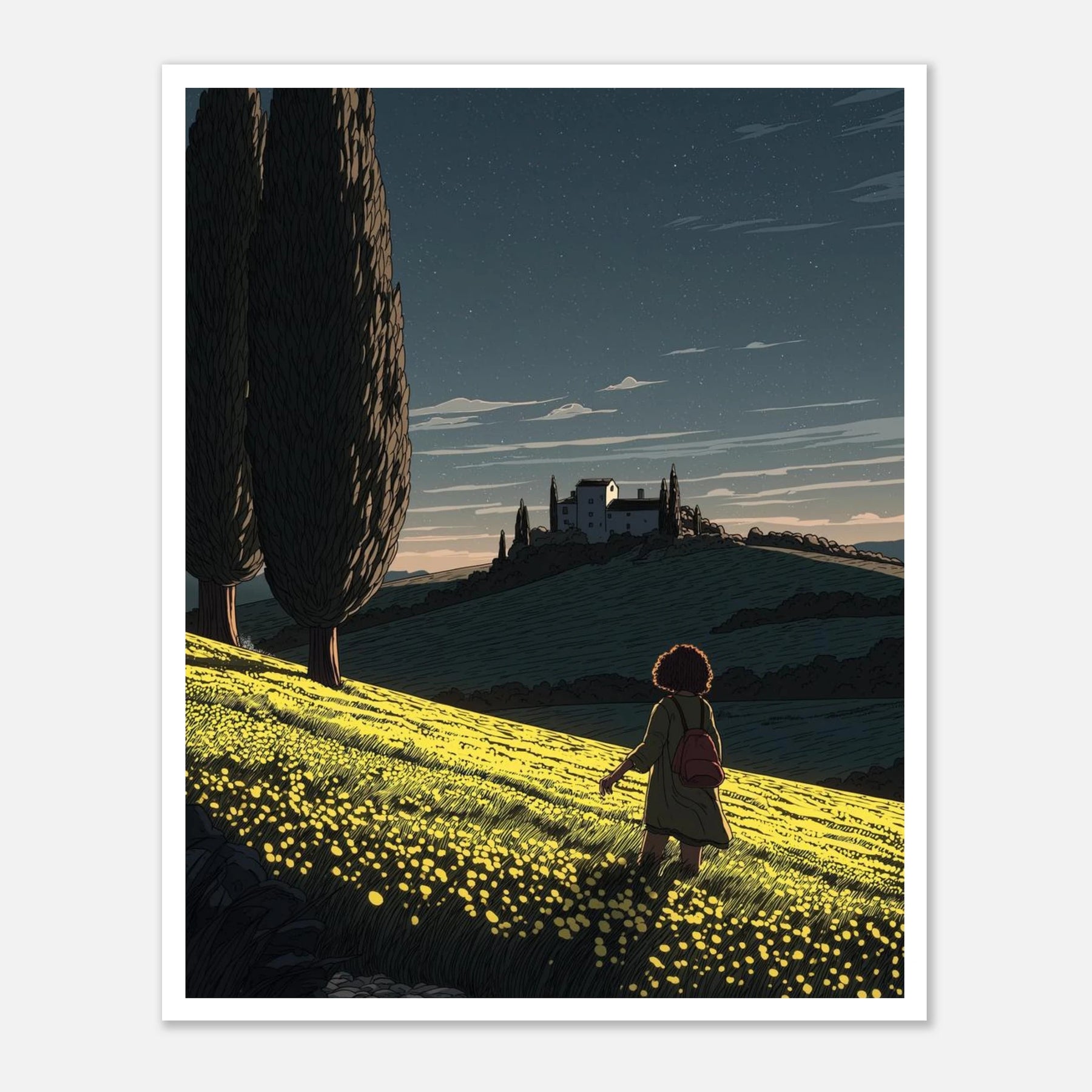 • Like a sunflower turning toward the light, true self-actualization comes from seeking out the good. This vibrant, deeply textured print features a lone wanderer pausing to take in a glowing field of yellow blooms under a twilight sky streaked with shooting stars. Hang this piece as a daily reminder to look for the light, trust your journey, and remain open to quiet moments of wonder.