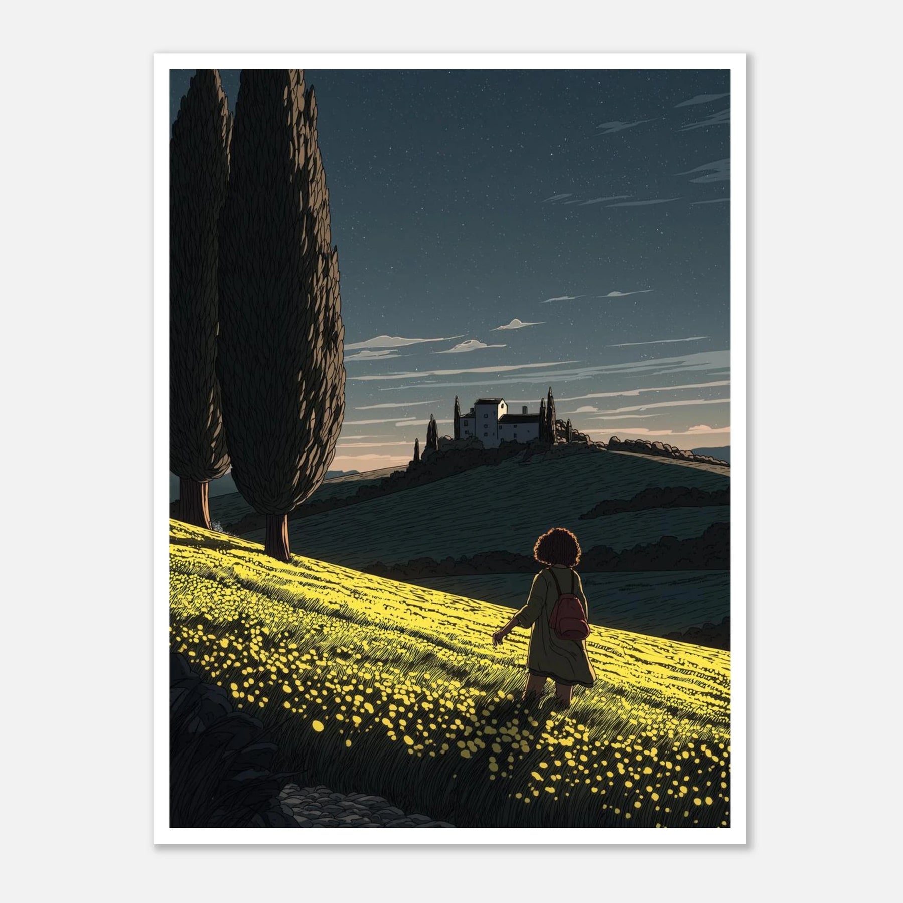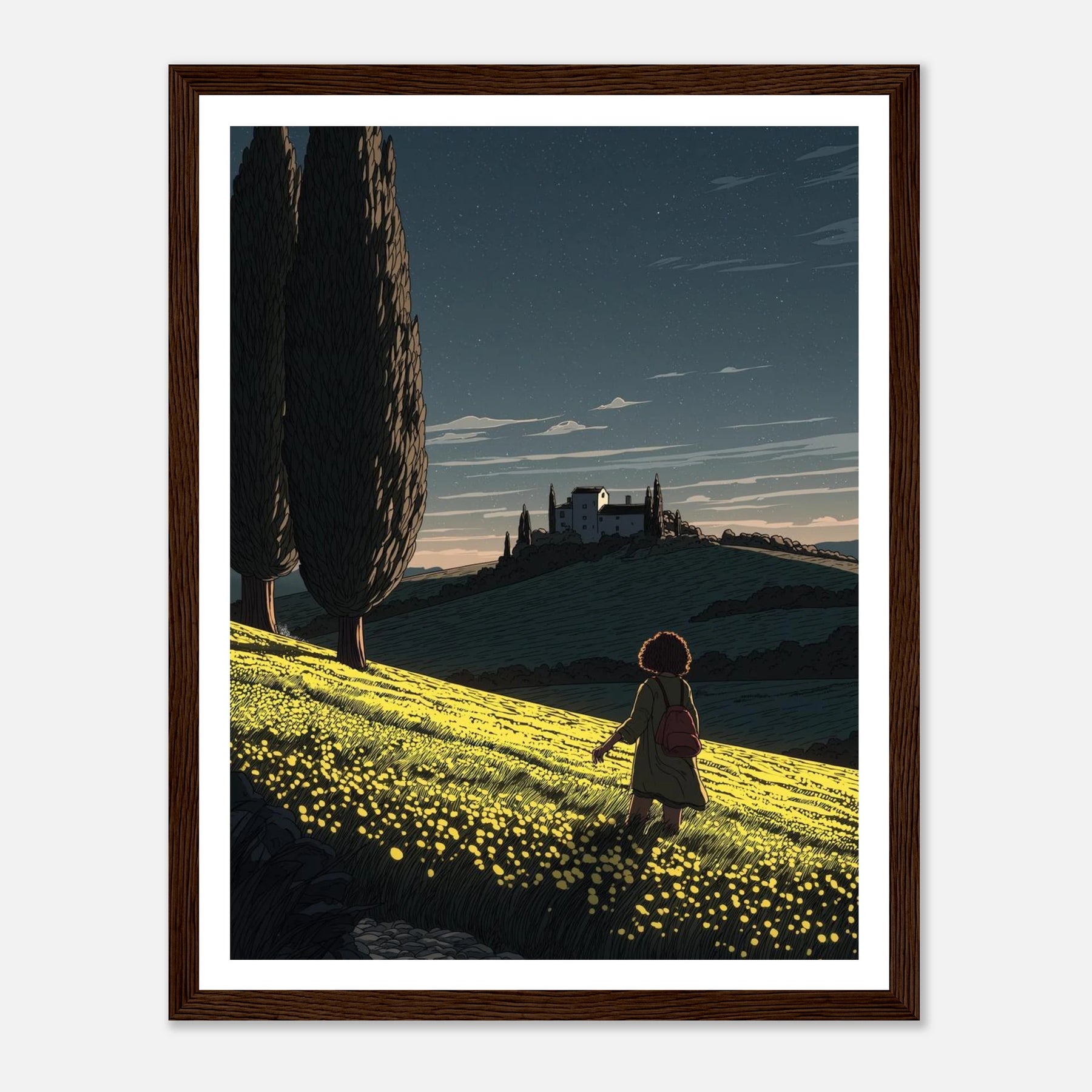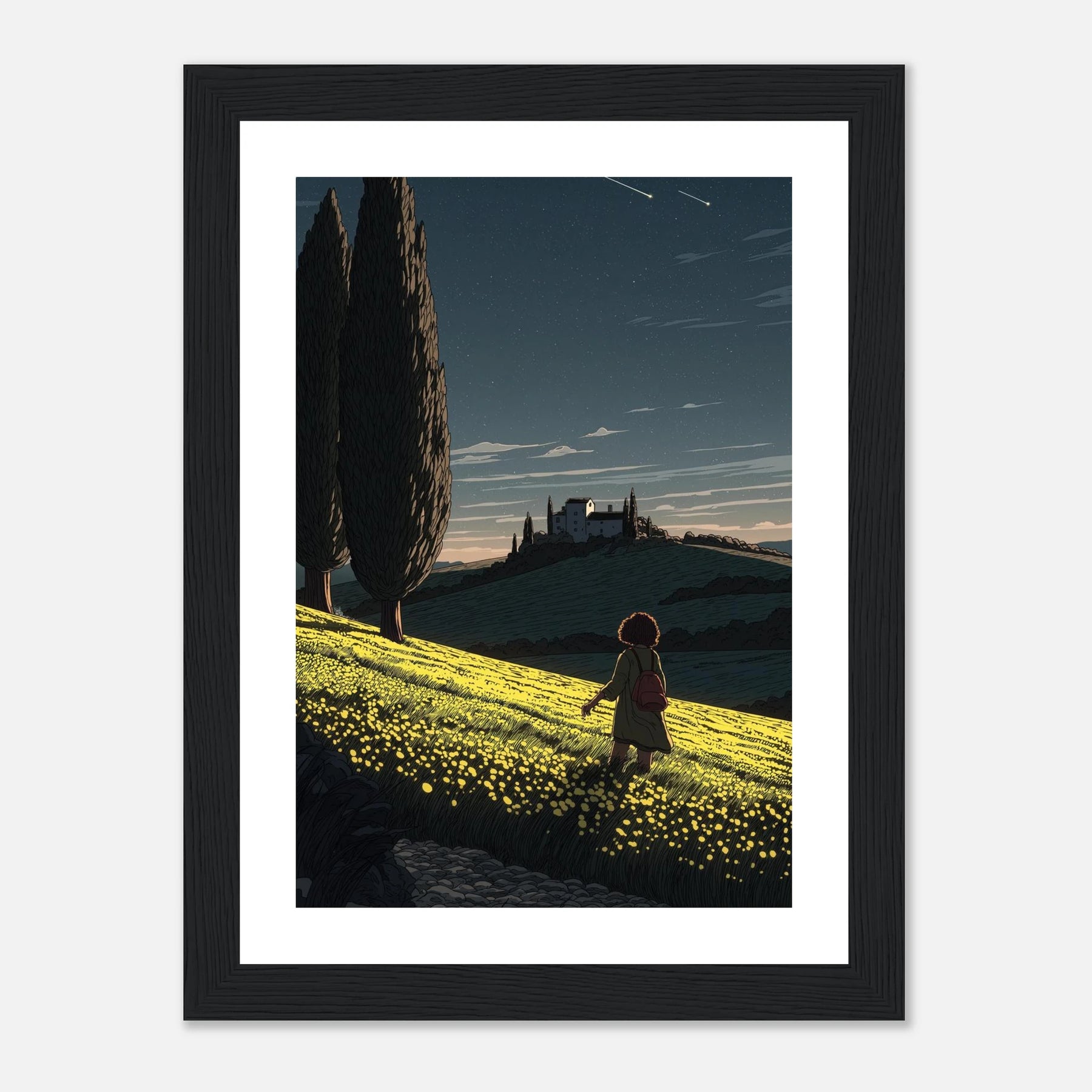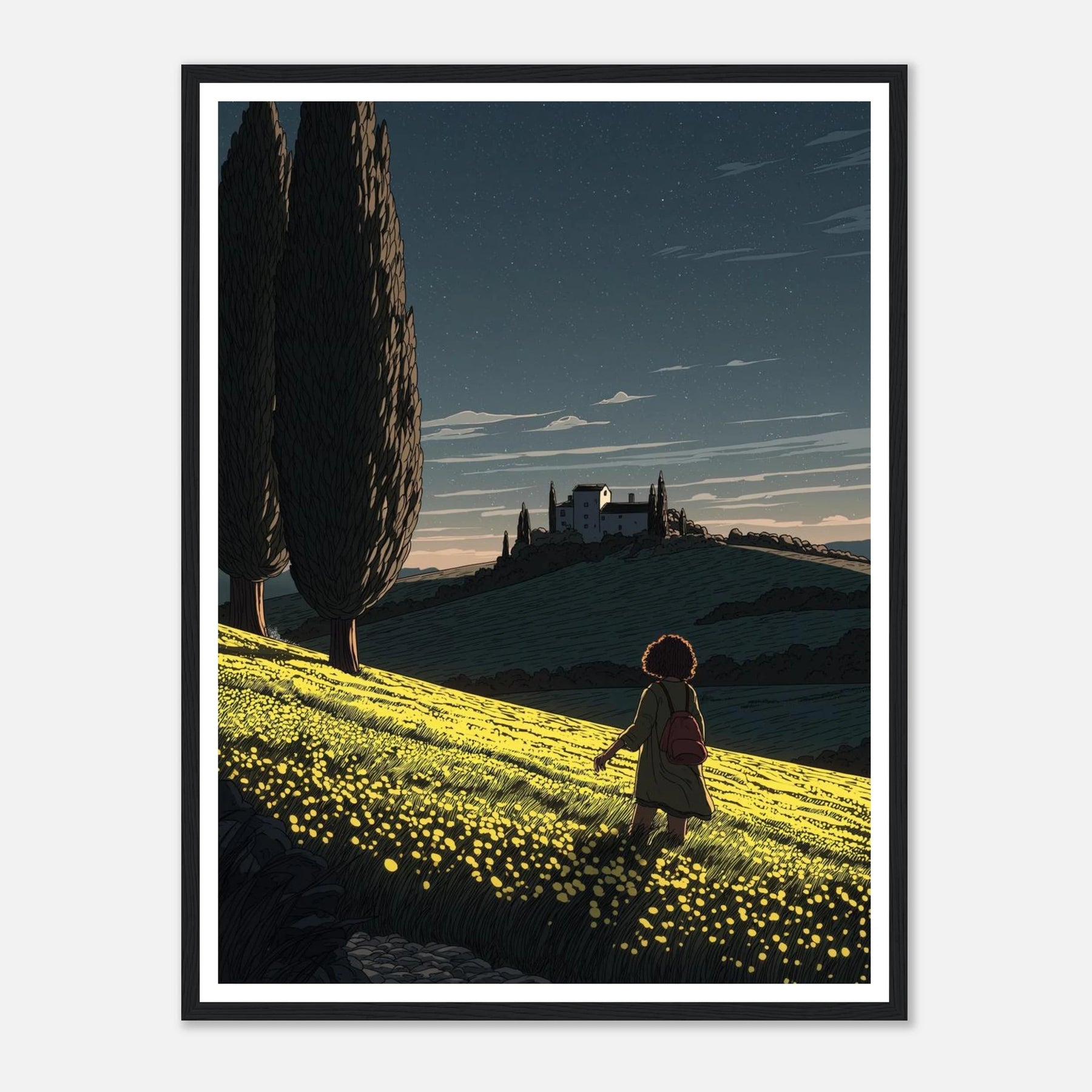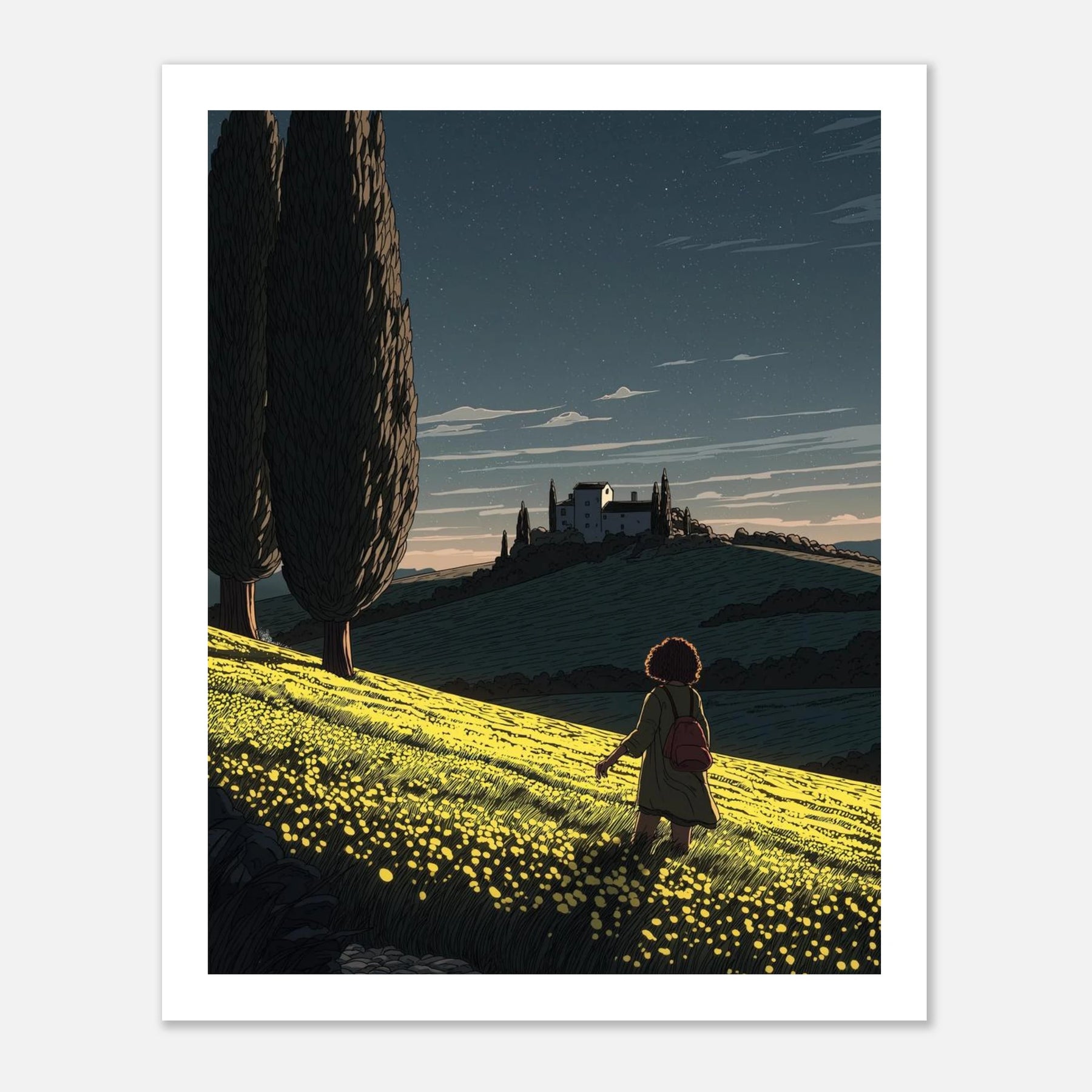 • Like a sunflower turning toward the light, true self-actualization comes from seeking out the good. This vibrant, deeply textured print features a lone wanderer pausing to take in a glowing field of yellow blooms under a twilight sky streaked with shooting stars. Hang this piece as a daily reminder to look for the light, trust your journey, and remain open to quiet moments of wonder.