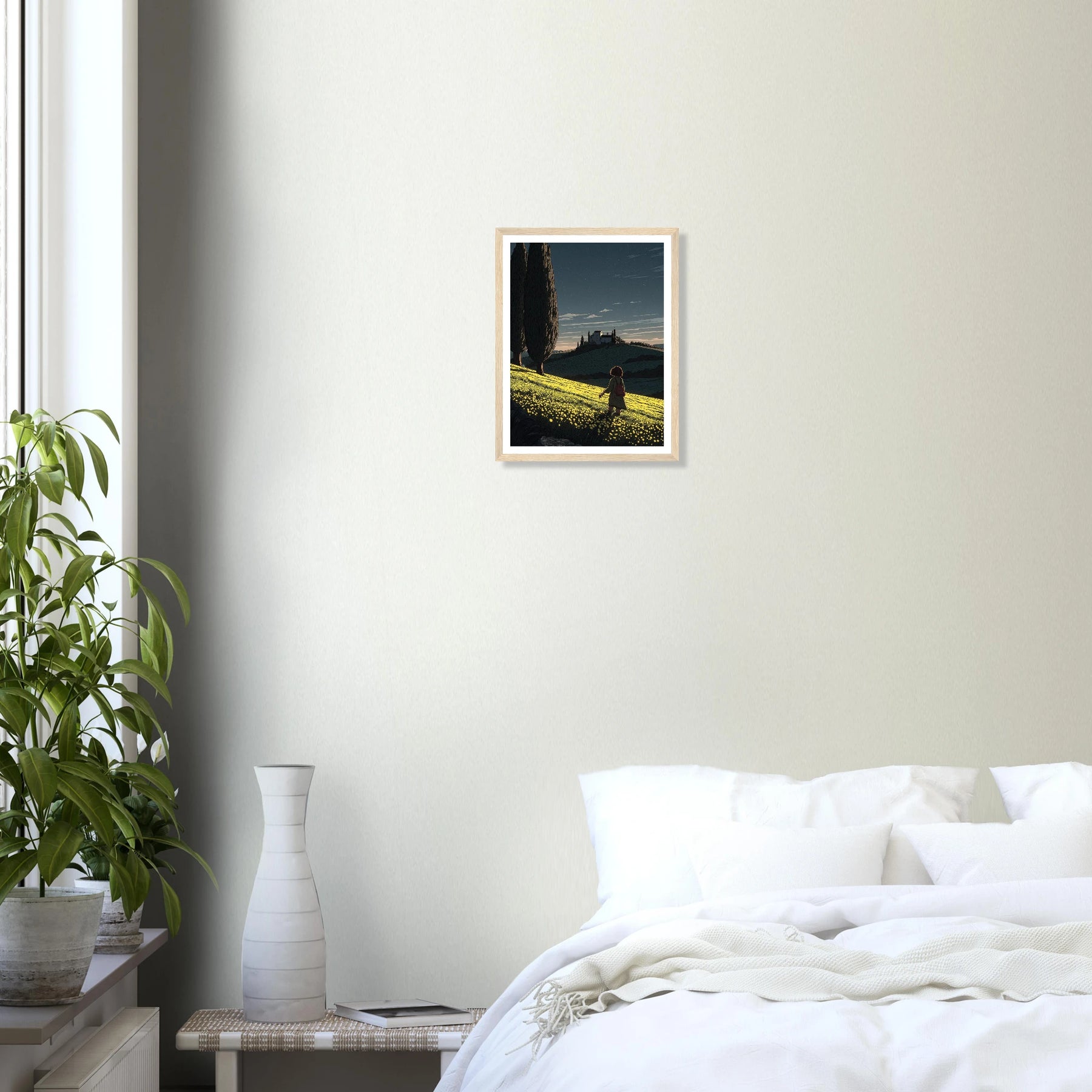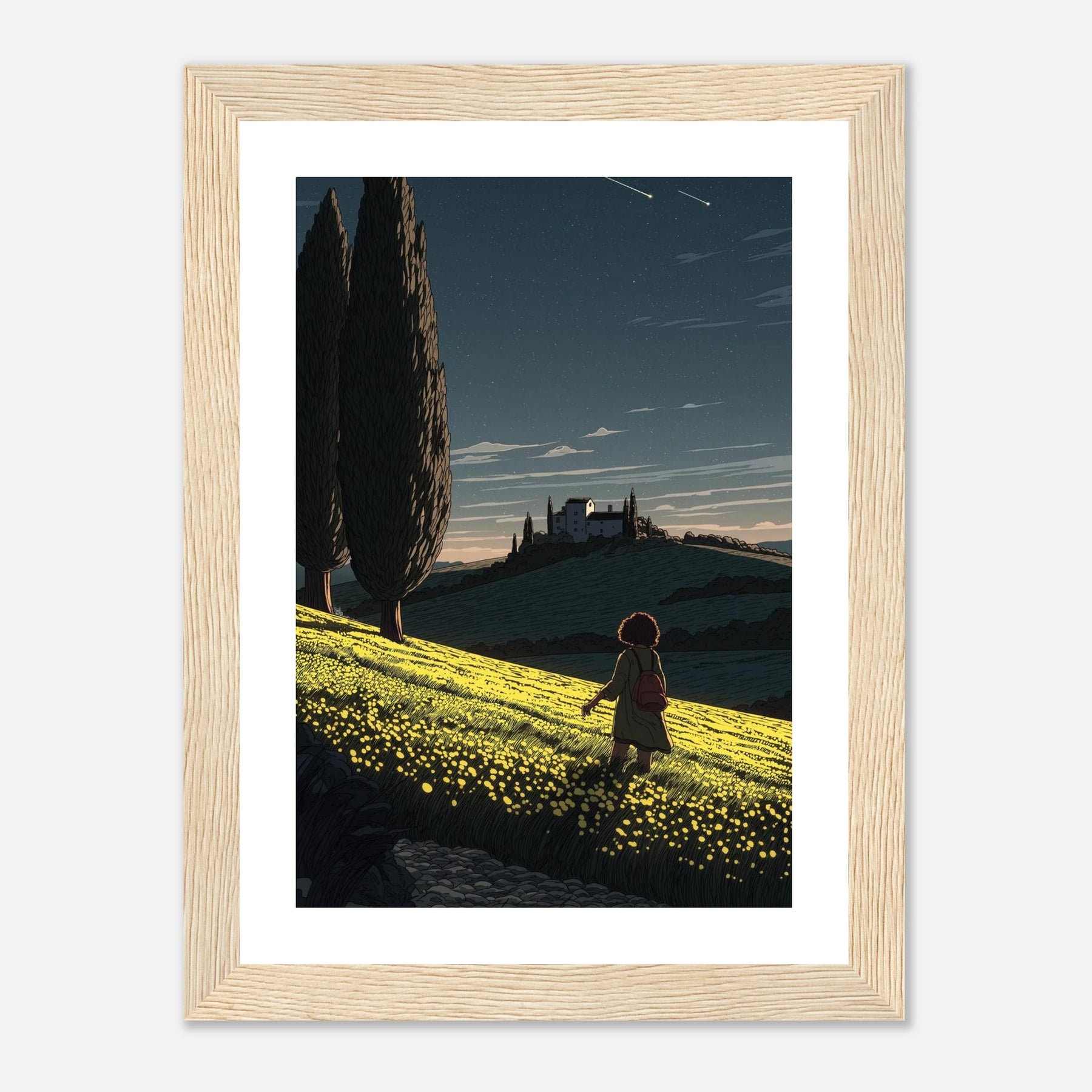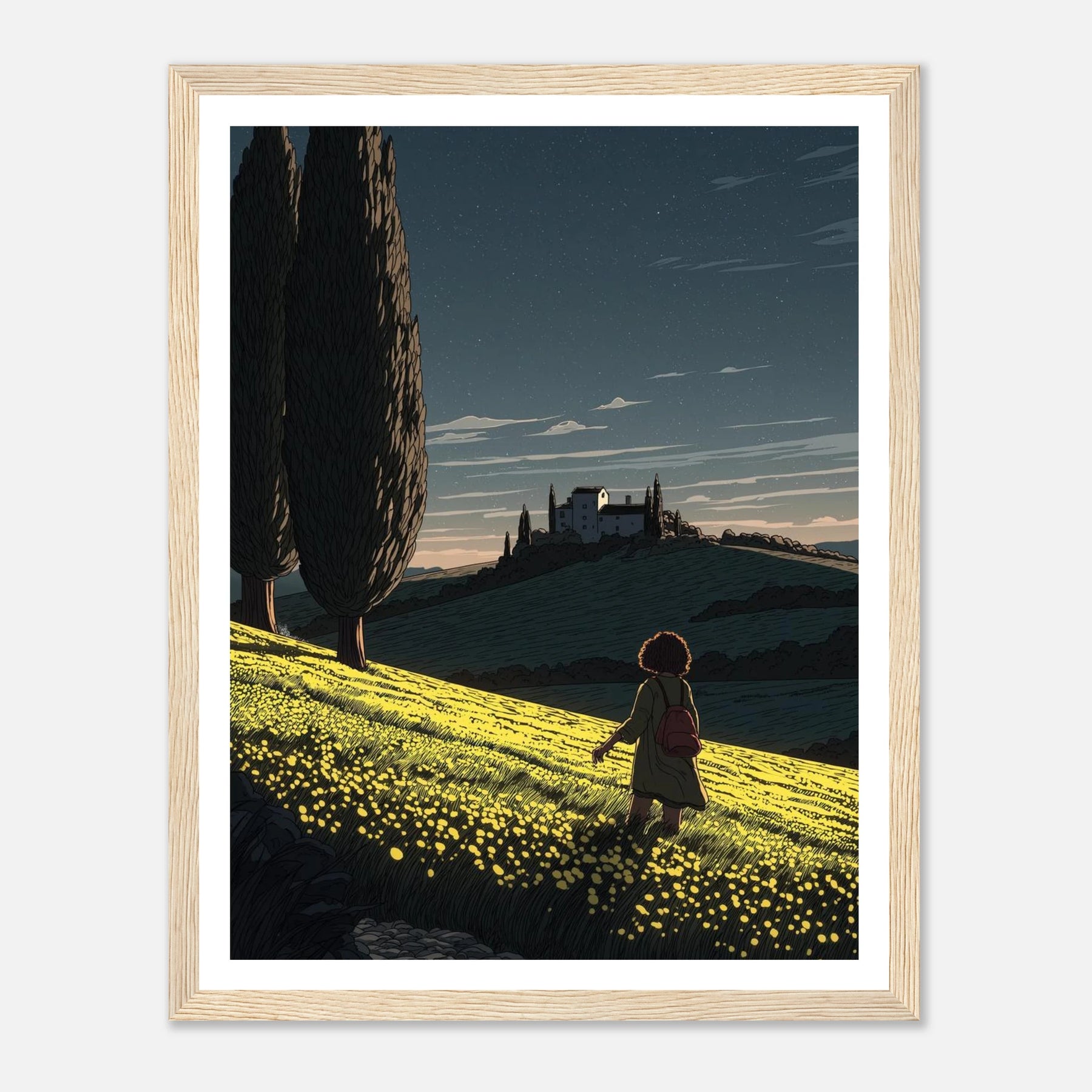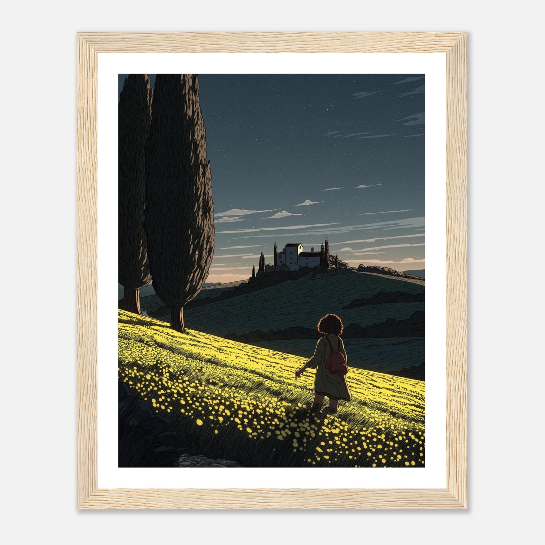 • Like a sunflower turning toward the light, true self-actualization comes from seeking out the good. This vibrant, deeply textured print features a lone wanderer pausing to take in a glowing field of yellow blooms under a twilight sky streaked with shooting stars. Hang this piece as a daily reminder to look for the light, trust your journey, and remain open to quiet moments of wonder.