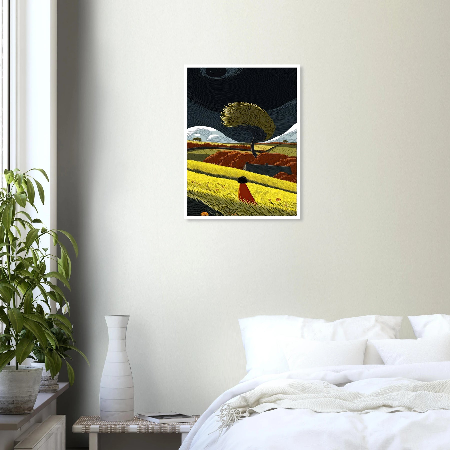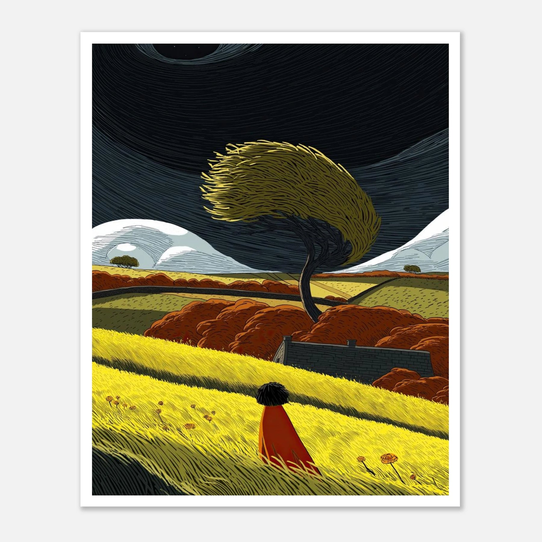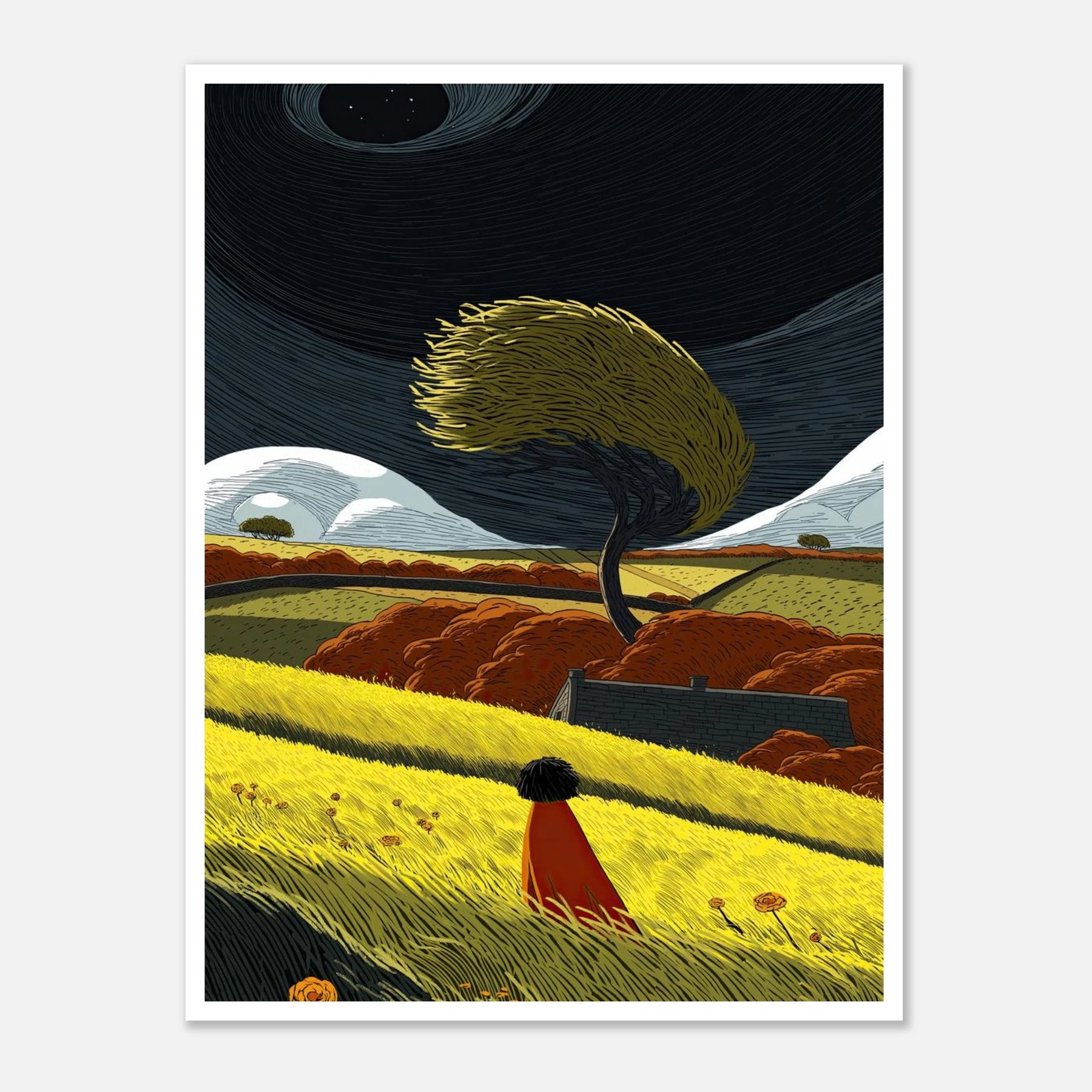 Life brings changes, just like the wind bends the trees. This poster shows a bright, bold landscape where a single person watches a tree leaning into the breeze under a starry, swirling sky. It is all about strength, rolling with the changes, and finding beauty in the wild moments. Bring this art into your home to remind yourself that you are strong enough to weather any storm.