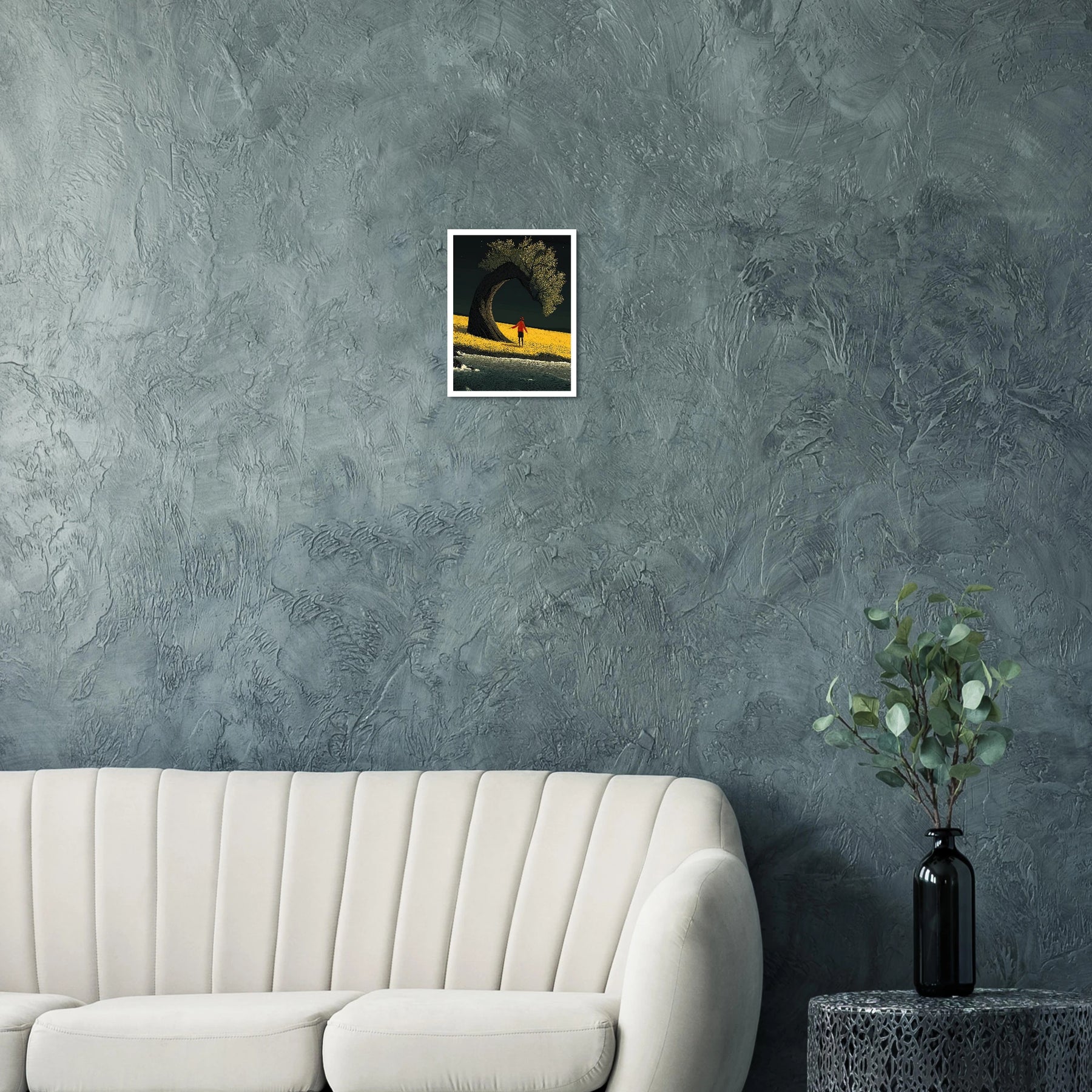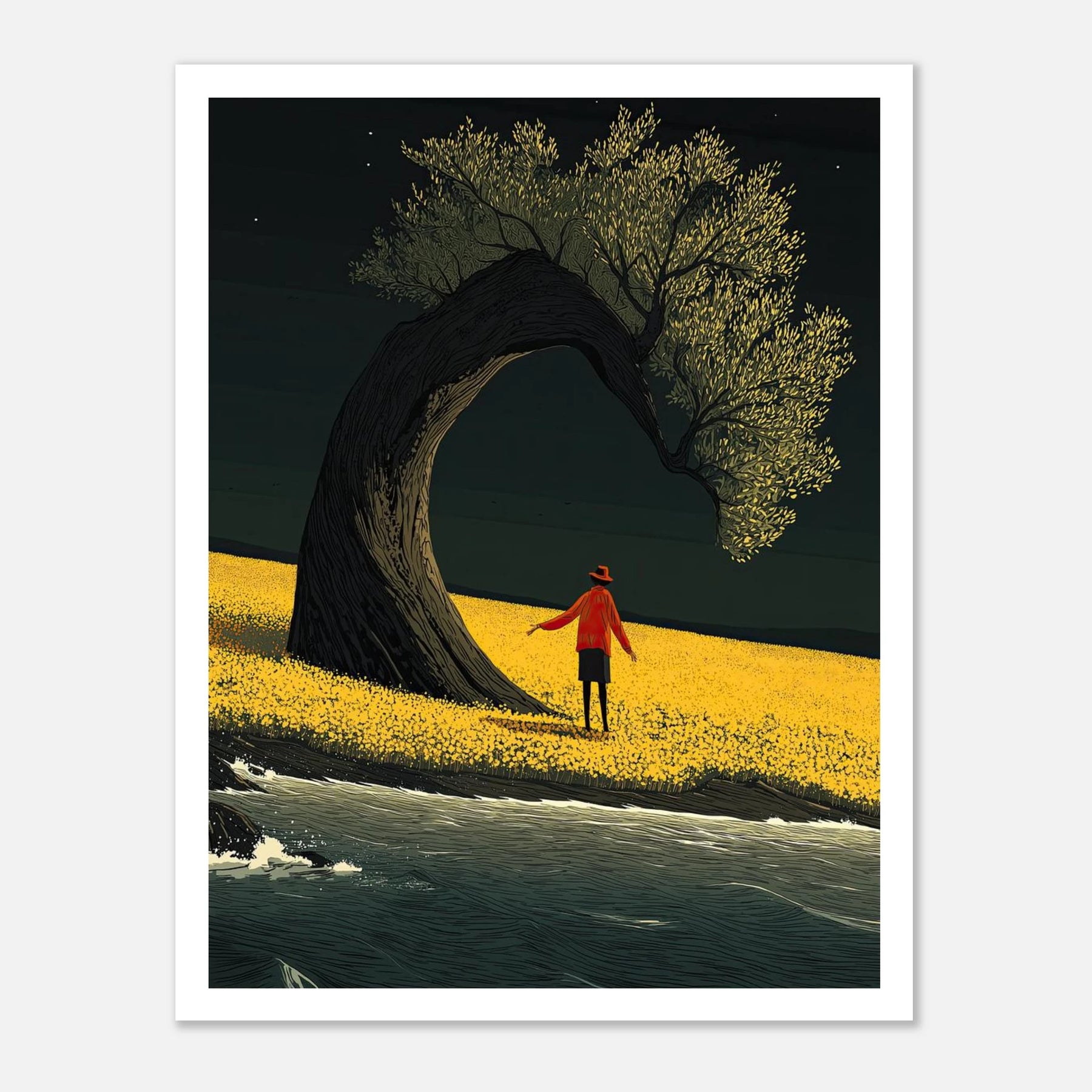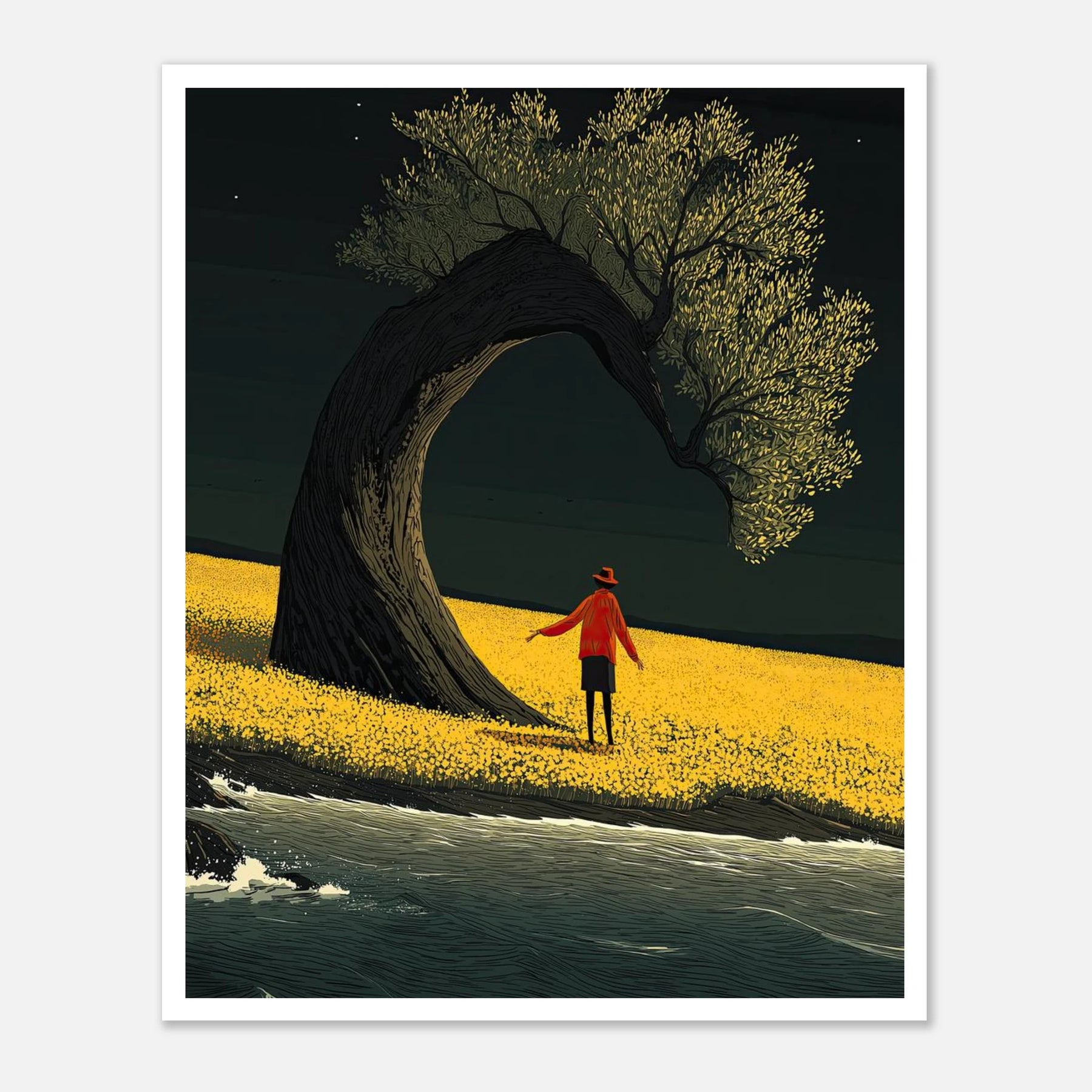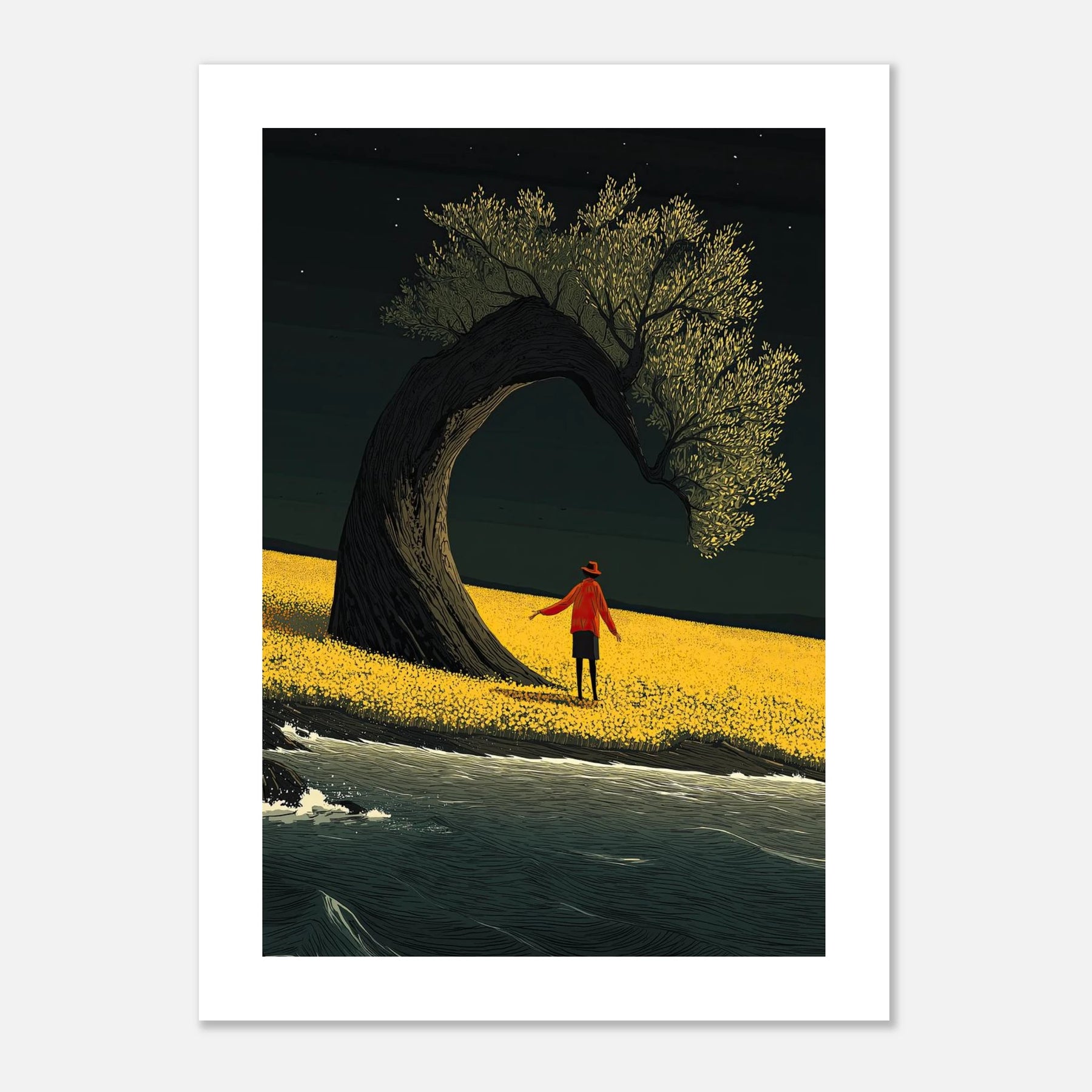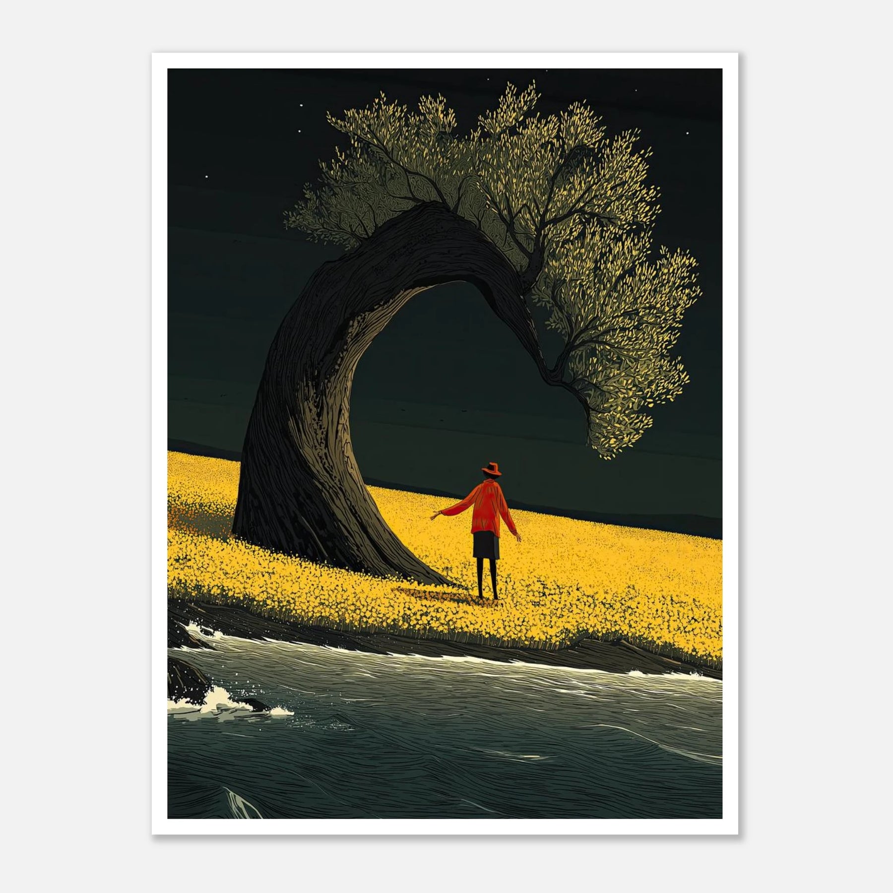A touch of magic and surrealism. This artwork showcases a solitary figure standing beneath a massive, dramatically arched tree that seems to bow toward the earth. The striking contrast between the bright golden field of flowers, the dark, churning waters of the sea, and the starry night sky creates a dreamlike, captivating image perfect for inspiring wanderlust.