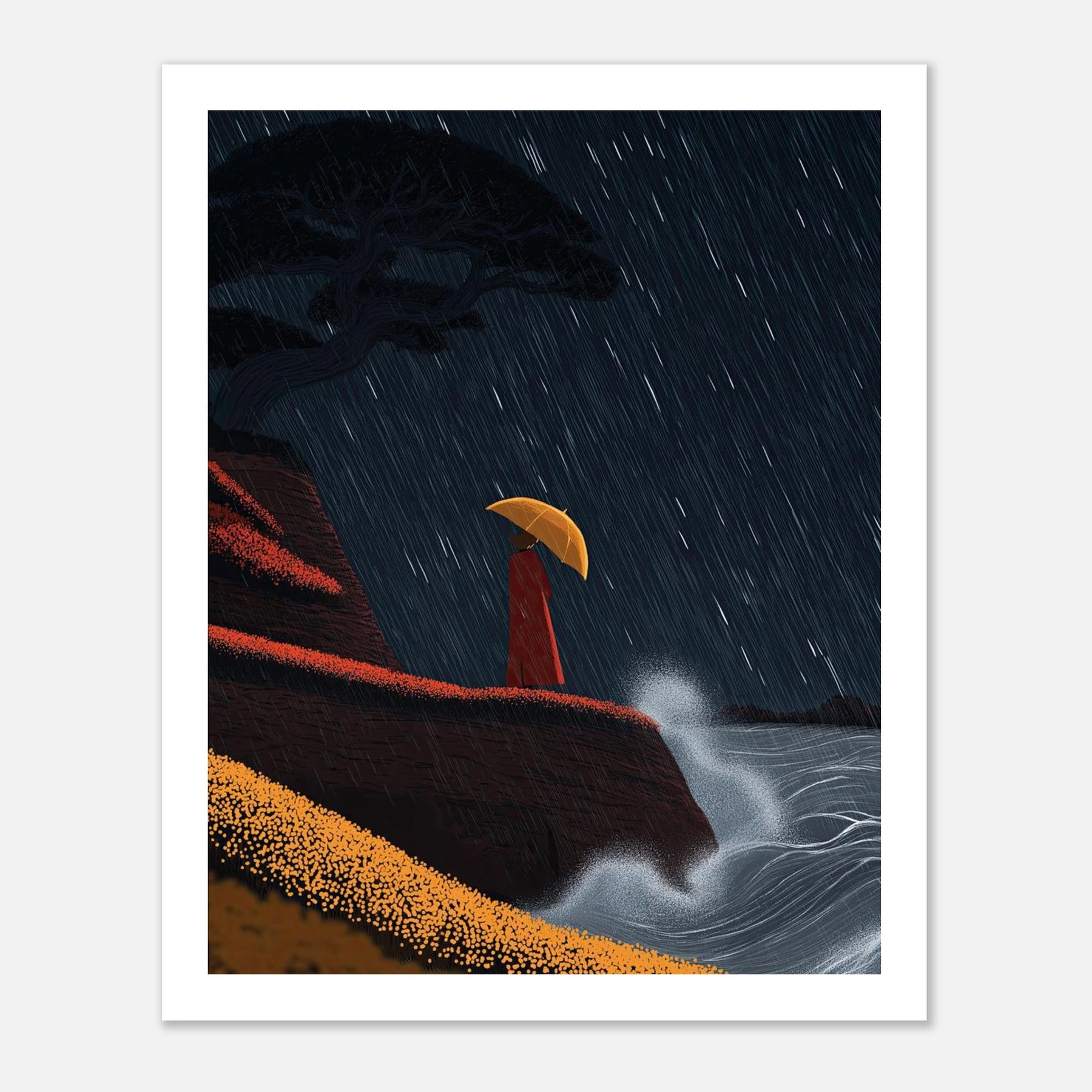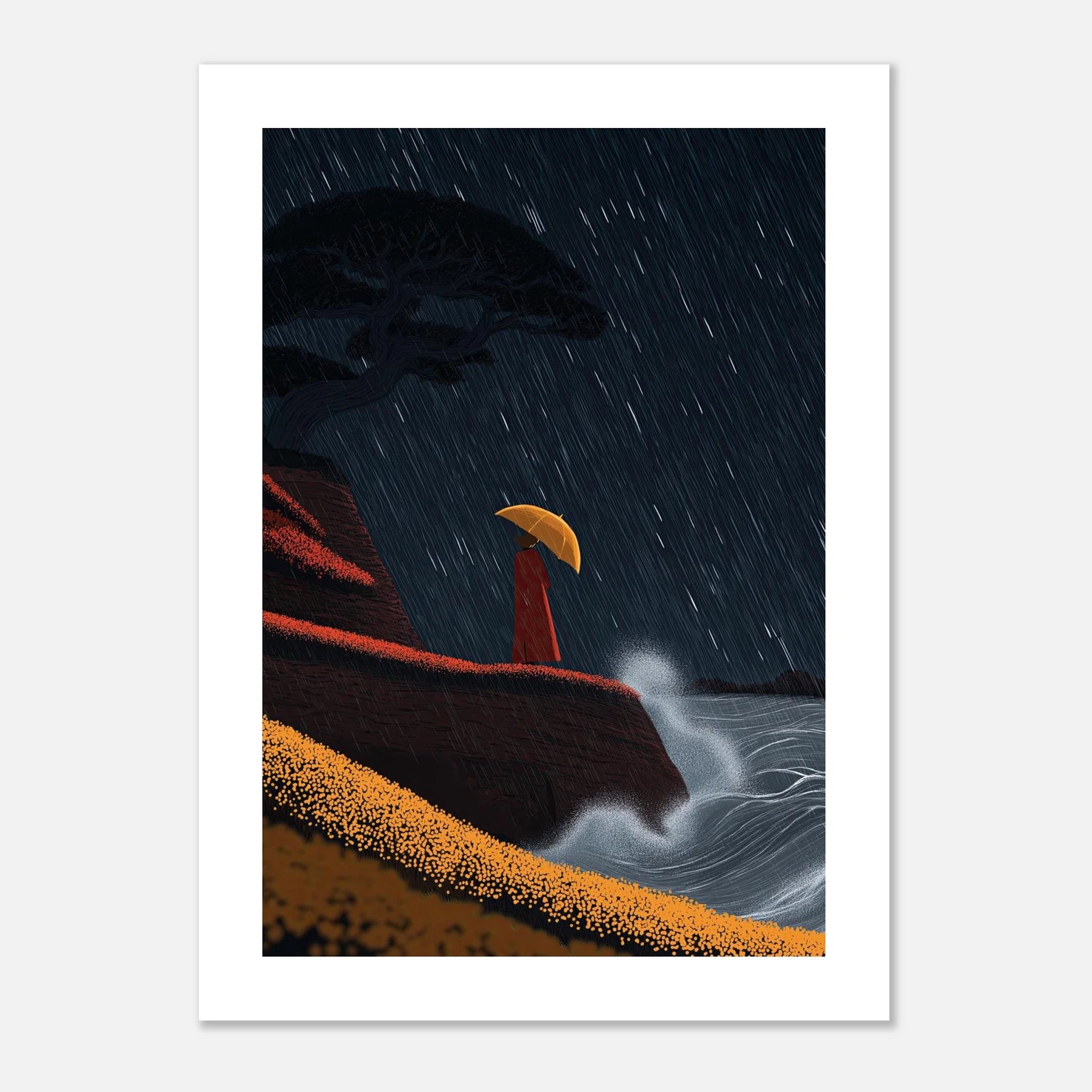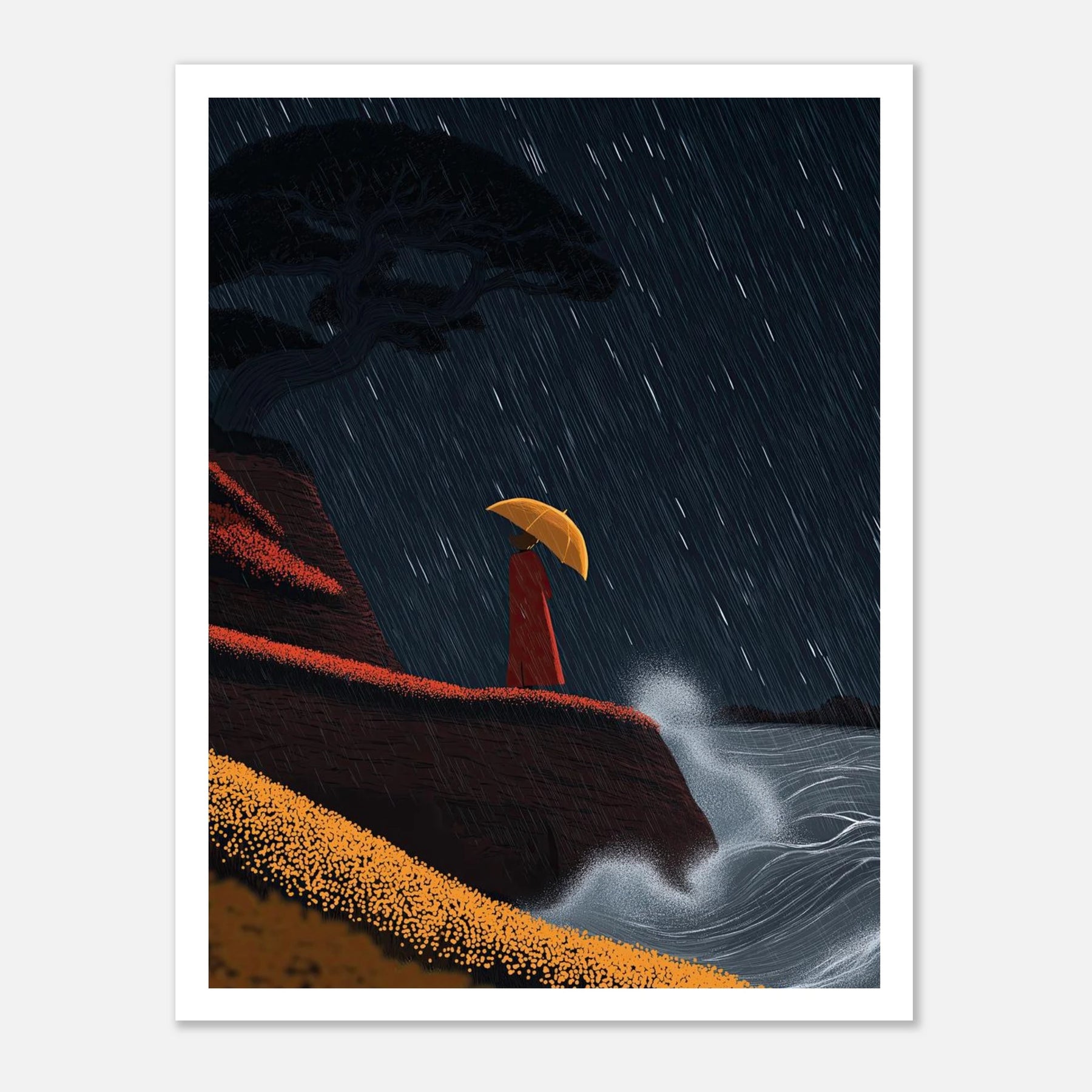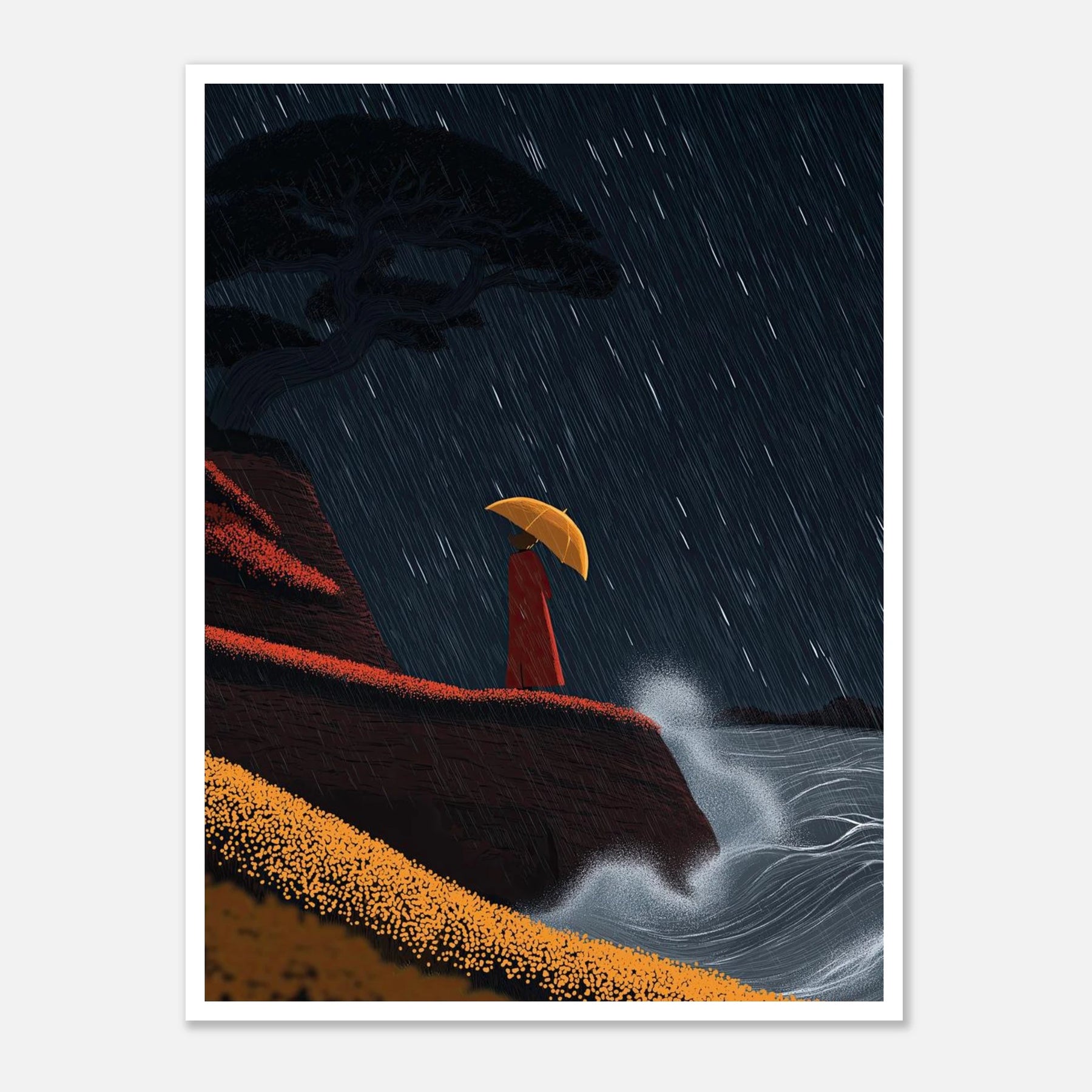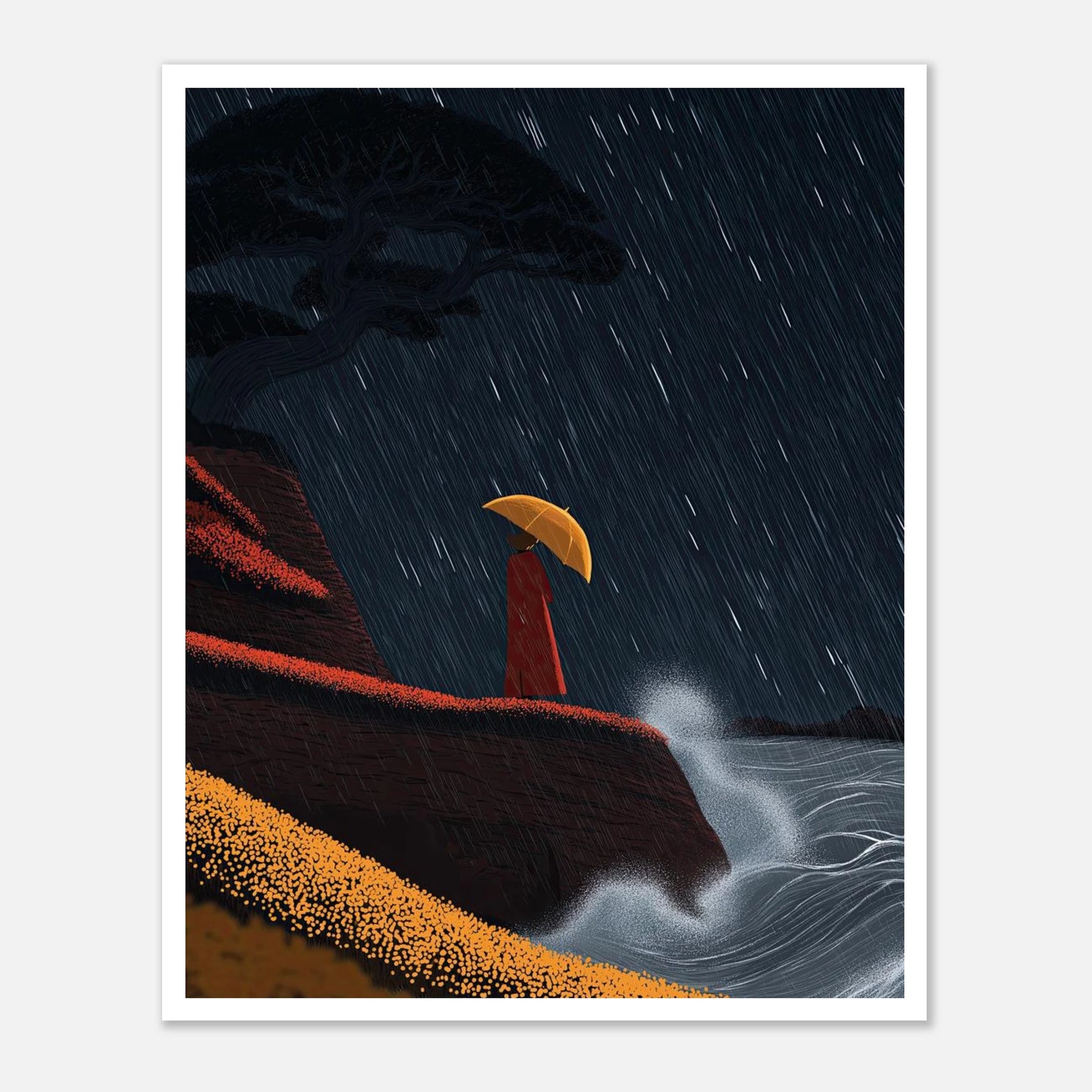 • Crashing surf and a torrential downpour frame a moment of solitary peace. Perched on a red-tinted cliffside, a figure finds refuge under a bright yellow umbrella. The contrast between the chaotic white sea spray and the steady, vertical rain makes this a captivating focal piece for any room.