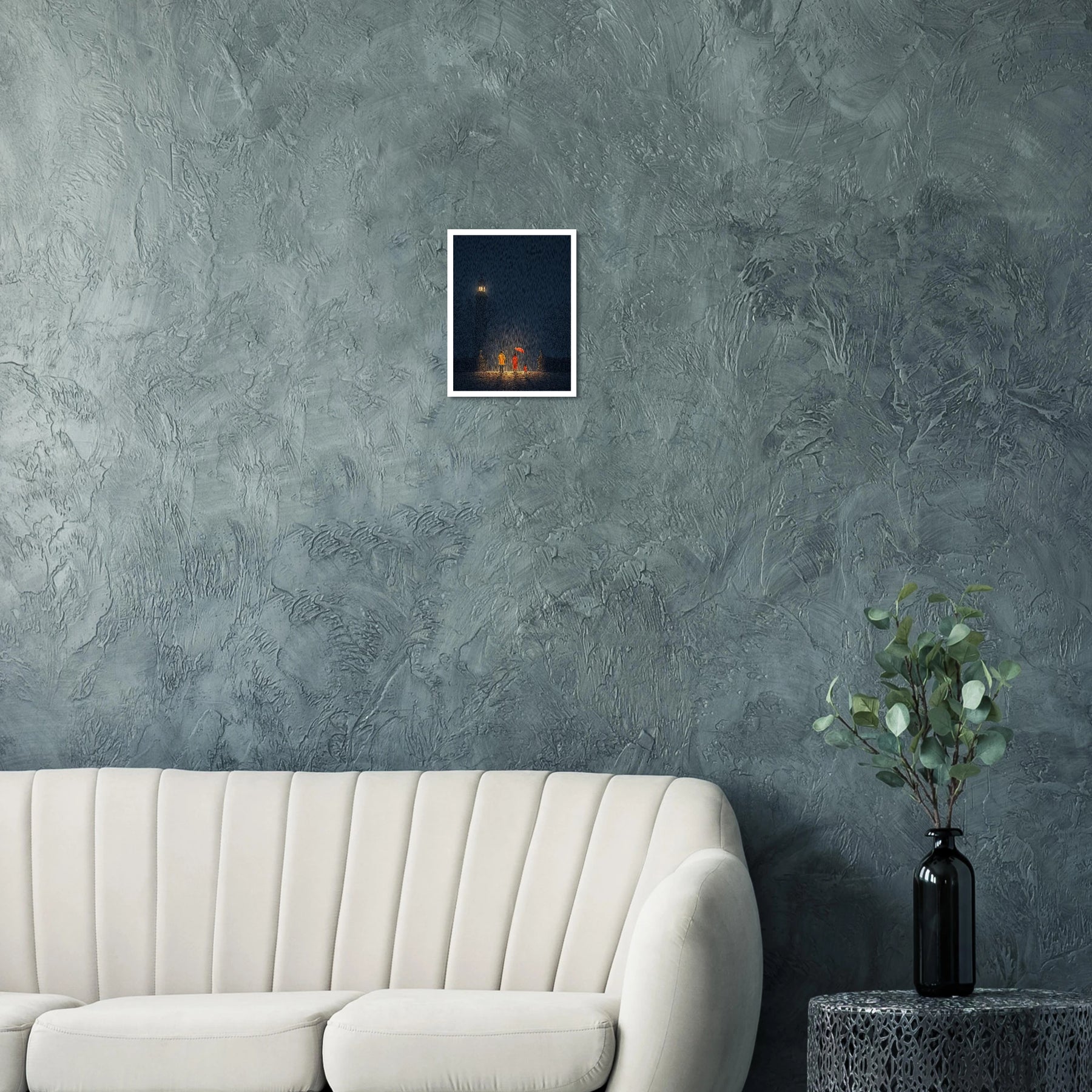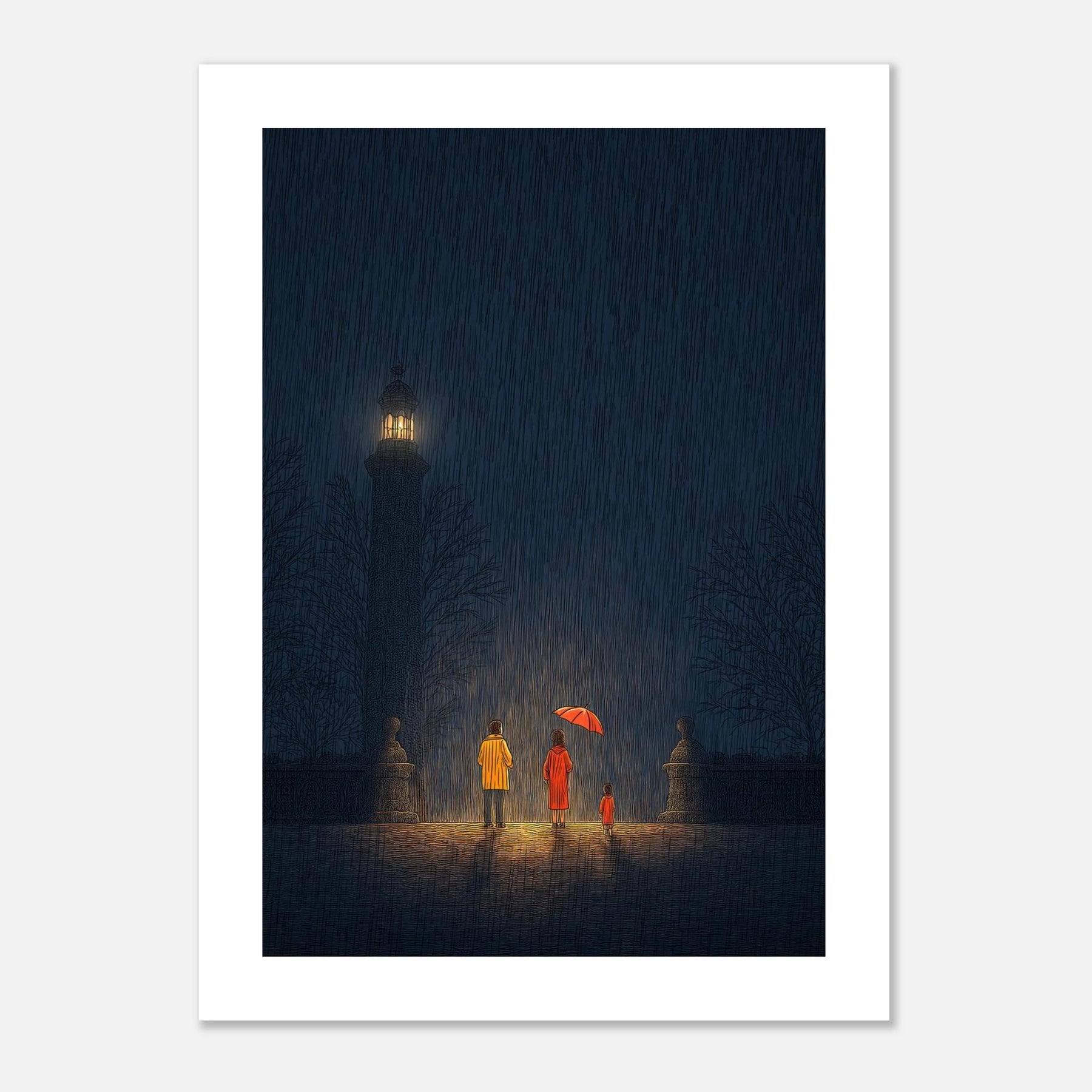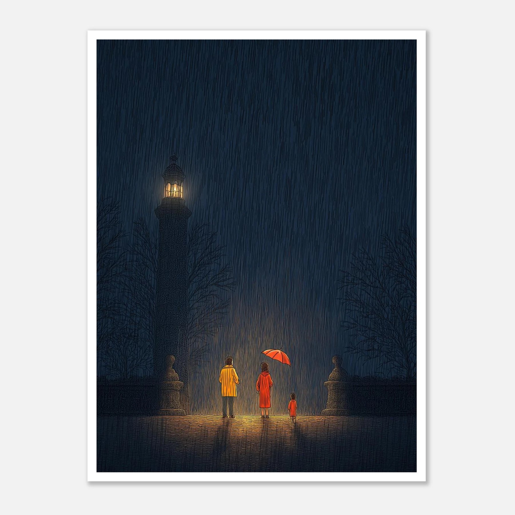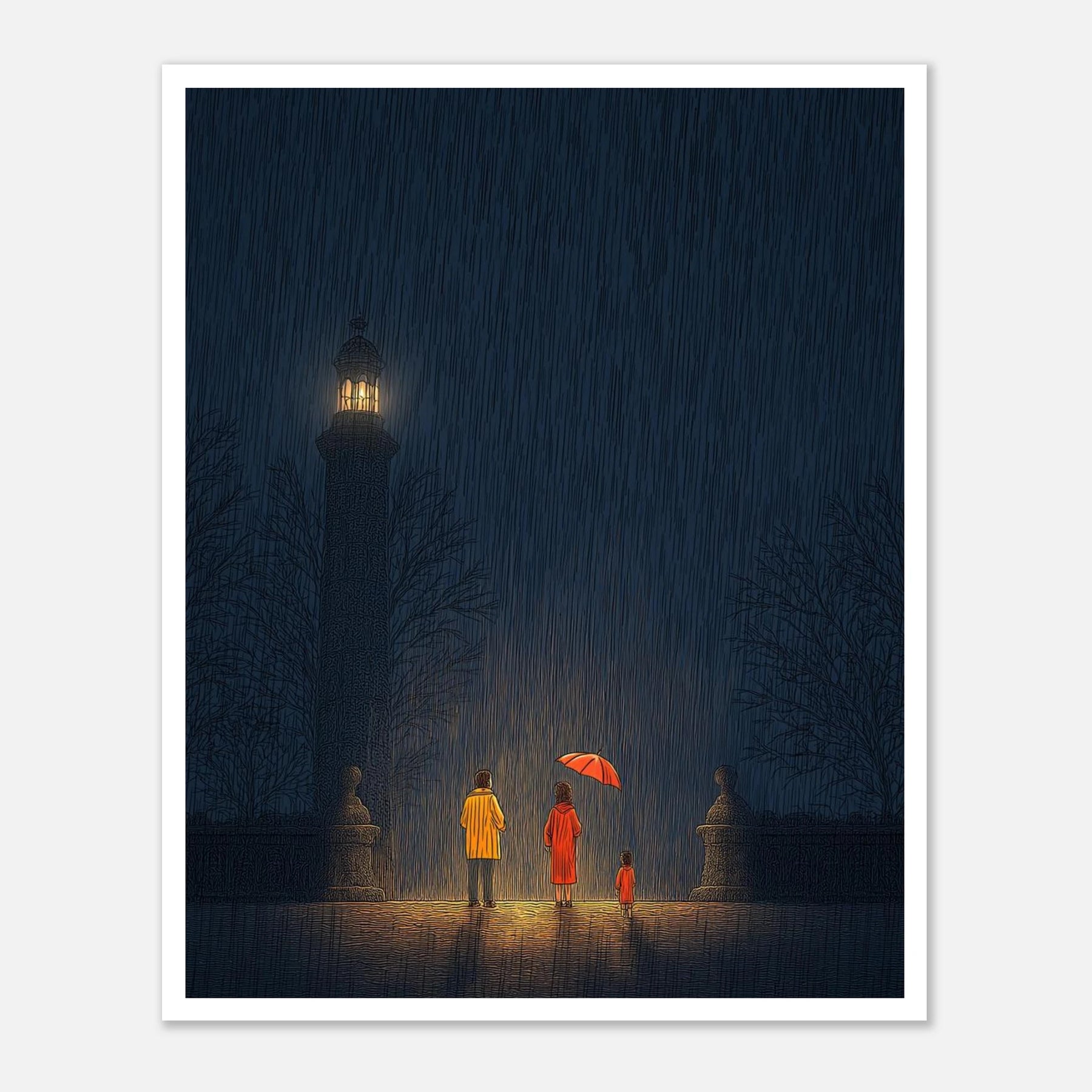 True resilience is finding peace even when the storm rages around you. This moody, atmospheric print depicts a family standing together under the heavy texture of a downpour, grounded by the warm, steadfast light of a nearby beacon. It is a beautiful metaphor for weathering life's difficult seasons with grace, maintaining your center, and protecting those who matter most.