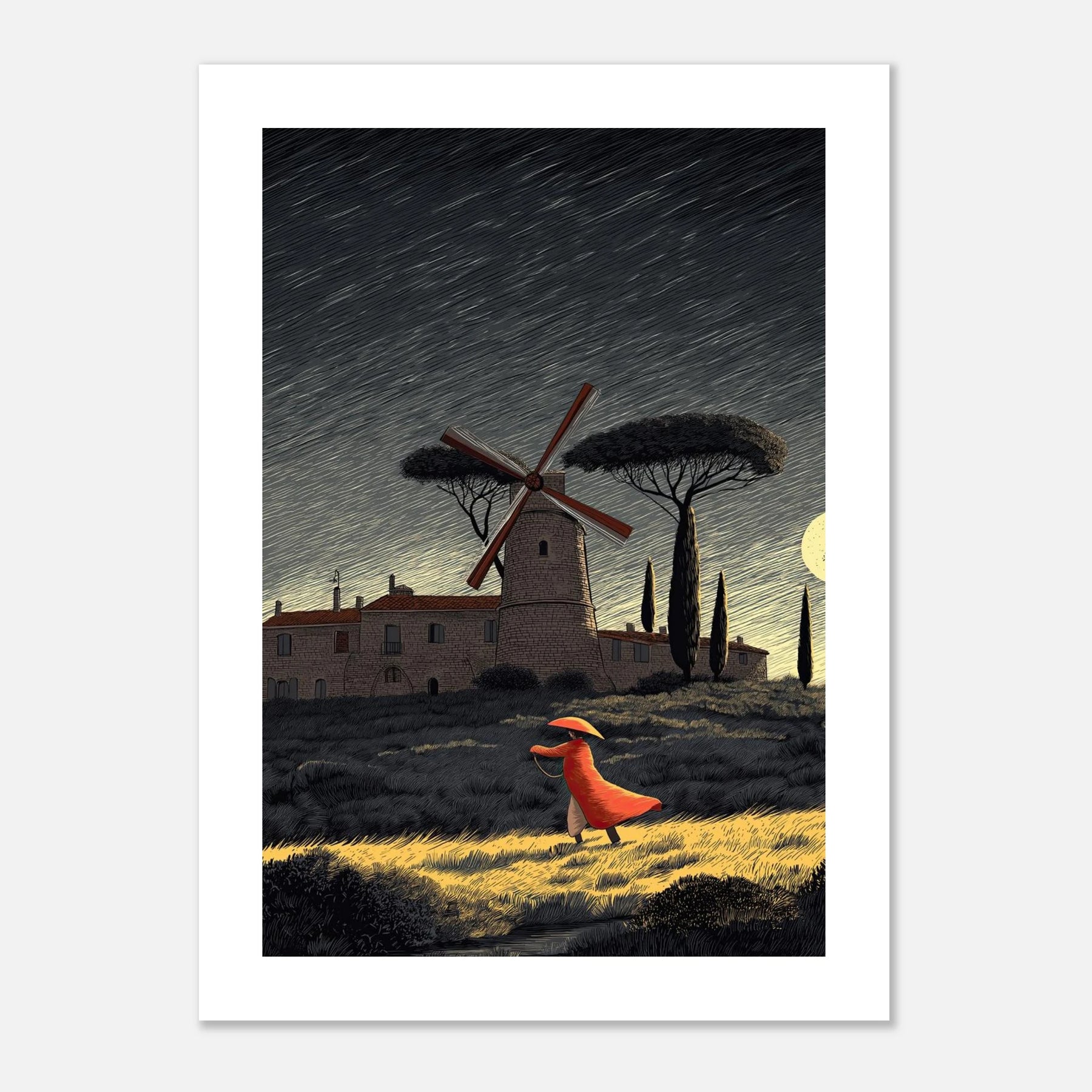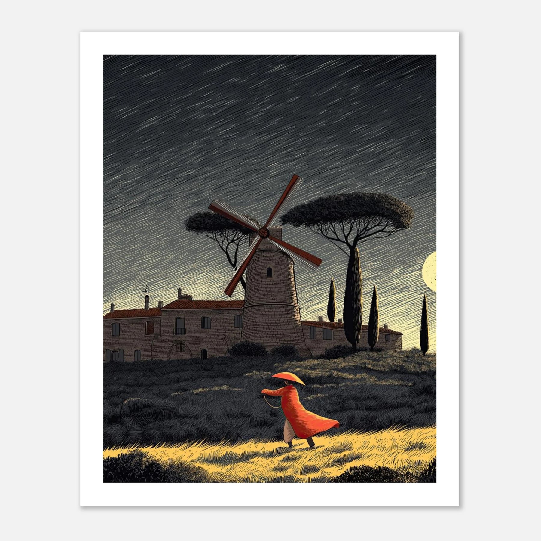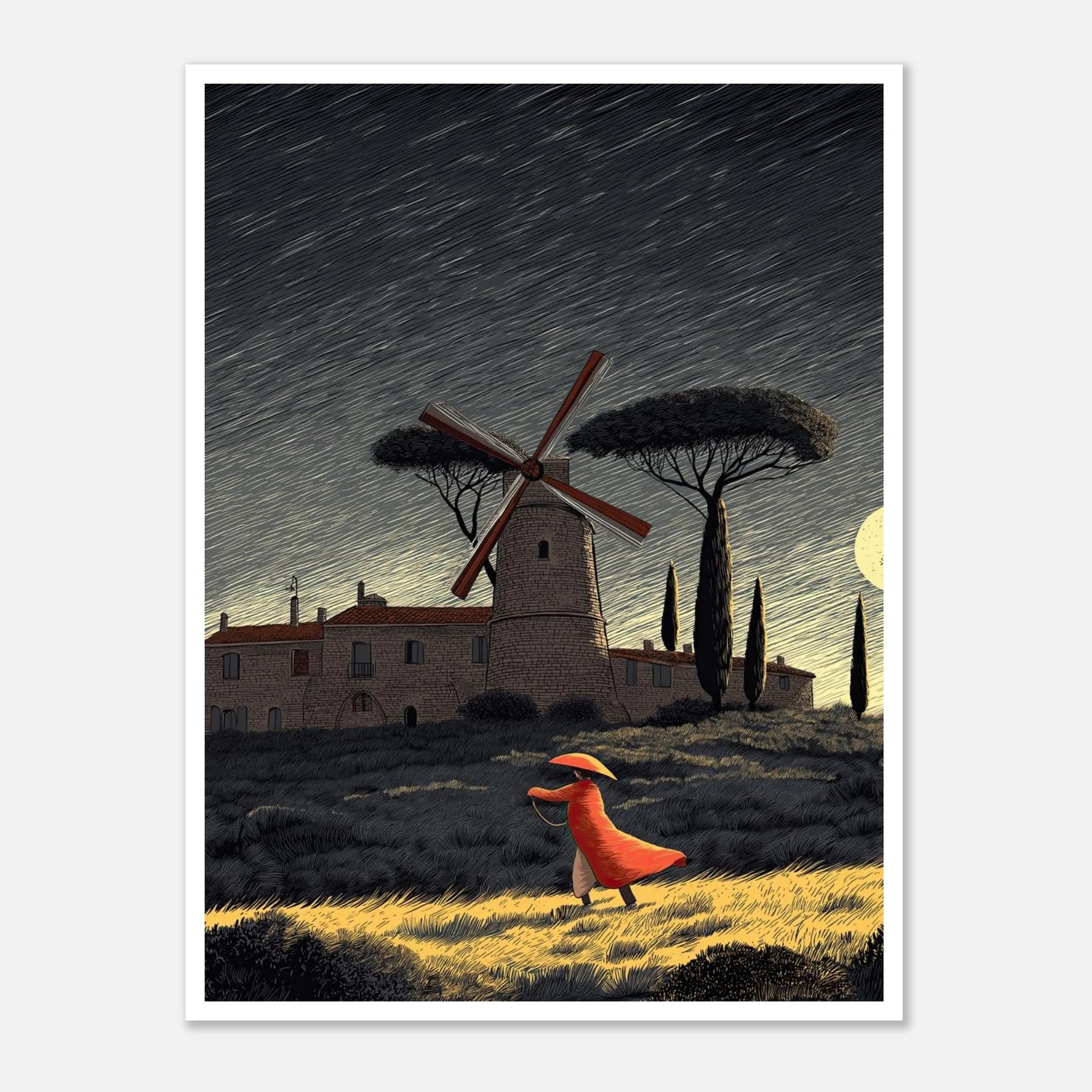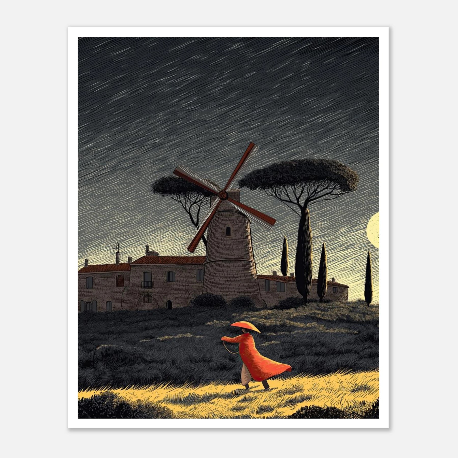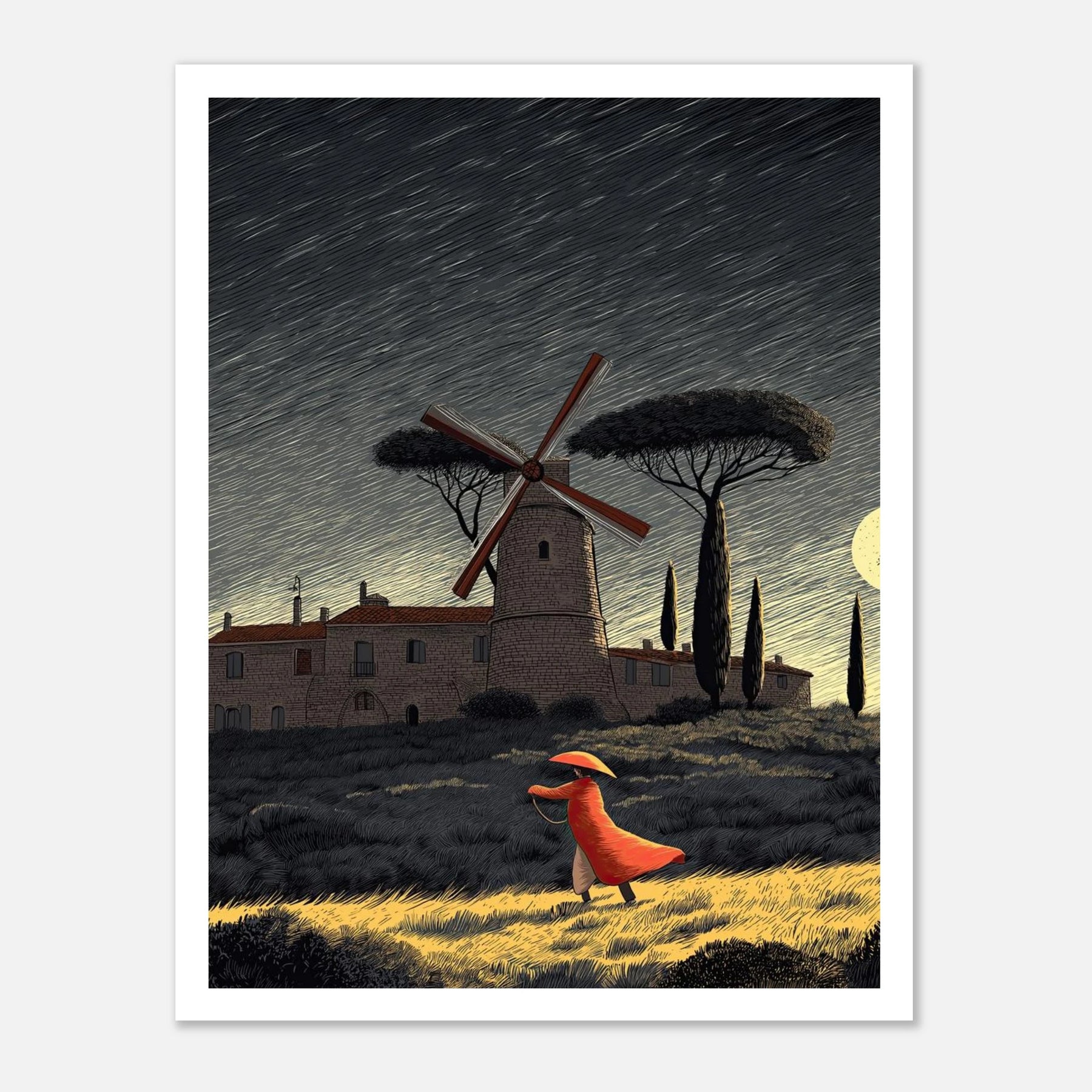 A dynamic night scene featuring a classic windmill and rolling hills, where a figure strides forward against a strong breeze. The highly textured, woodcut-inspired styling captures the energy of moving forward with purpose, maintaining your center, and confidently letting go of what no longer serves you.