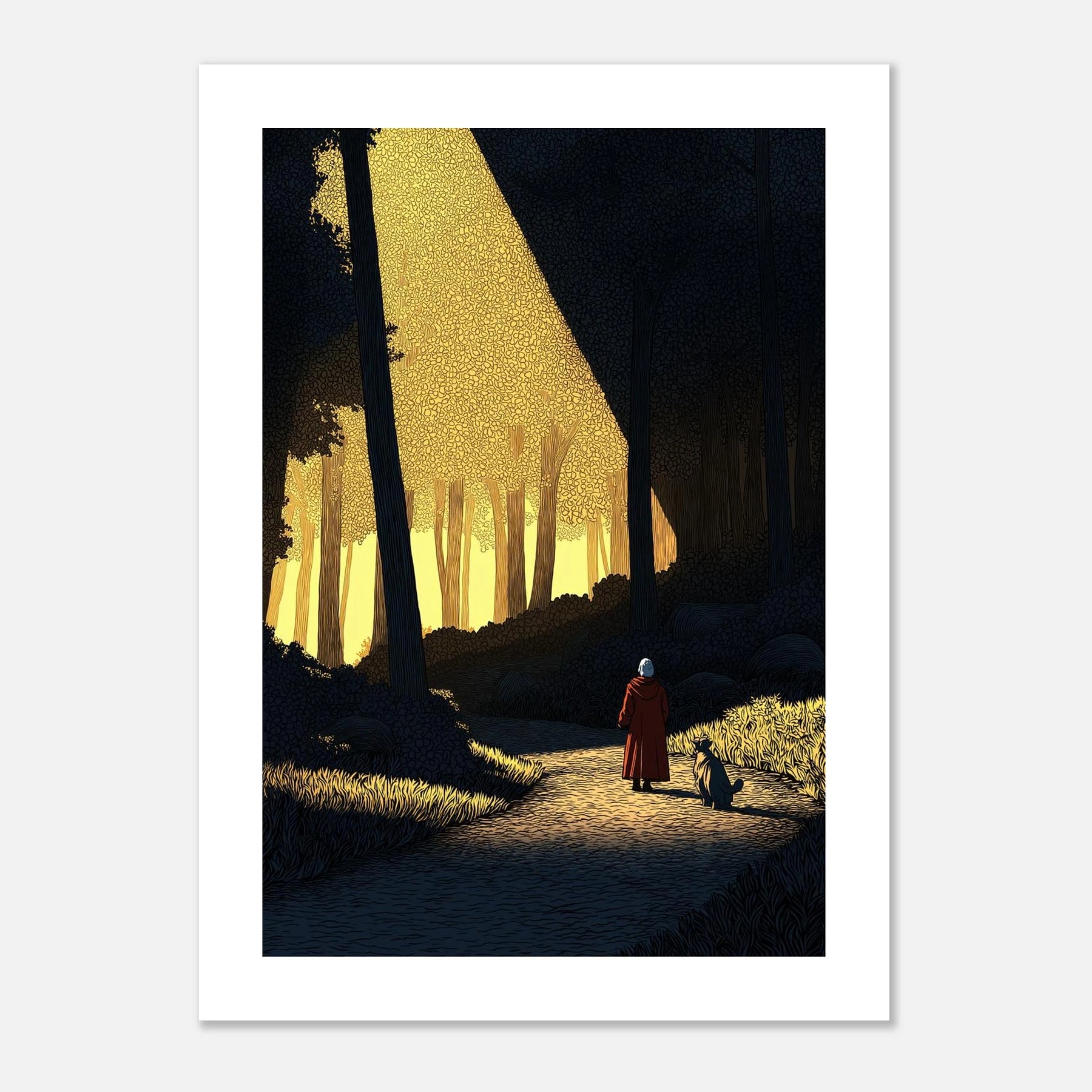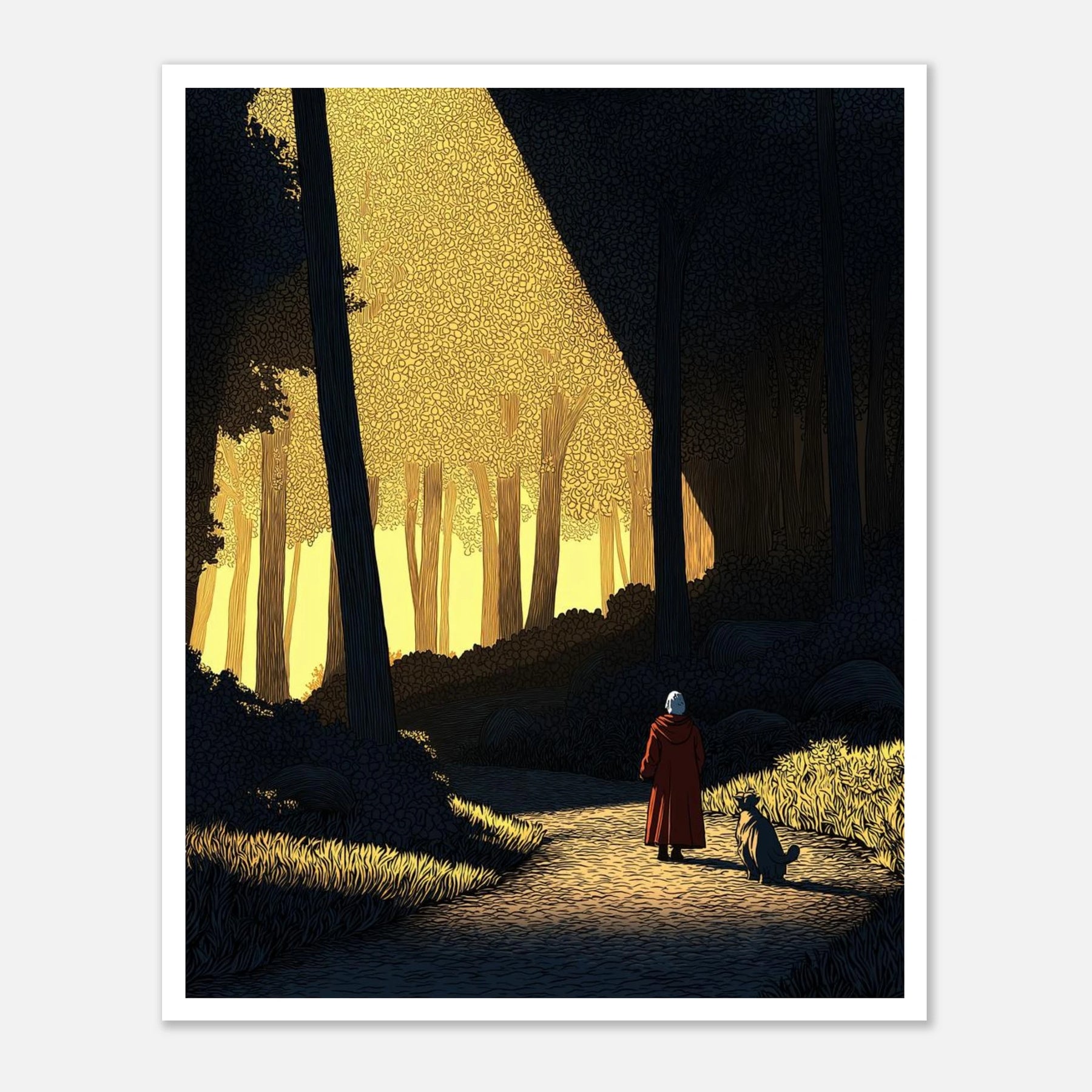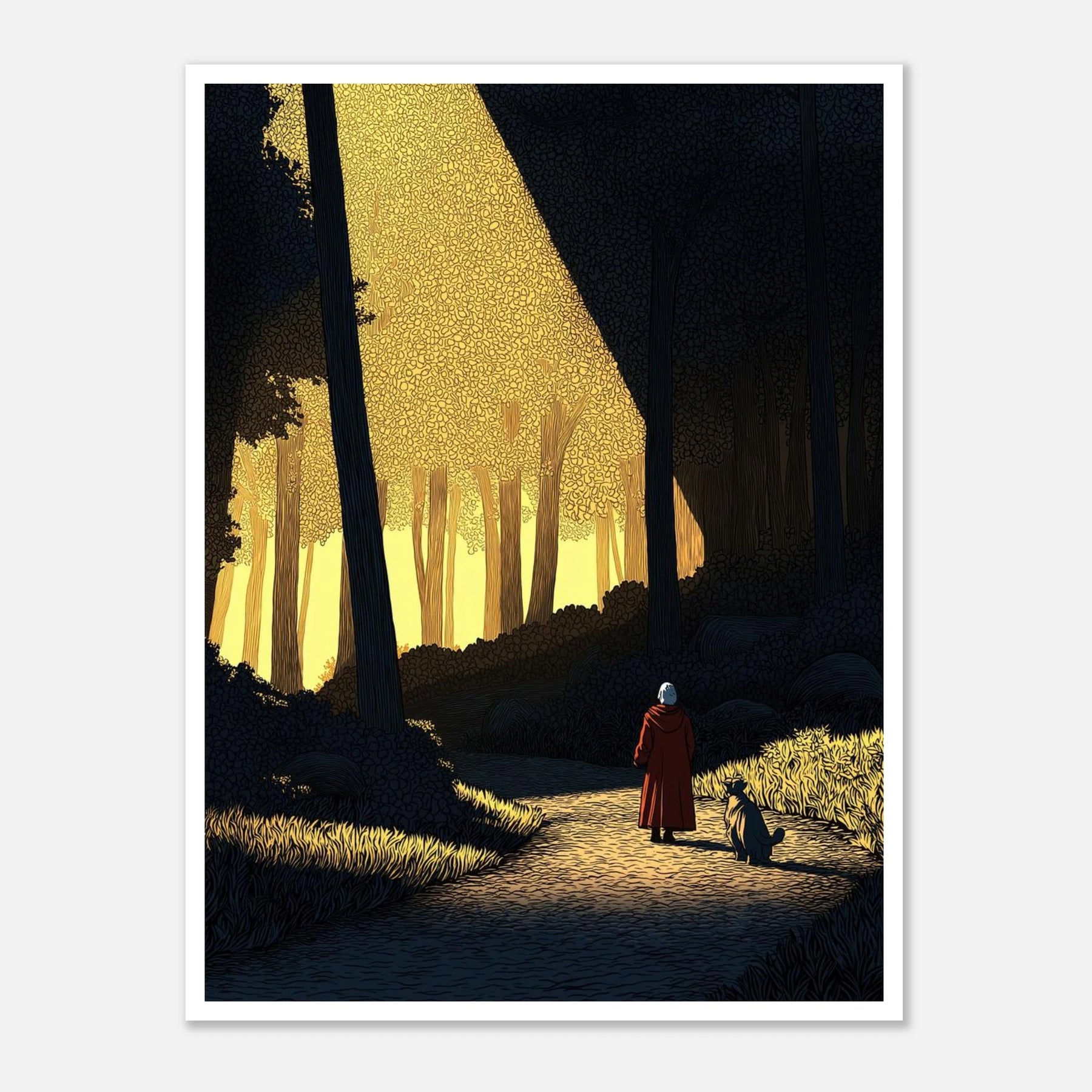 Clarity often arrives suddenly, piercing through the darkest woods. In this powerful piece, a lone figure and their dog walk through a dense, shadowed forest, illuminated by a brilliant, geometric shaft of golden light. This poster captures the essence of inner awakening and the courage it takes to step out of the shadows and walk unapologetically in your own truth.