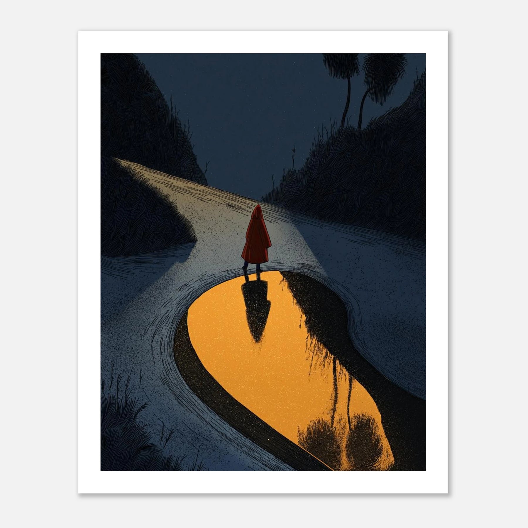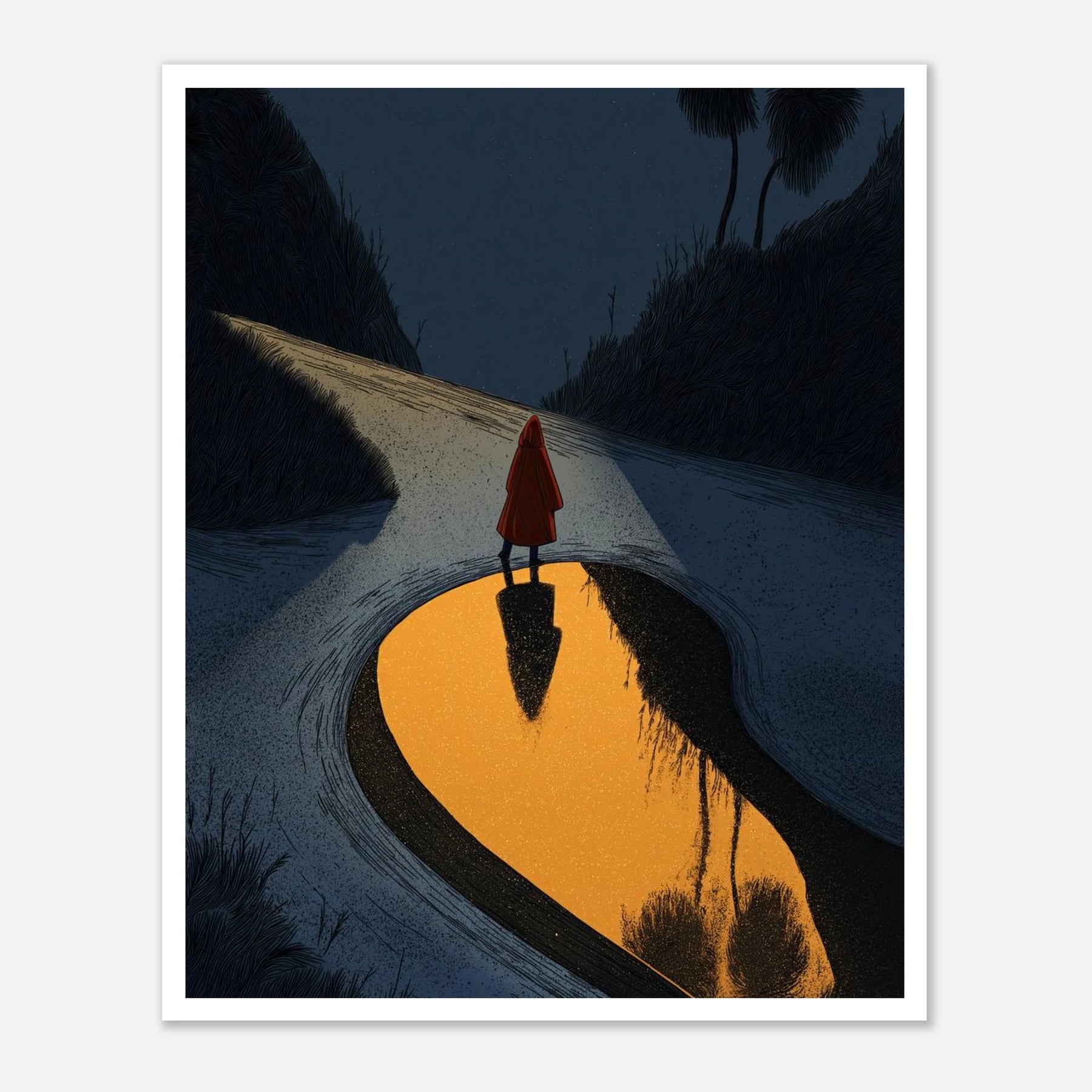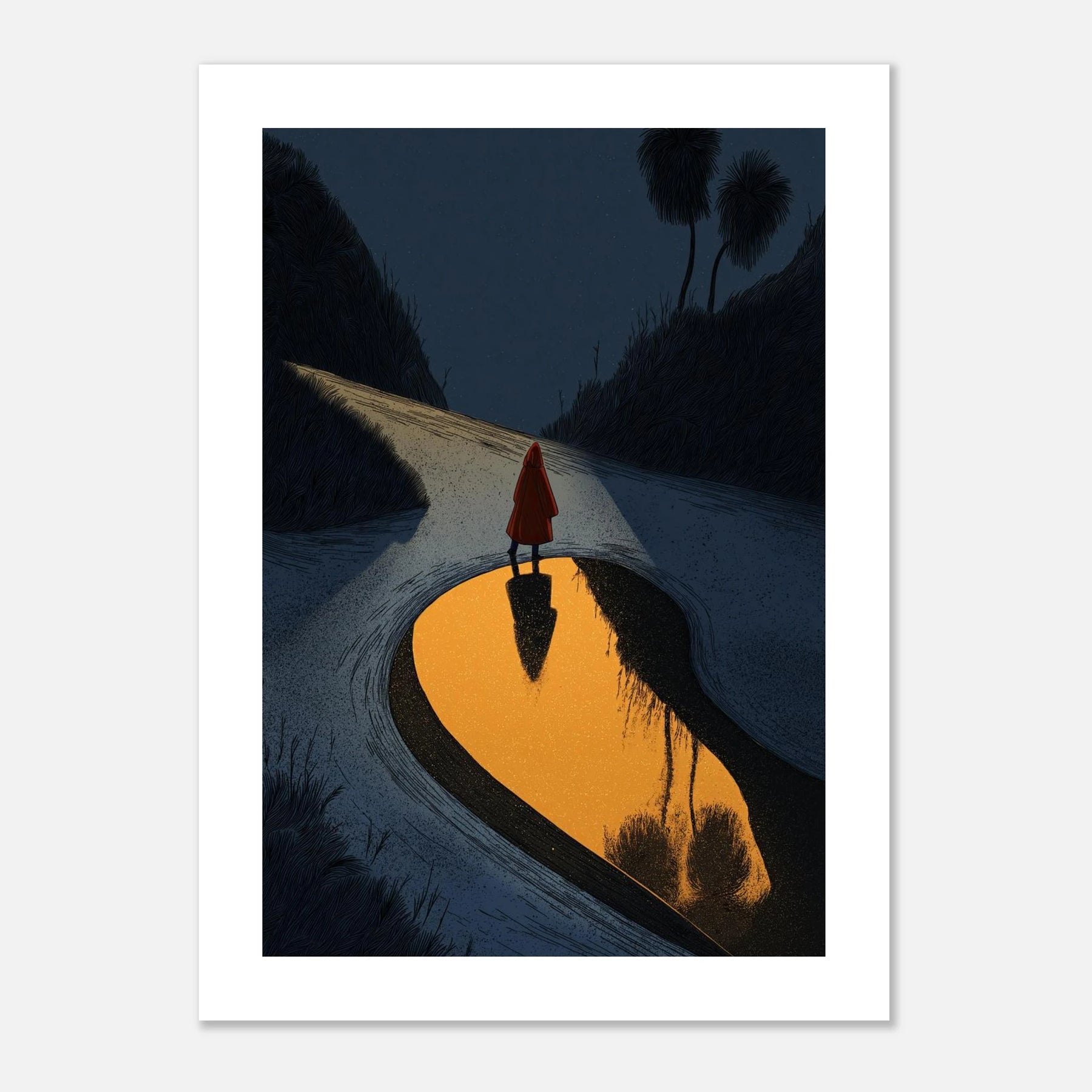 • Standing at a twilight junction, a traveler pauses before a golden, reflecting pool. This rich, textured print symbolizes the confidence to choose your own direction and the strength required to walk away from paths that no longer serve your growth.