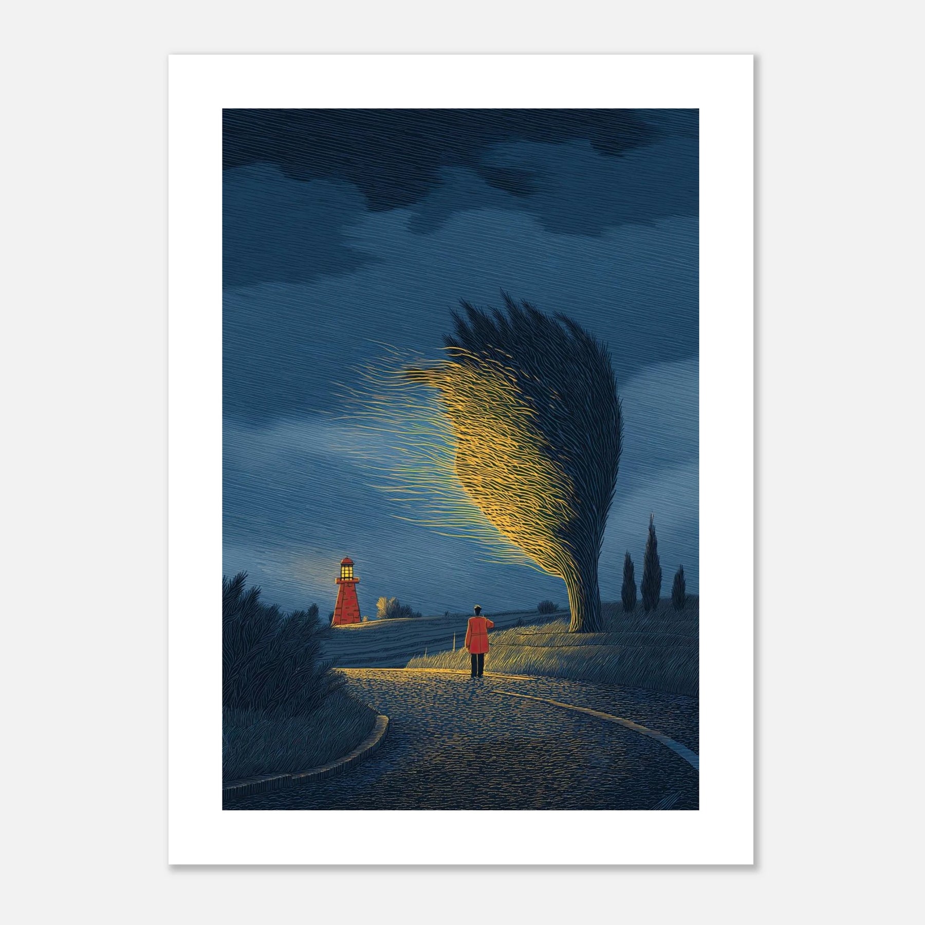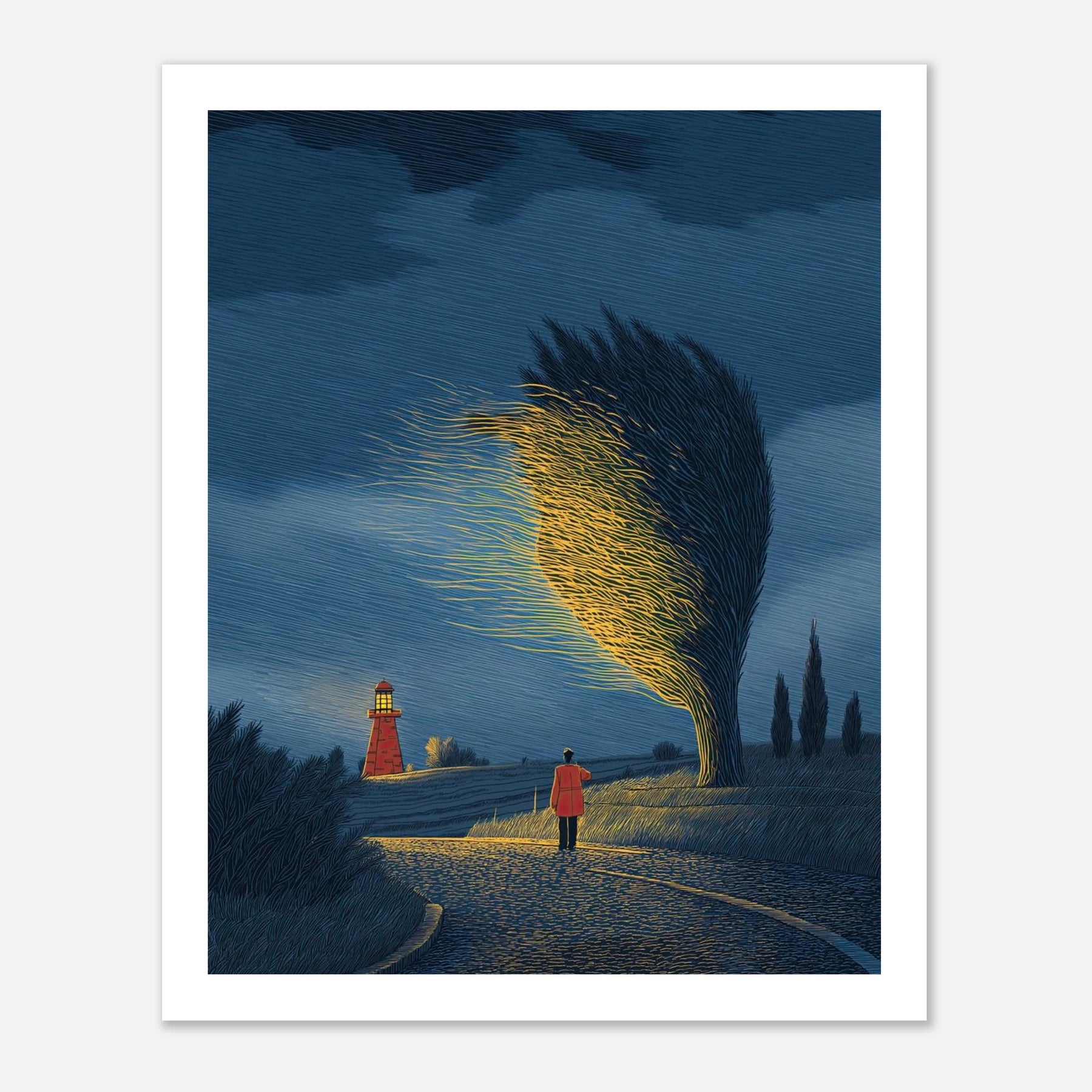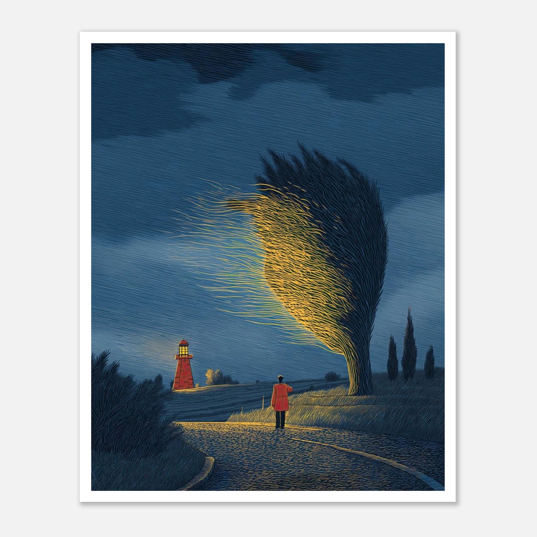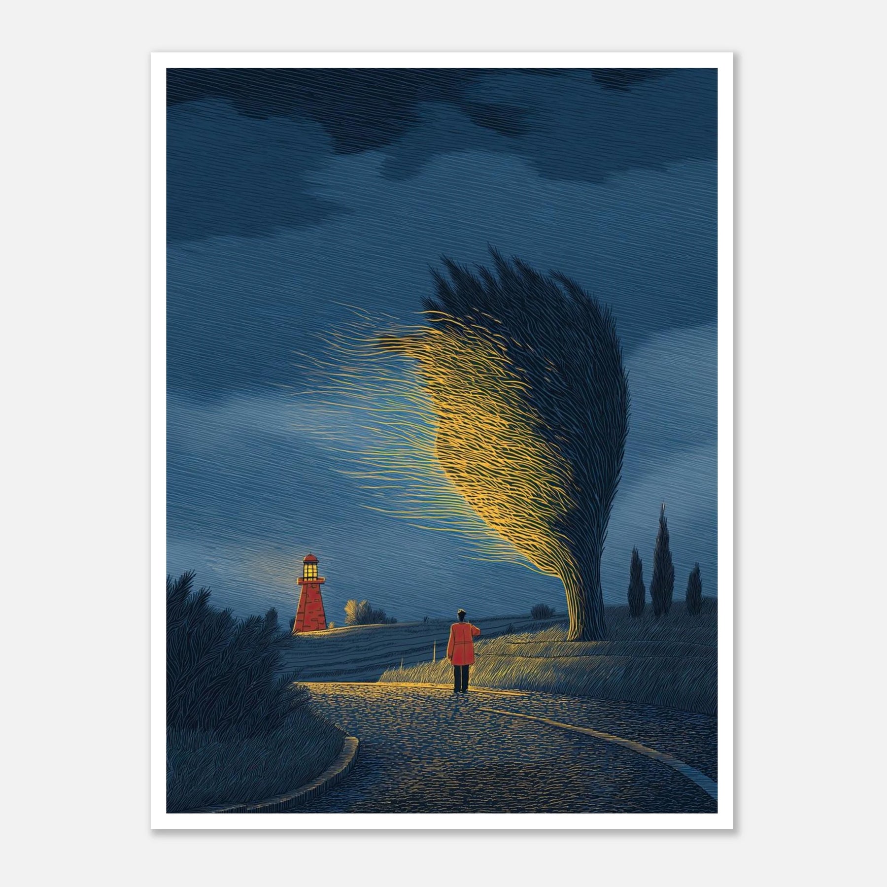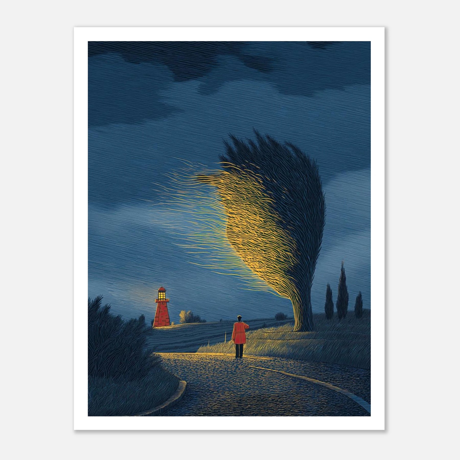 An atmospheric night scene where a lighthouse stands distant, yet a nearby windswept tree glows with an intense, ethereal light of its own. This piece captures the magic of the "Magnet Theory"—drawing your own path, trusting your intuition, and letting your own inner brilliance outshine external expectations.