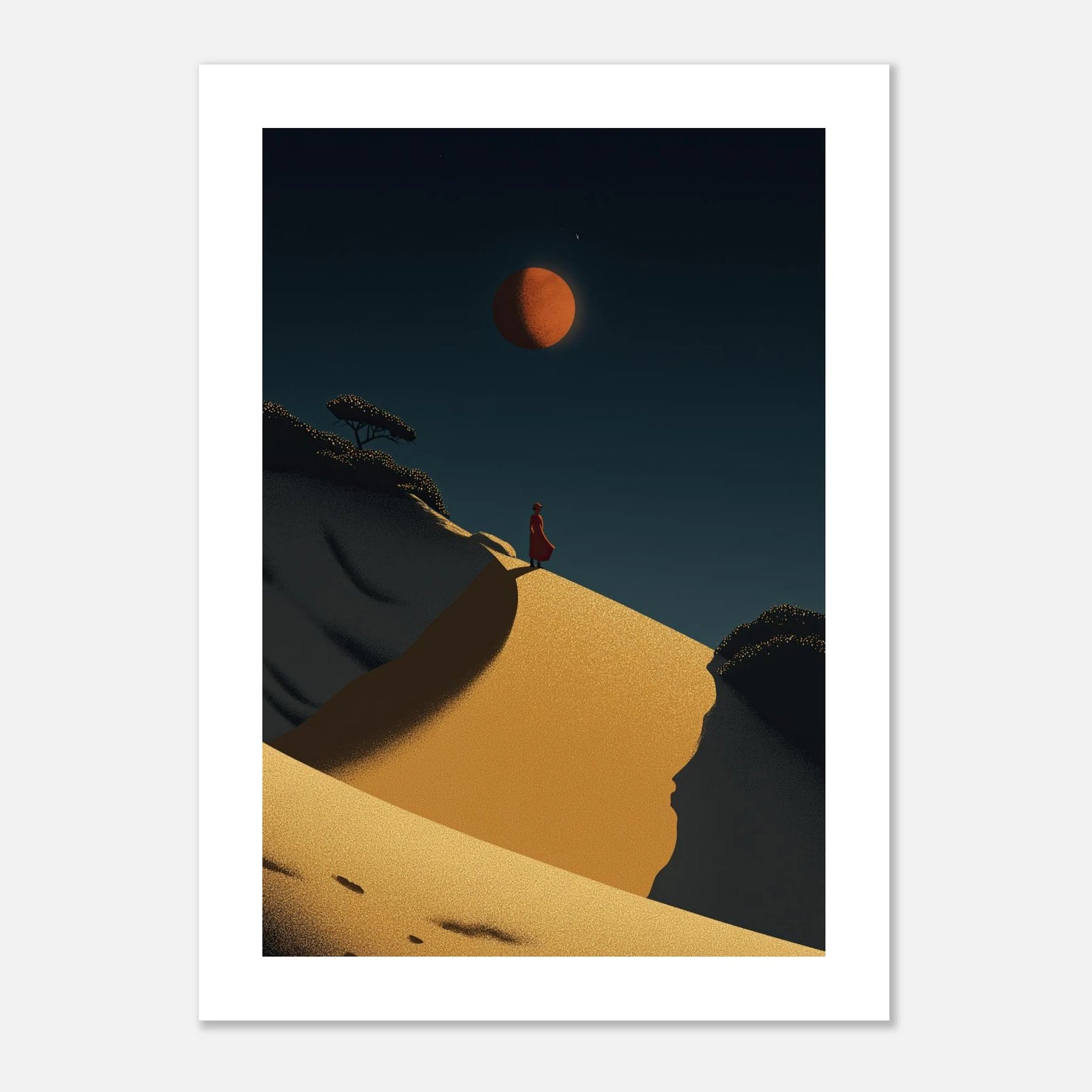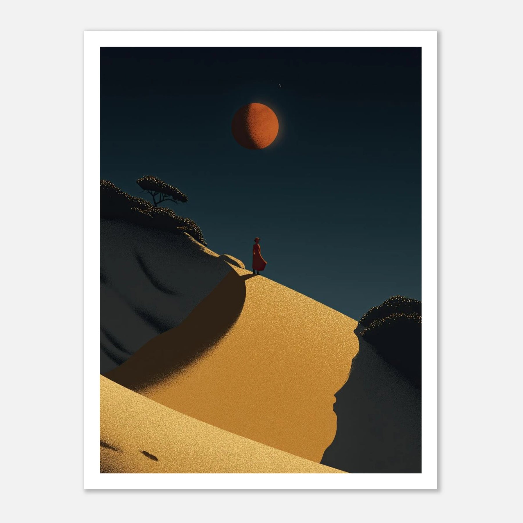 Bold, sweeping, and undeniably powerful. A lone silhouette stands atop a massive, golden sand dune beneath the glow of a deep crimson sun. The unique stippling and line work give the sweeping sands a tactile, three-dimensional quality. This artwork speaks to the summit of self-actualization—standing tall in your own truth, comfortable in your solitude, and completely at peace with the world below.