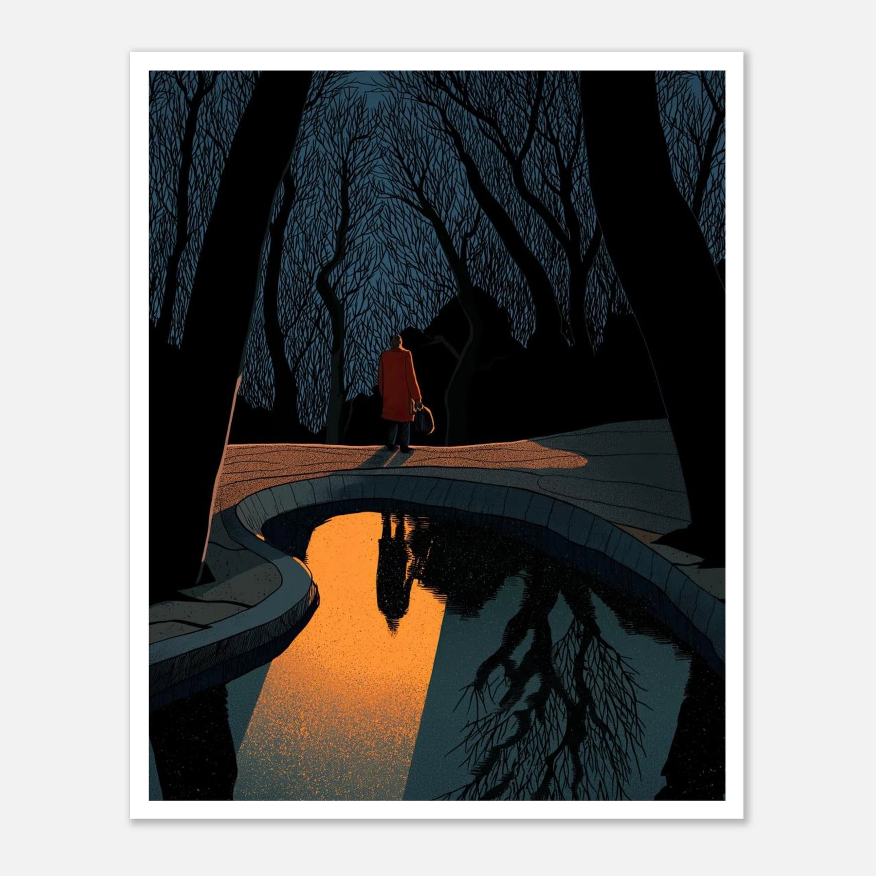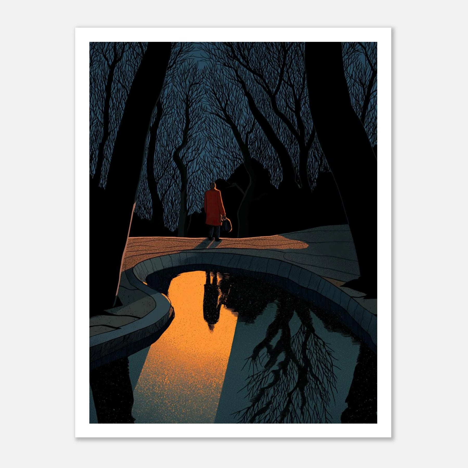 Surrounded by the dark intricacies of a dormant forest, a pristine pool captures a brilliant, golden reflection. This striking piece speaks to the crystal clarity that comes from establishing inner peace, and the boundaries we set to protect our own radiant energy.