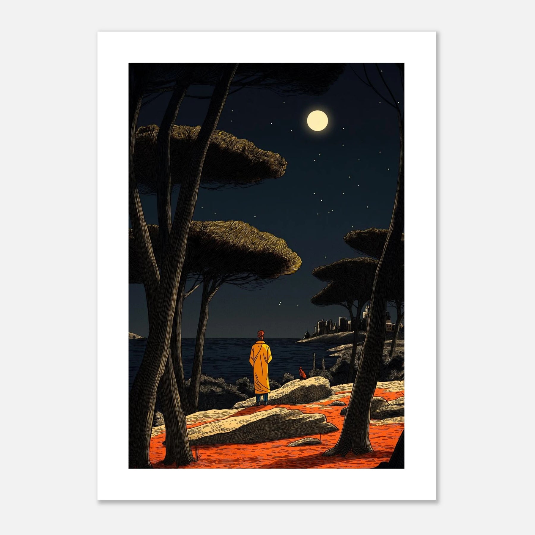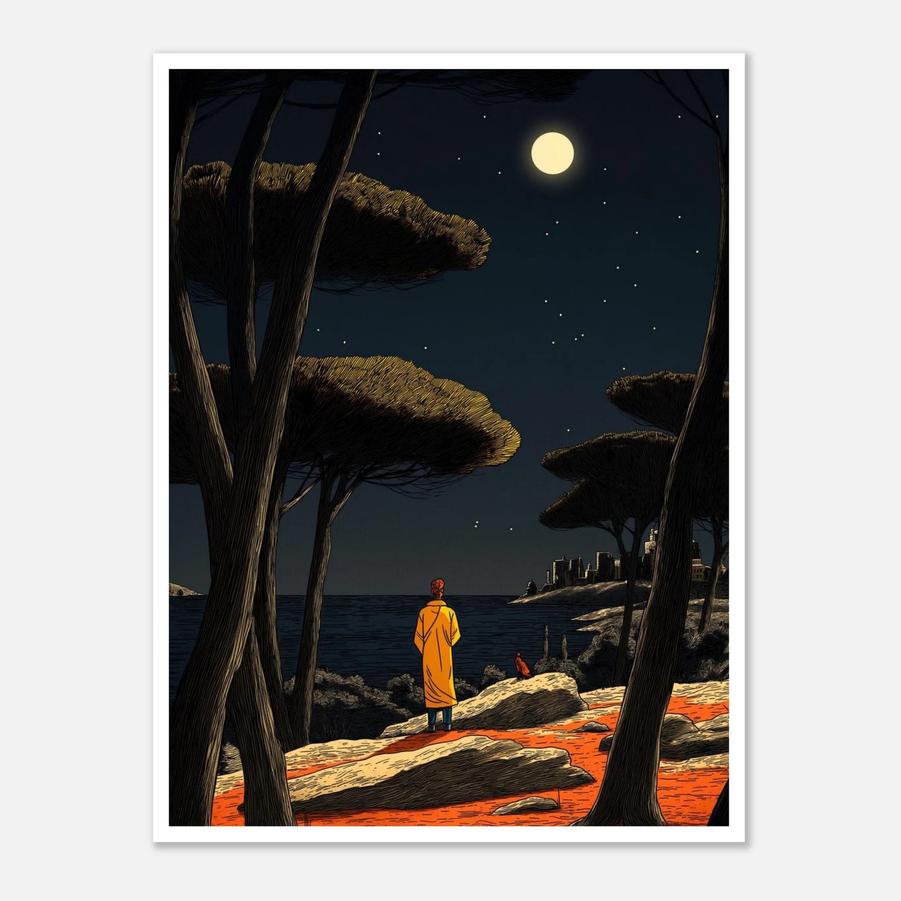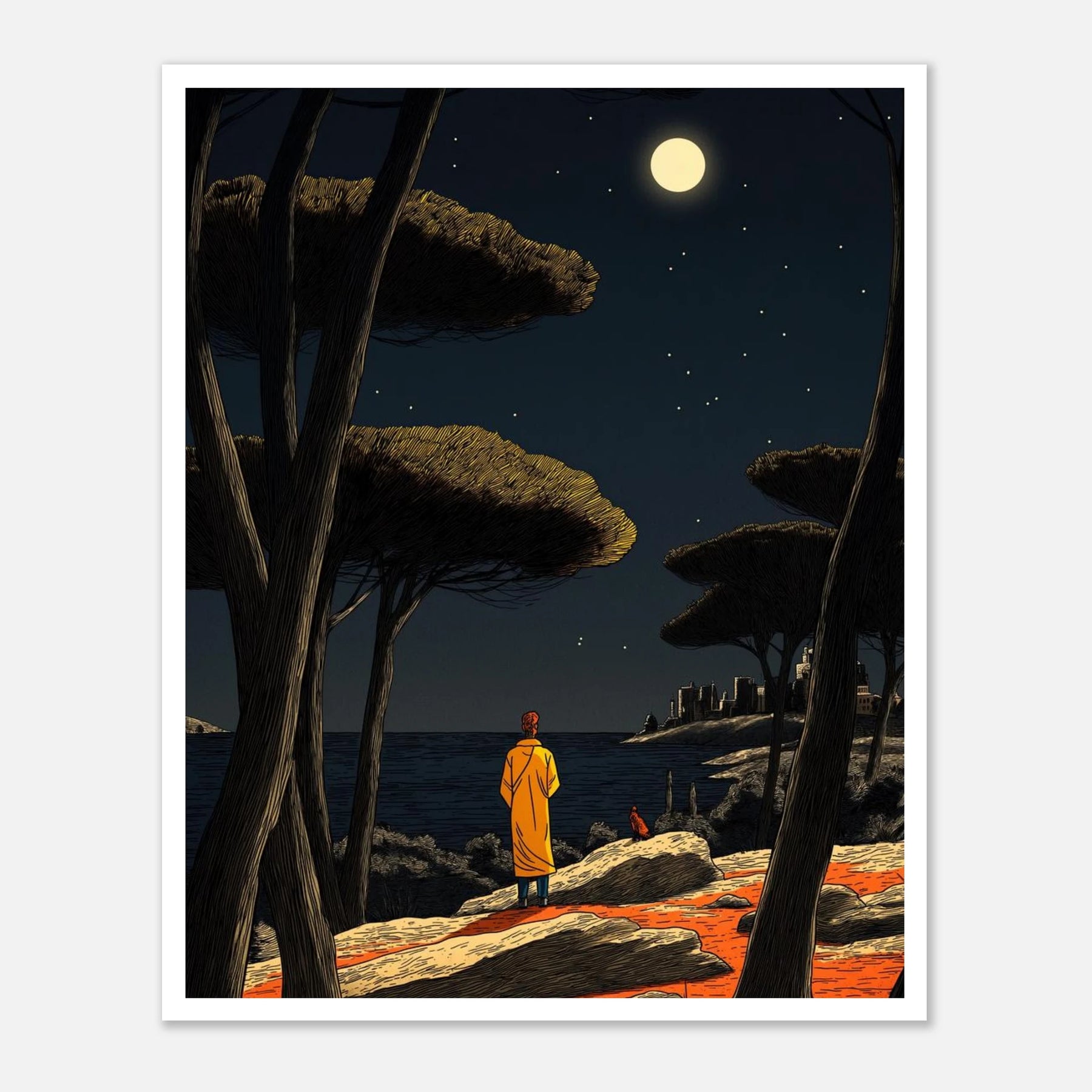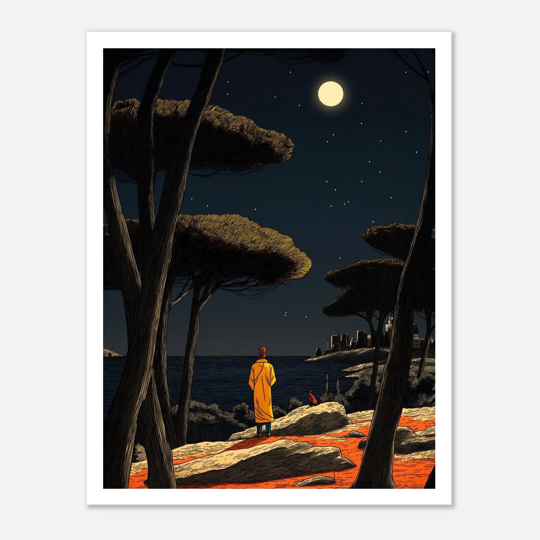 This intricate scratchboard-style landscape perfectly reflects the "Moon Theory." The bright lunar glow casting light over the dark waters represents the peace found in taking a step back. It celebrates the act of observing the world without getting lost in its noise, making it an ideal centerpiece for resting in your own quiet truth.