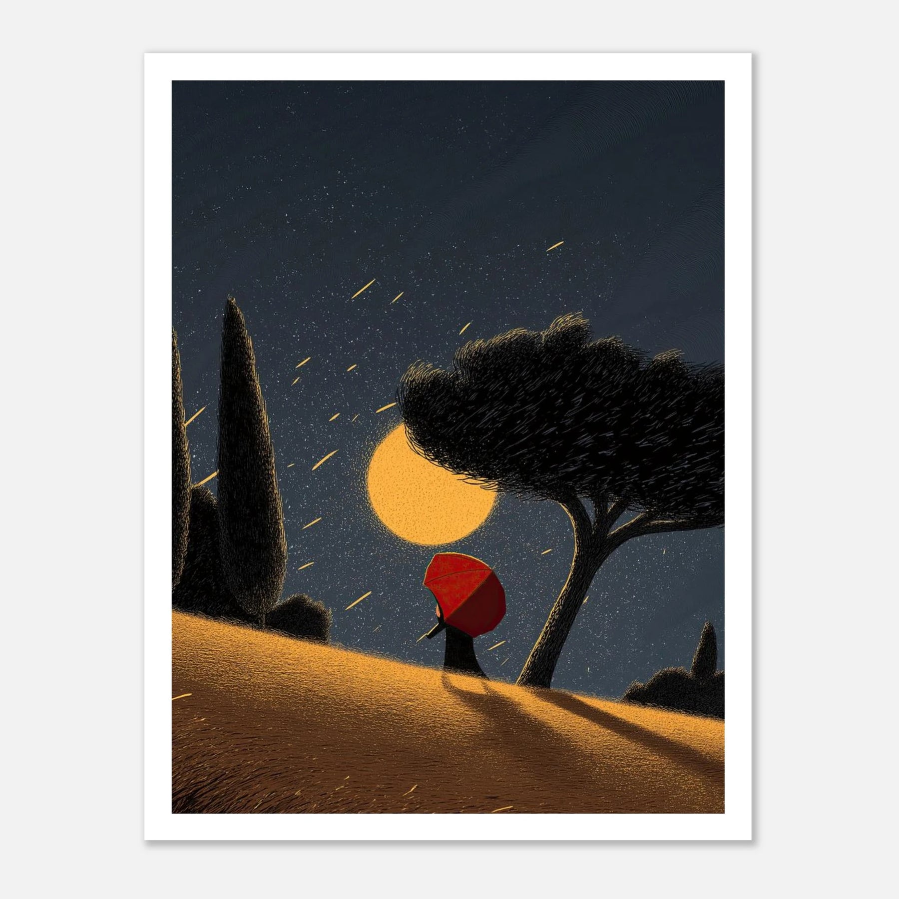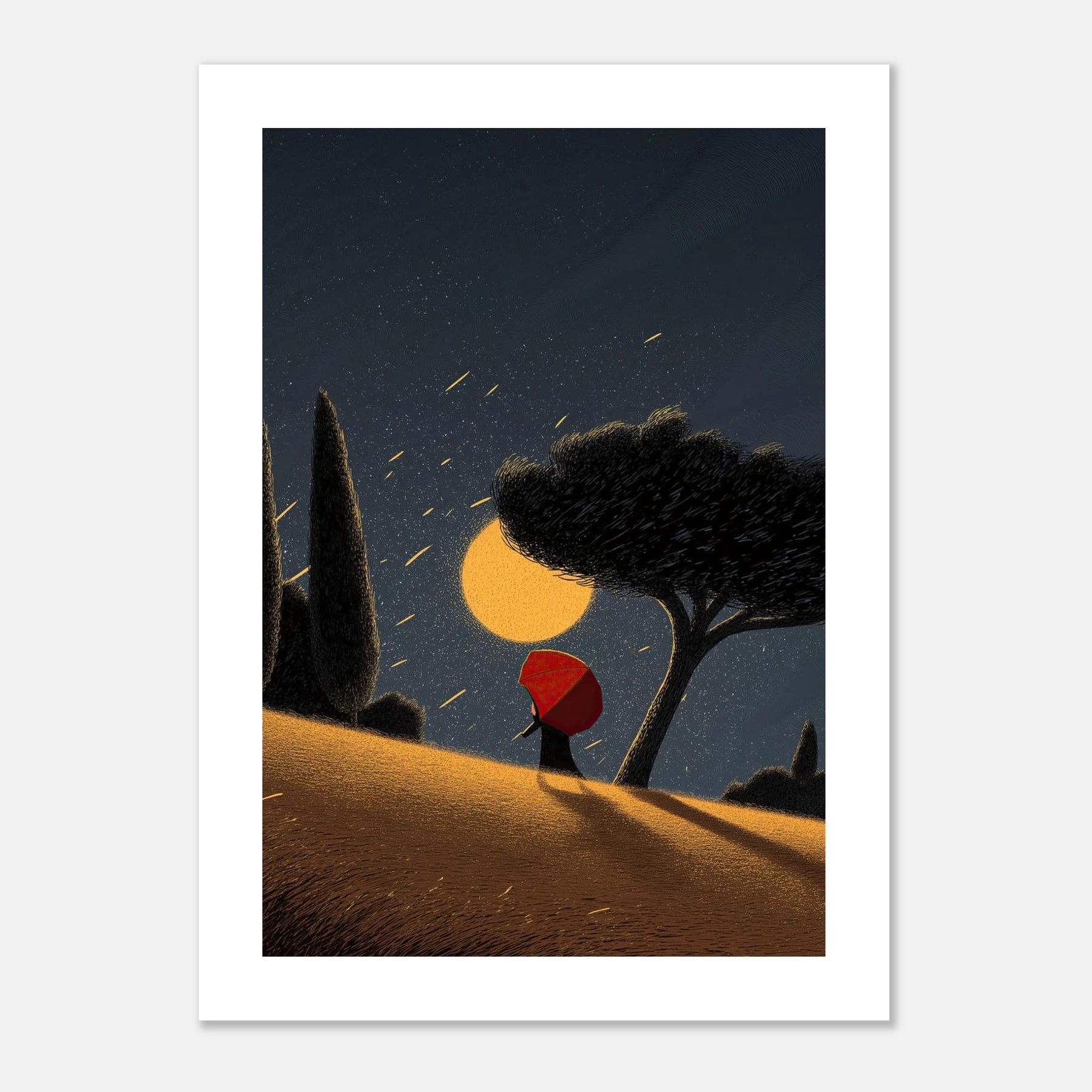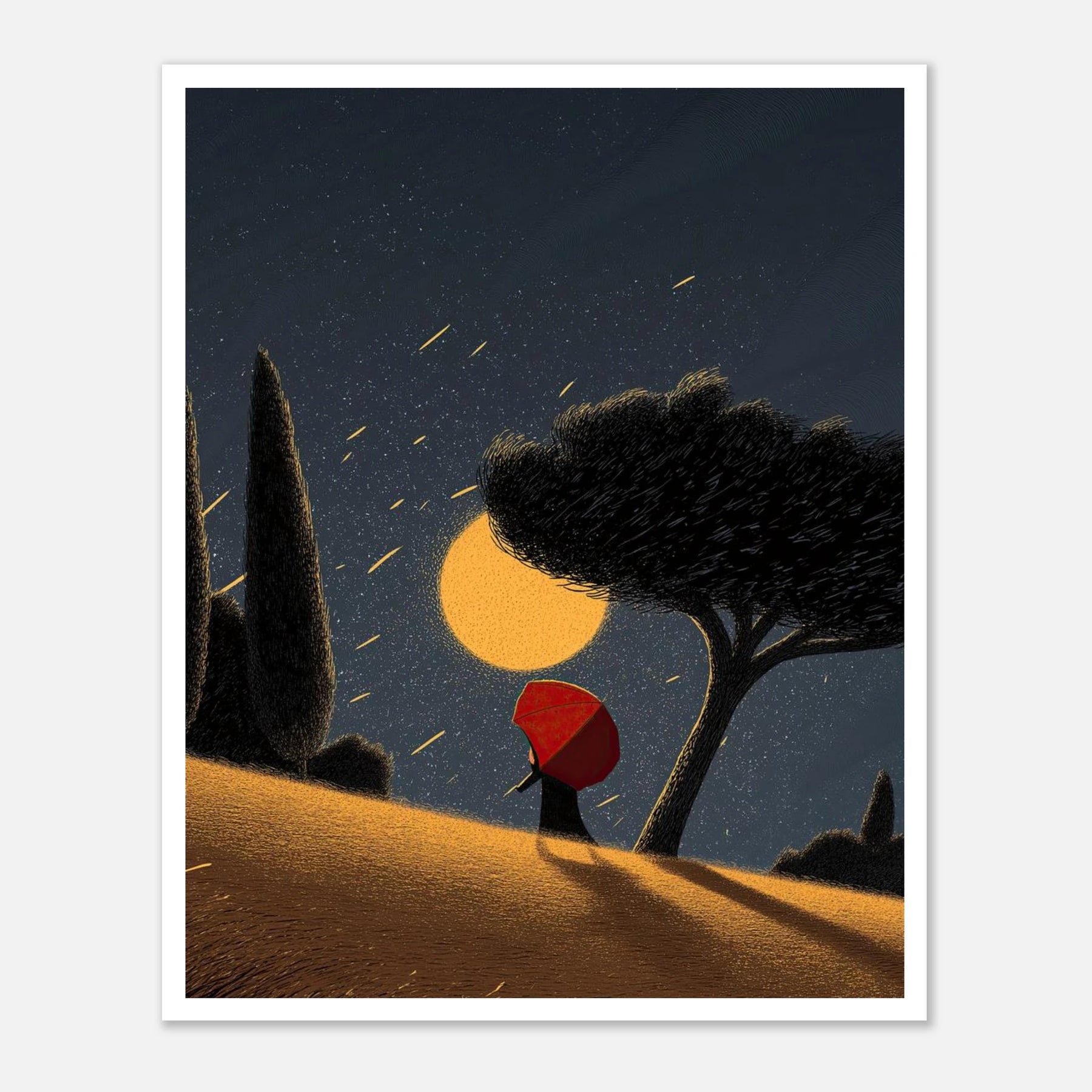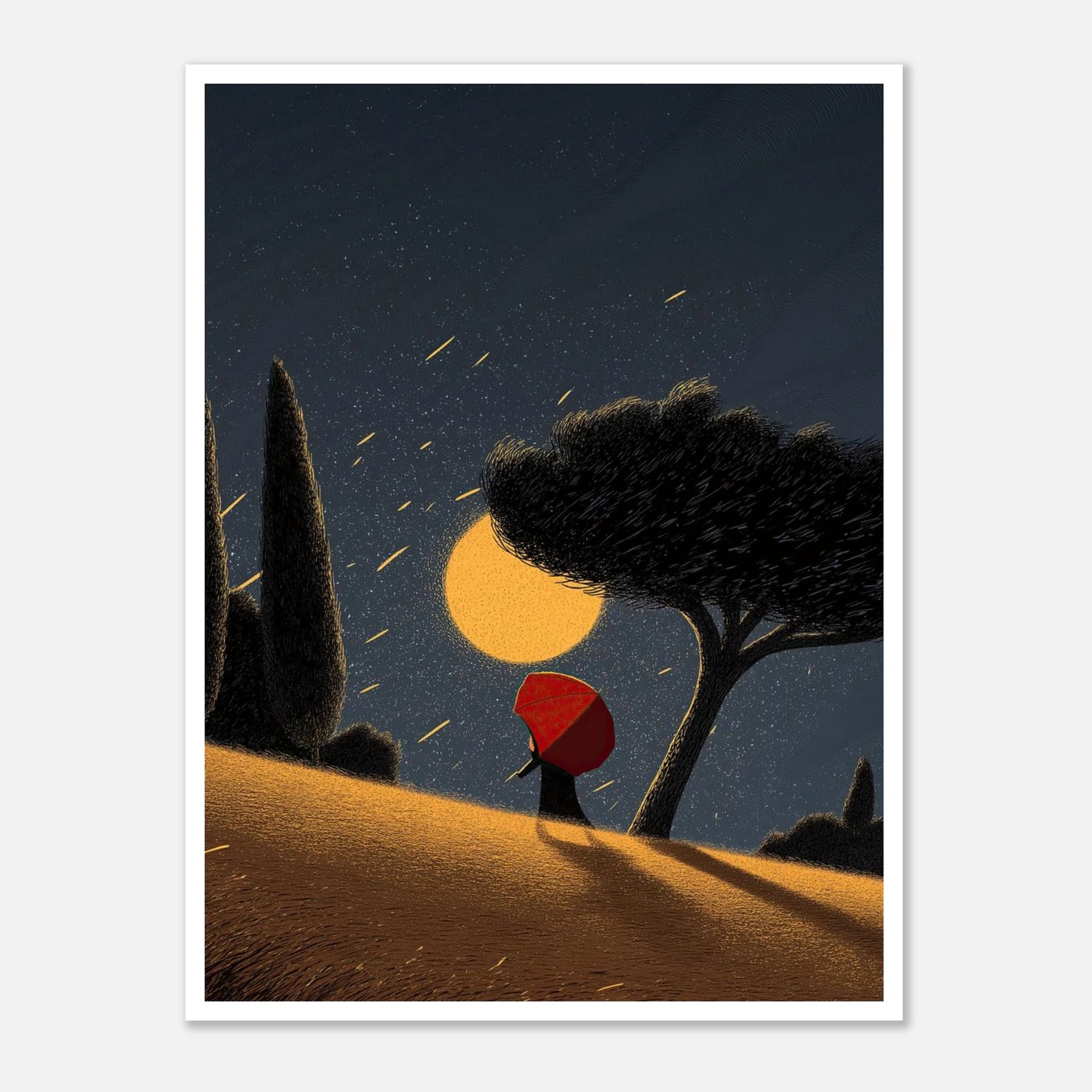 A magical ascent into the night. This dynamic poster illustrates a figure with a red umbrella climbing a golden, sweeping hill toward a massive, glowing celestial sphere. With shooting stars raining down from the deep blue sky, this artwork evokes a sense of hope, journey, and the magic of the cosmos.