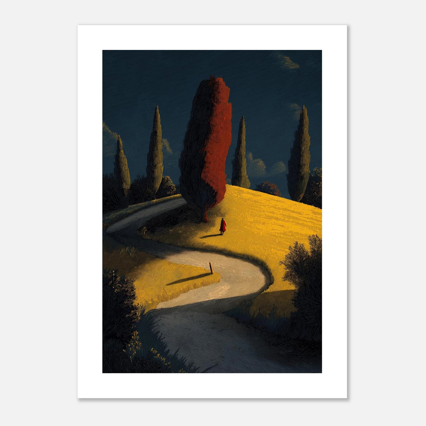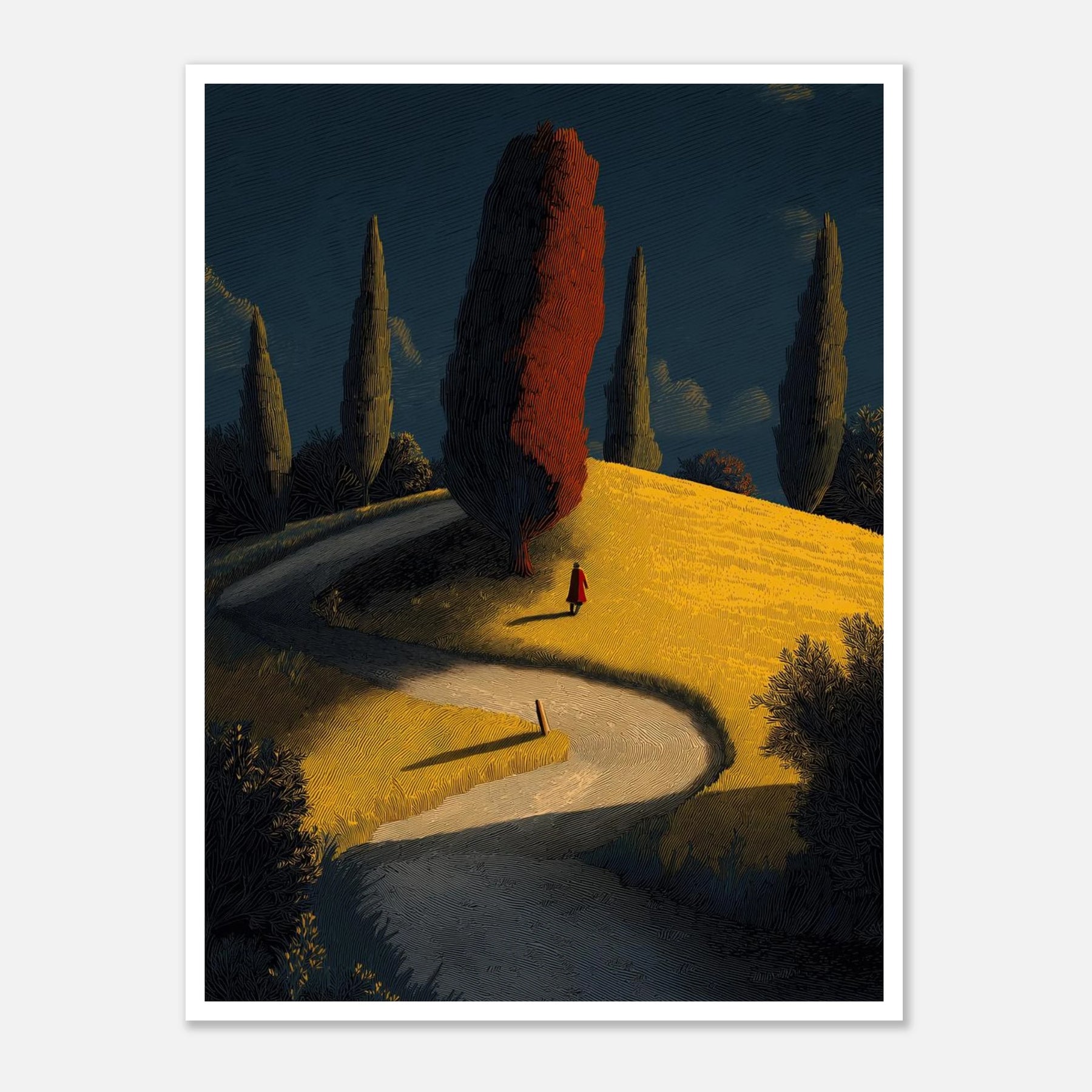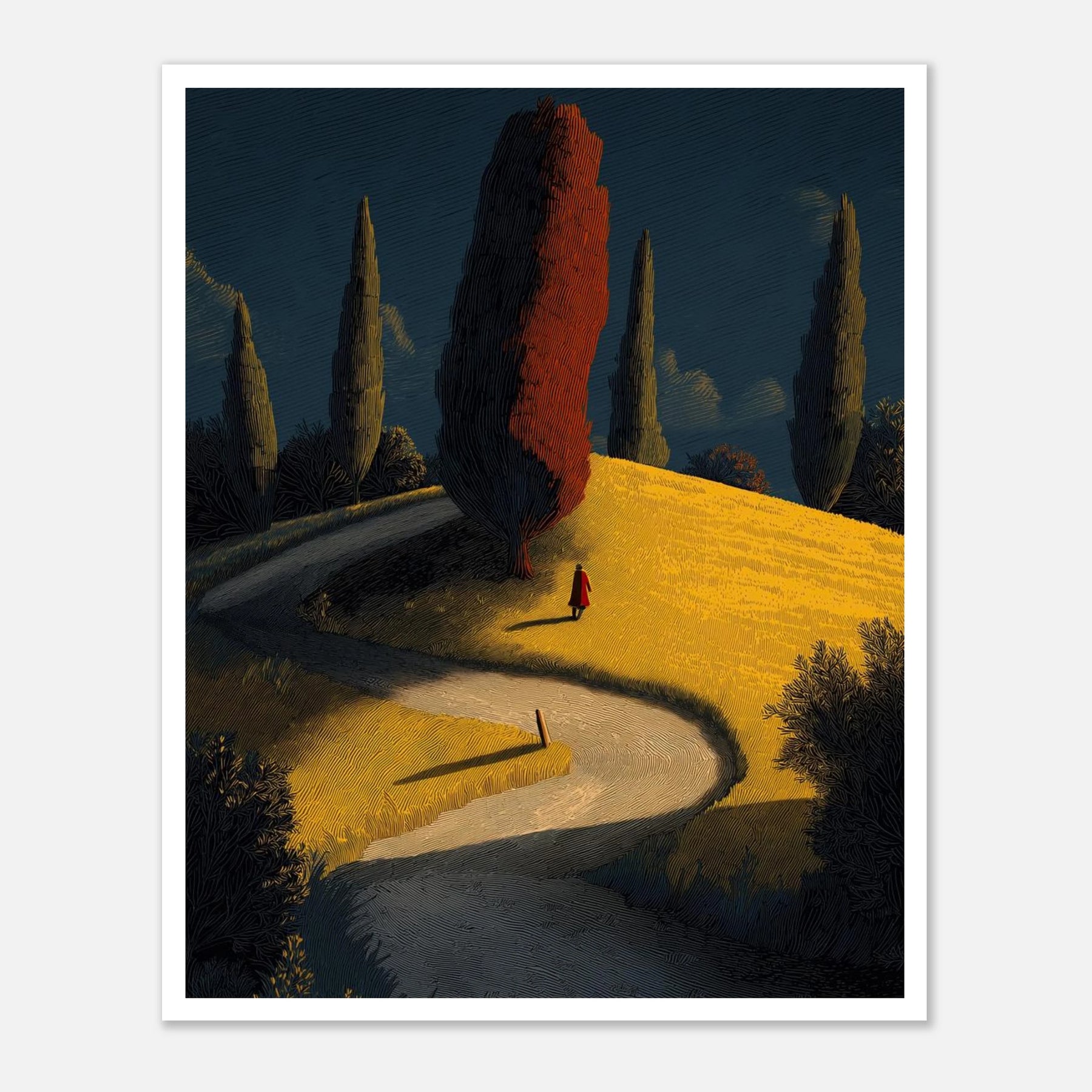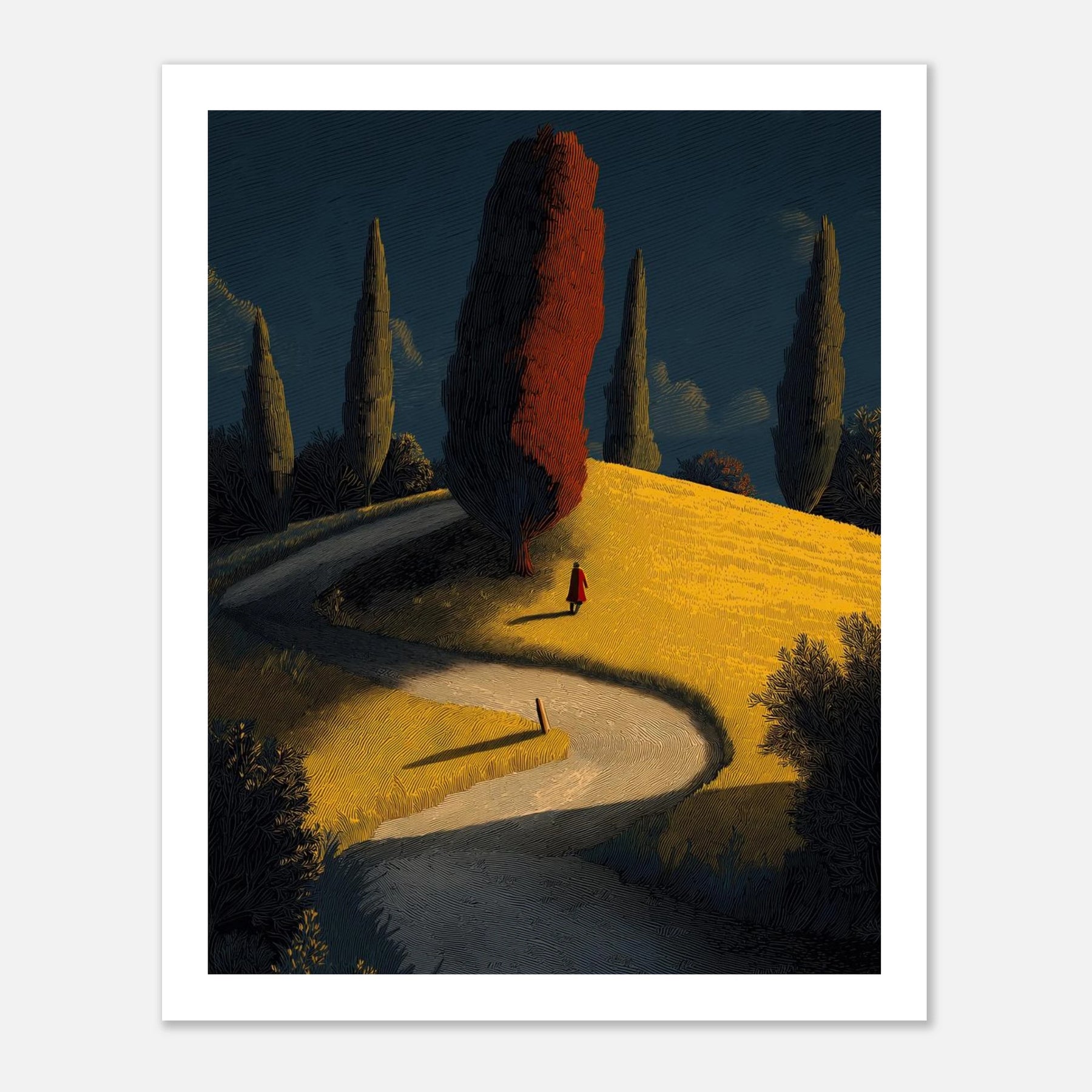 A winding road leads the eye toward a solitary red tree atop a golden hill. The stark, vertical cypress trees and the lone figure in red create a sense of cinematic journeying. Its vibrant yellow and deep teal palette offers a sophisticated take on pastoral landscapes.