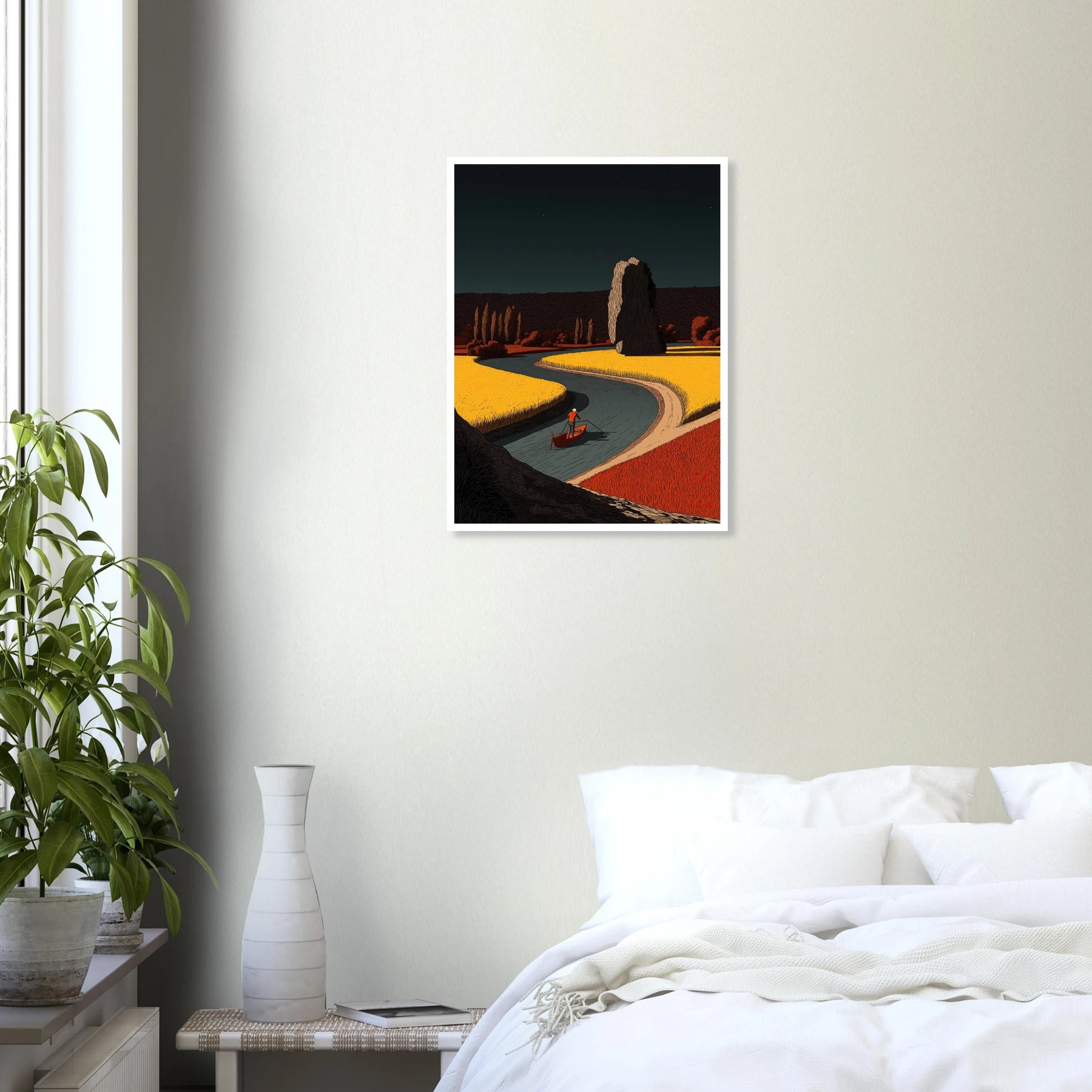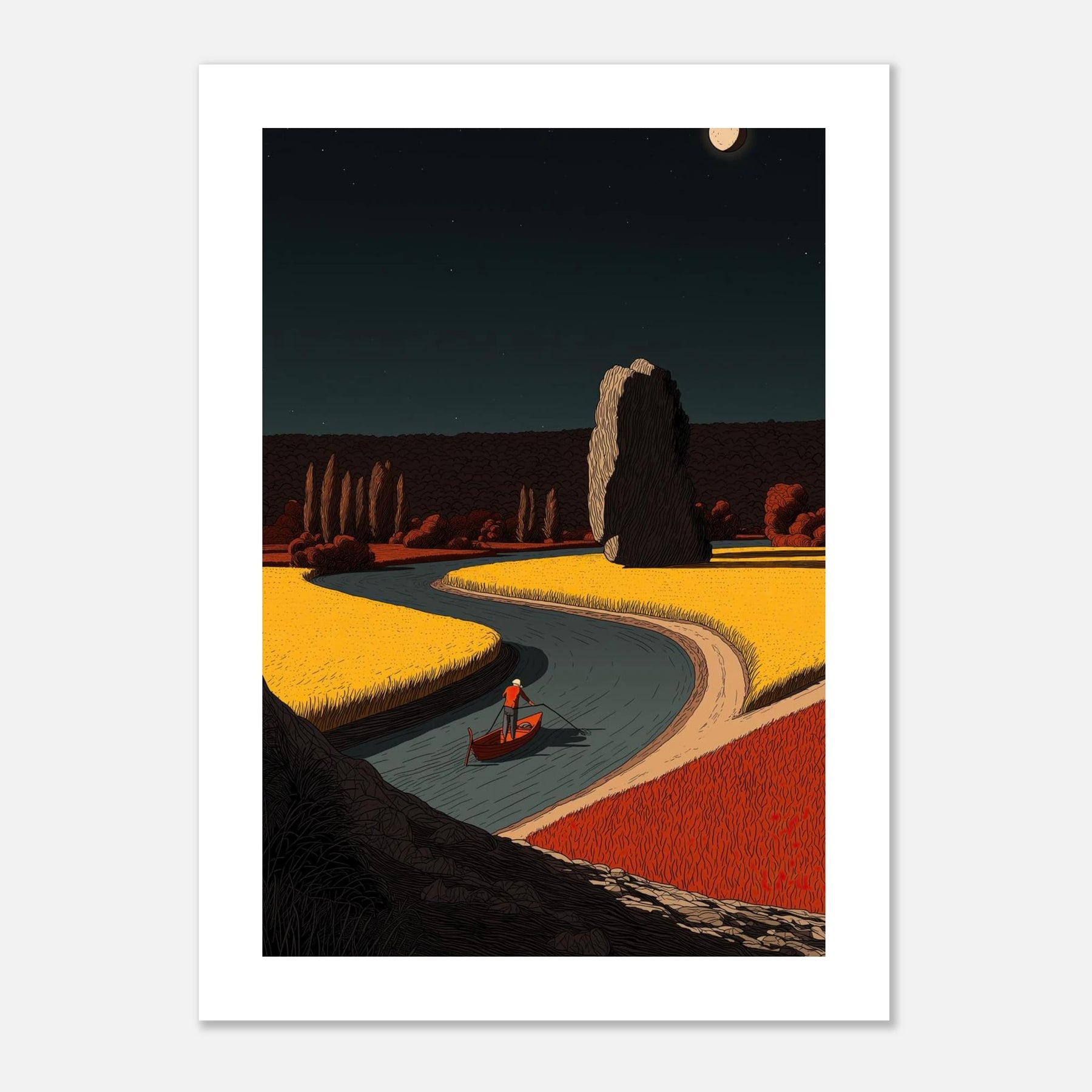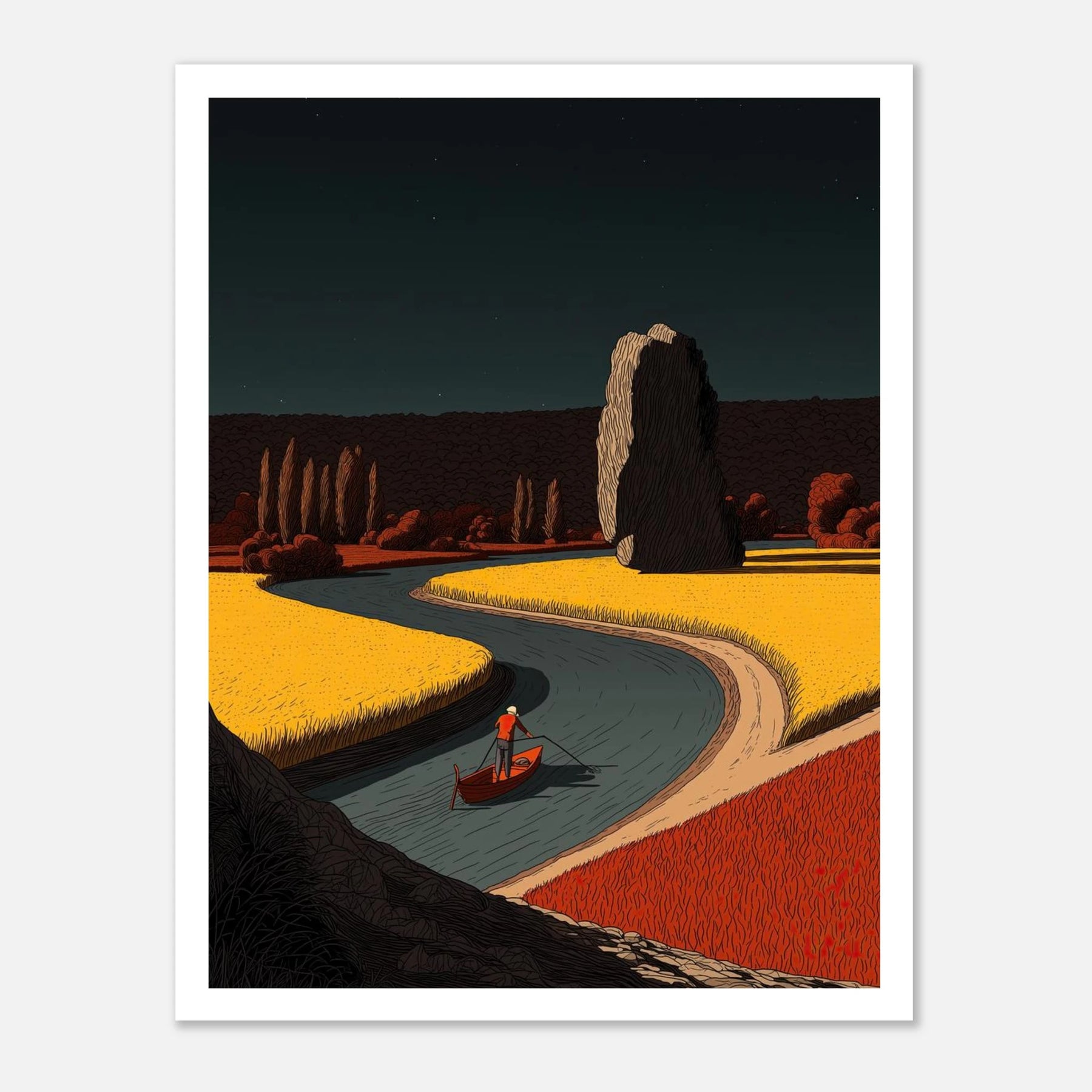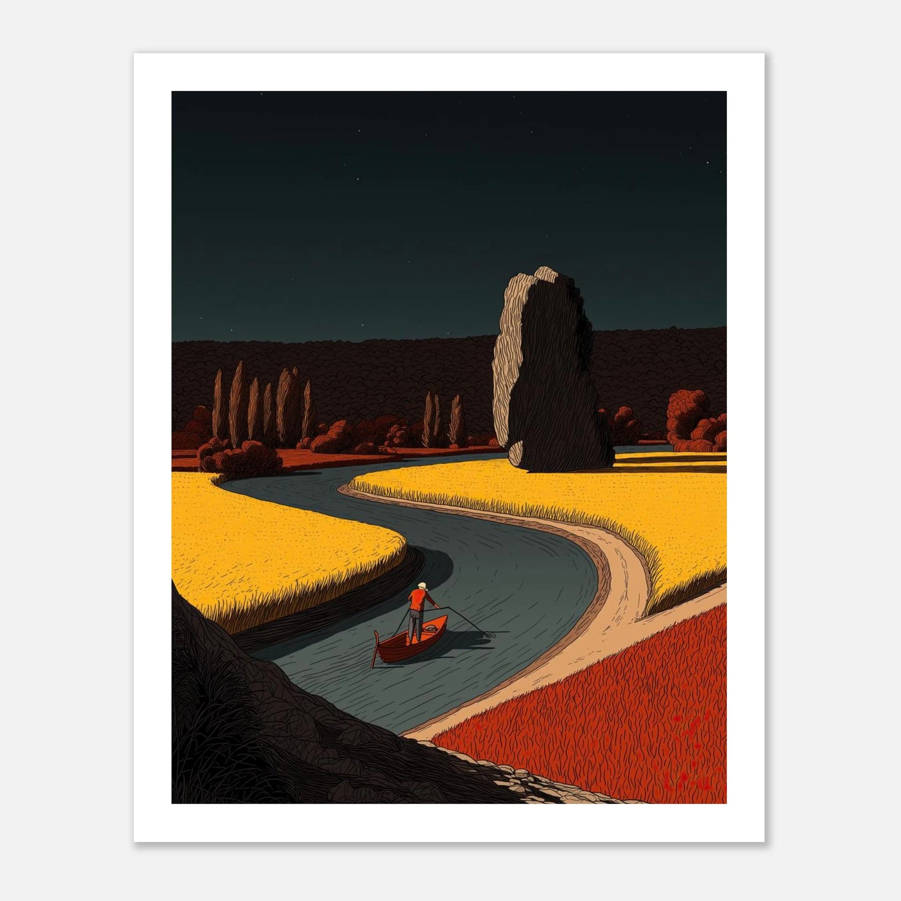 A small boat drifts down a winding river, cutting through bright yellow and red fields past a giant standing stone. This poster is a great daily reminder to stop fighting the current and just let life take you where you need to go.
