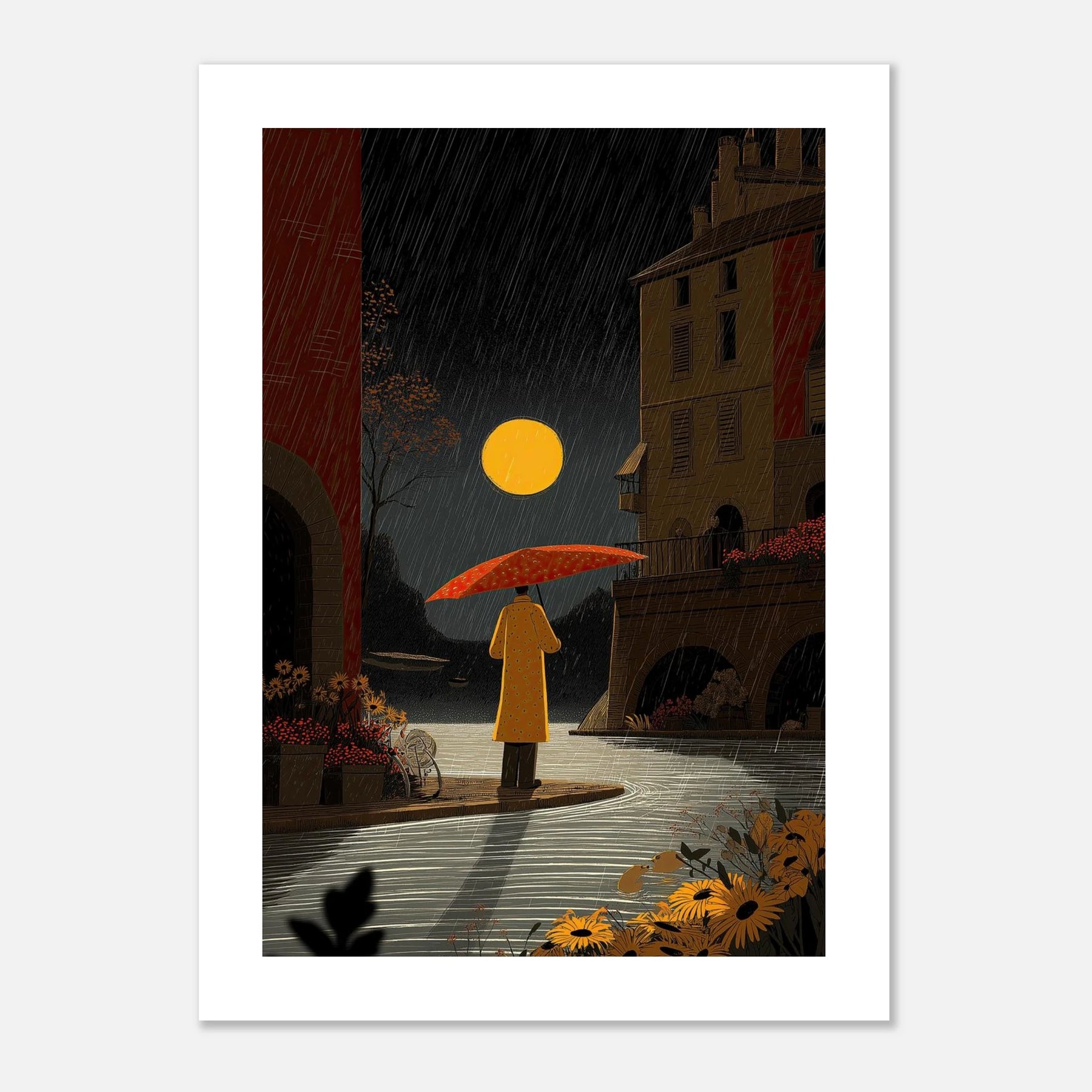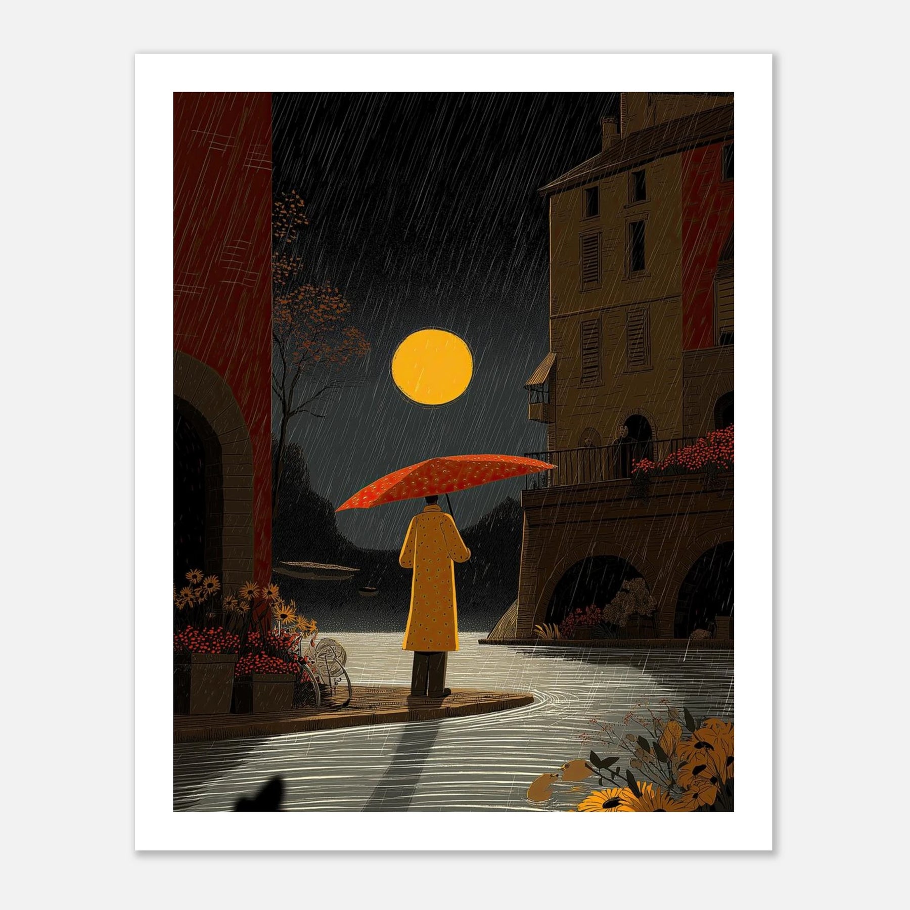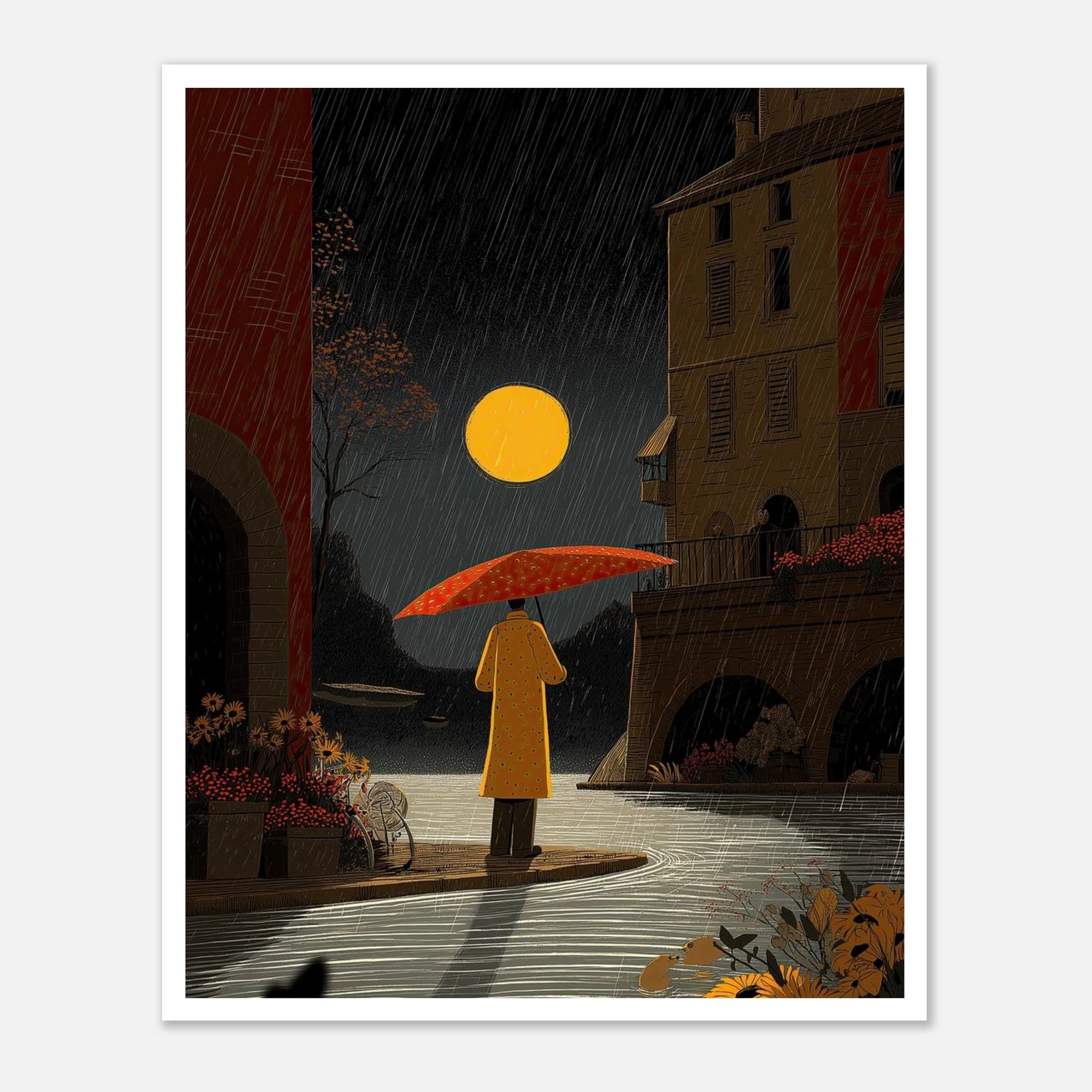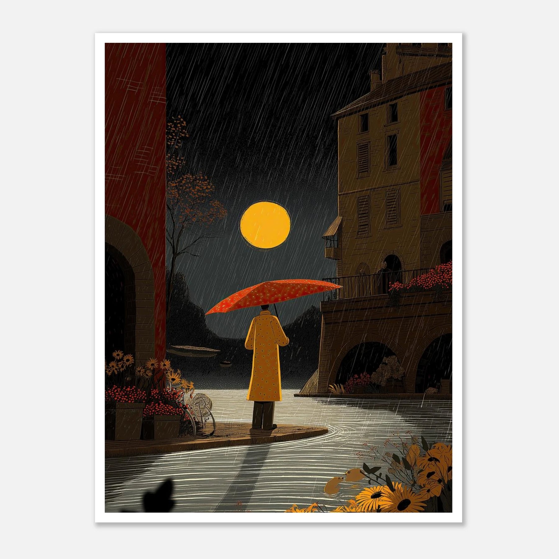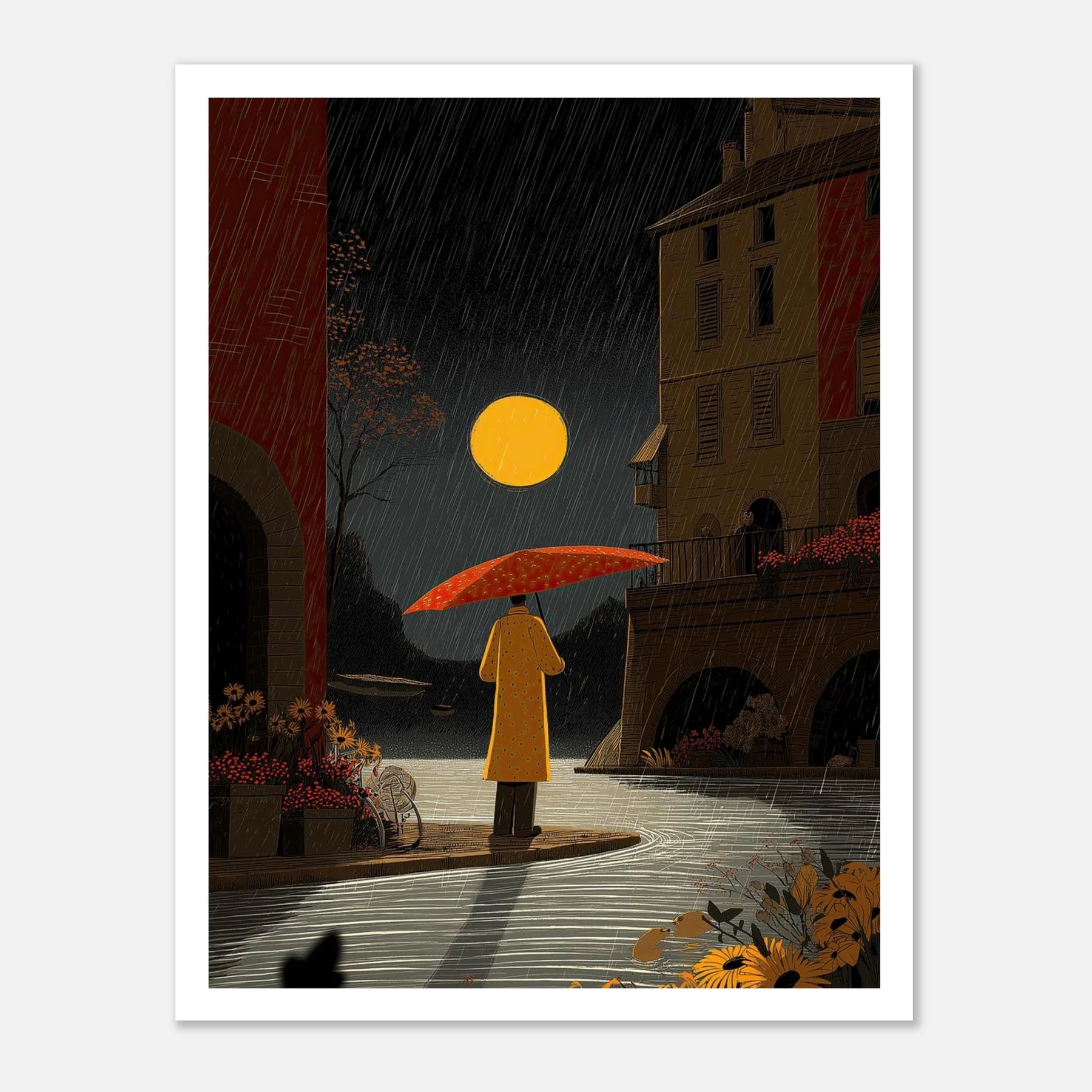 Under a striking full moon, a figure in a yellow coat finds a moment of pause by a quiet canal. The intricate linework beautifully captures the falling rain, the texture of the old stone architecture, and the vivid foreground flowers, creating a scene of urban tranquility.