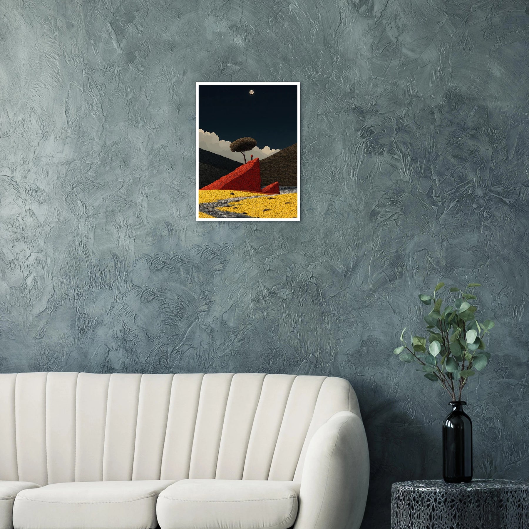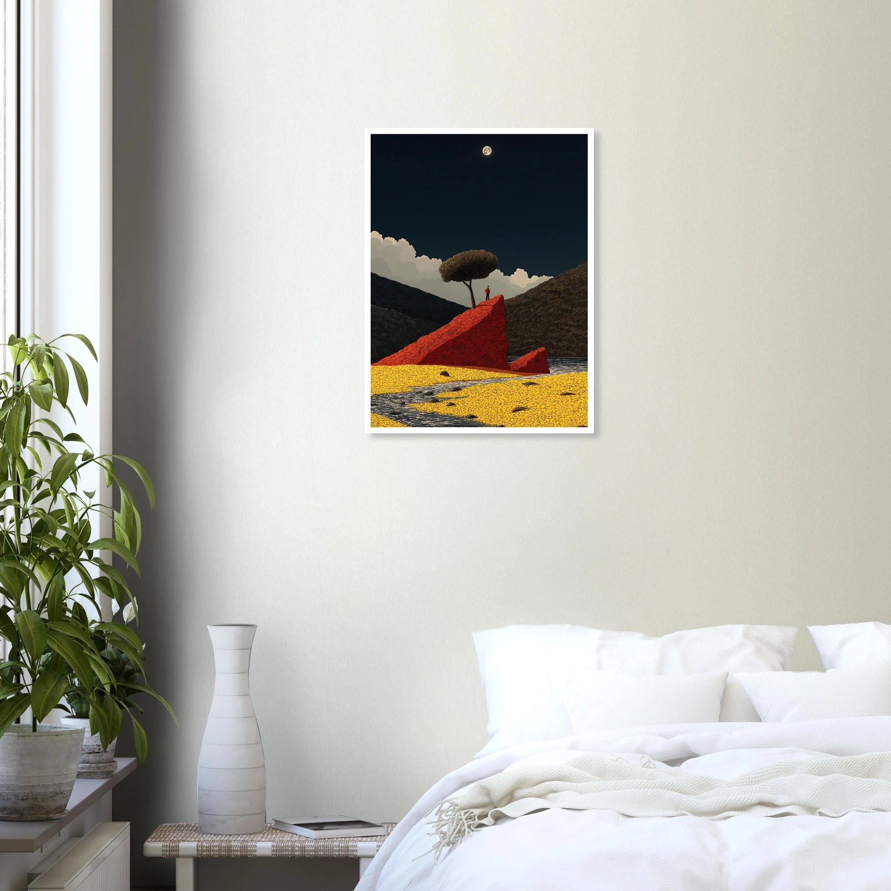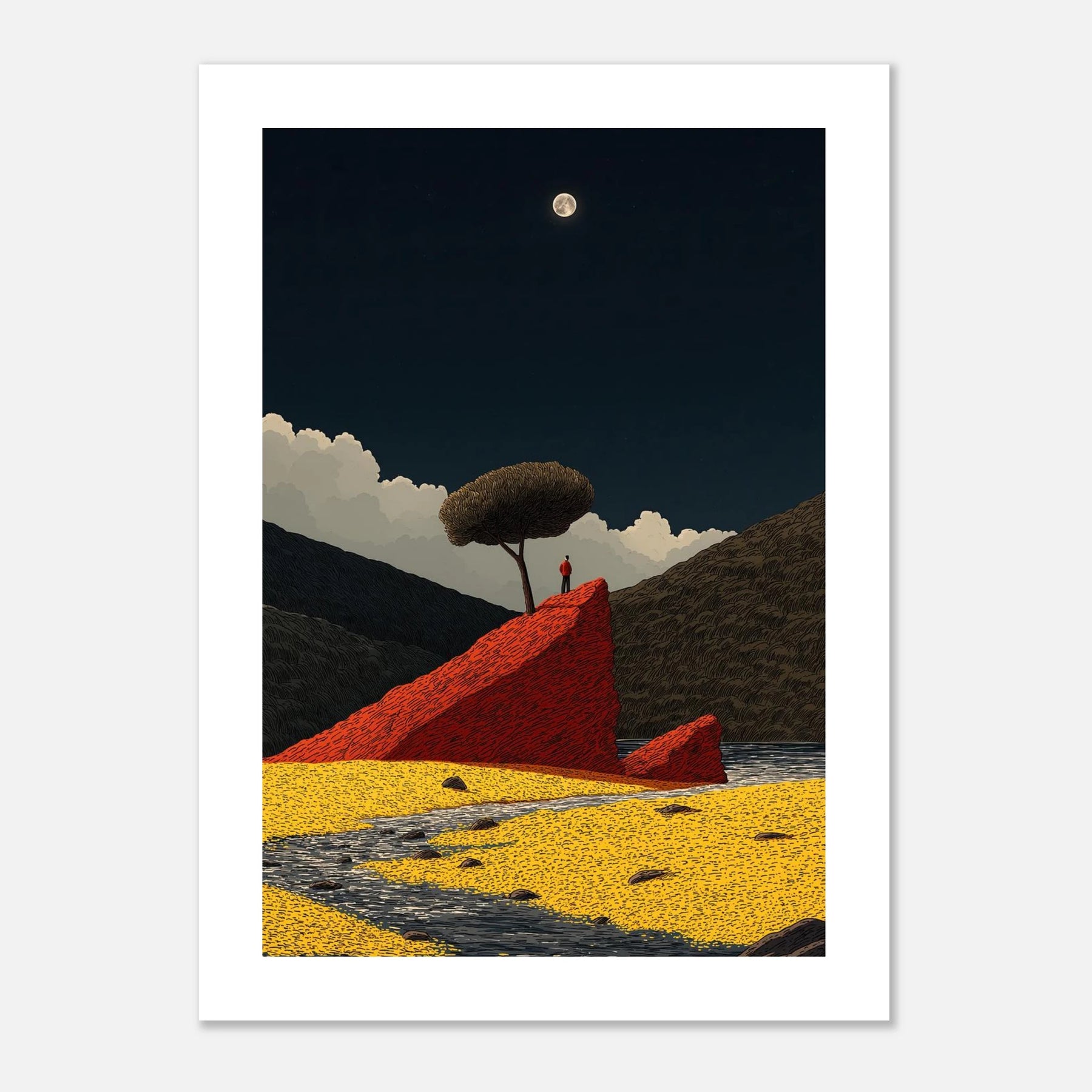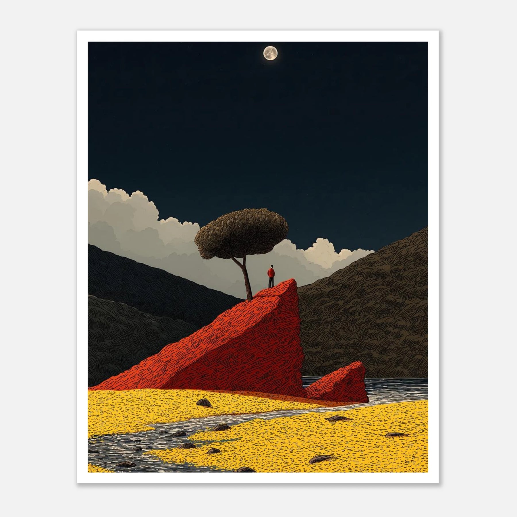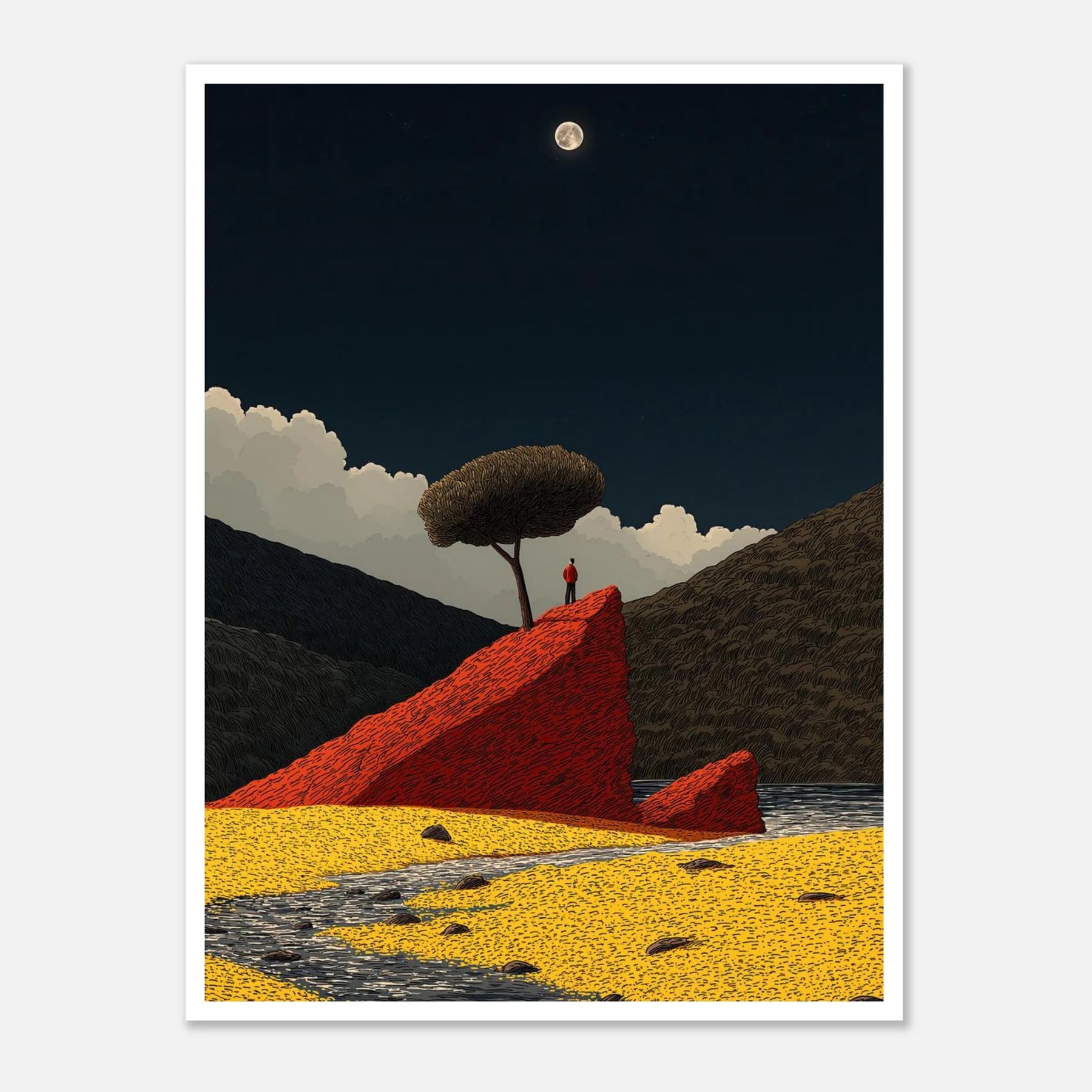 Sometimes, you just need to stand alone to see the whole picture. This poster shows a person taking a quiet moment on a bold red rock under the light of the moon. It is a daily reminder to find your own firm ground and enjoy the stillness.