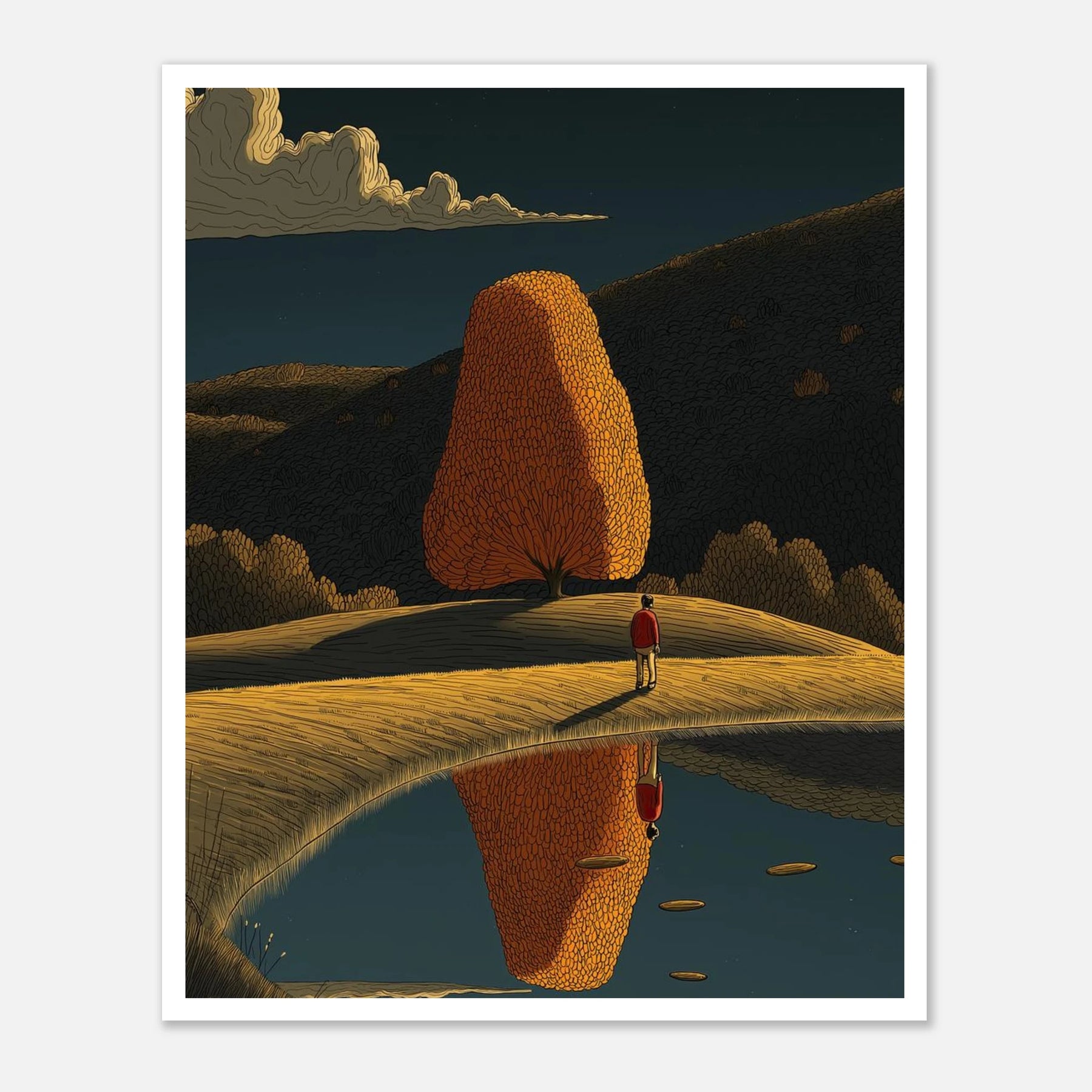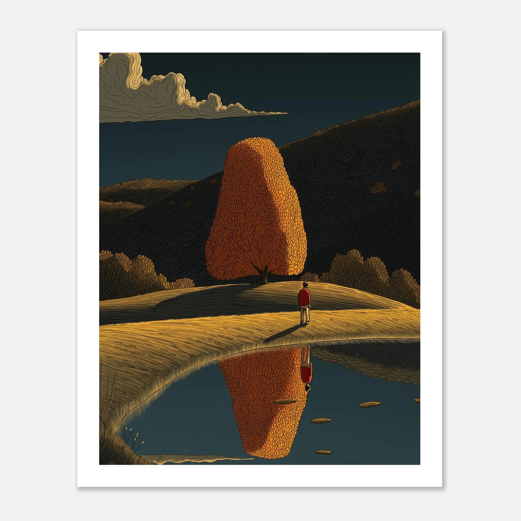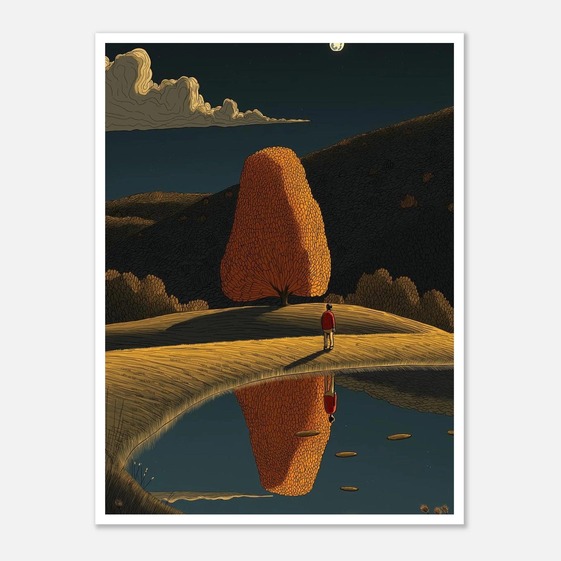 Perfect symmetry meets autumn warmth. A lone figure stands on a ridge, admiring a glowing, teardrop-shaped tree that is flawlessly mirrored in the calm waters below. Set beneath a full moon, this print is a masterpiece of balance and tranquility, designed to bring a calming presence to any room.