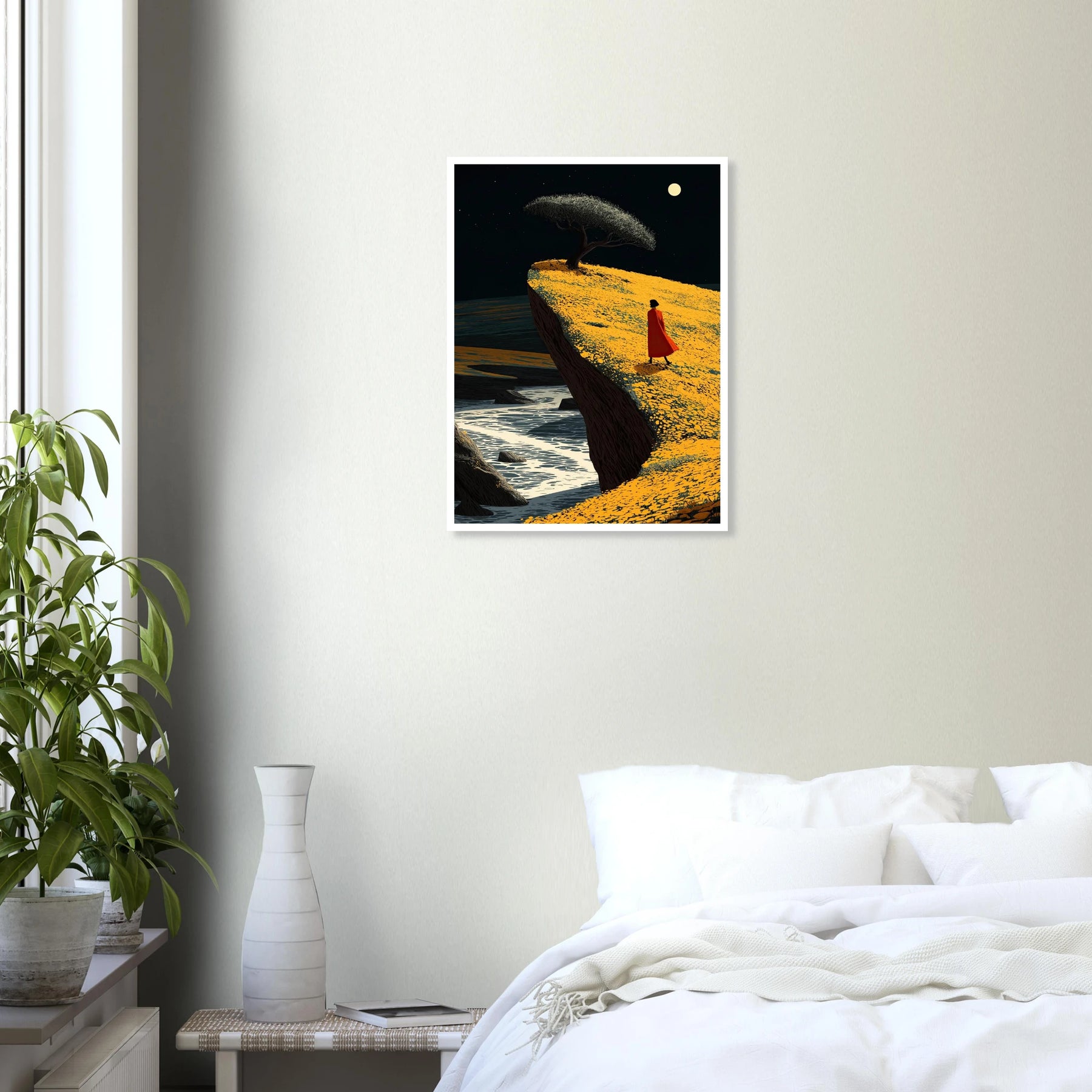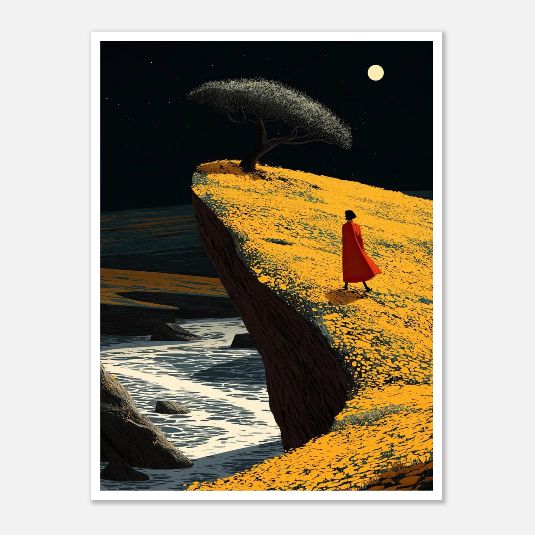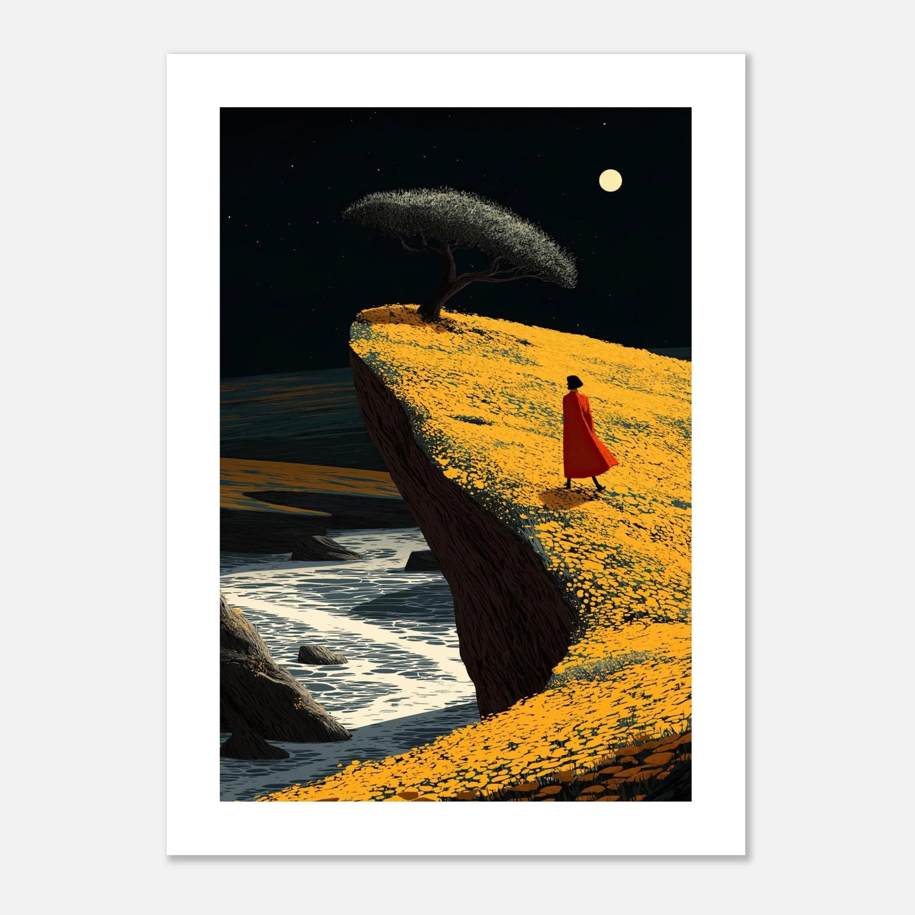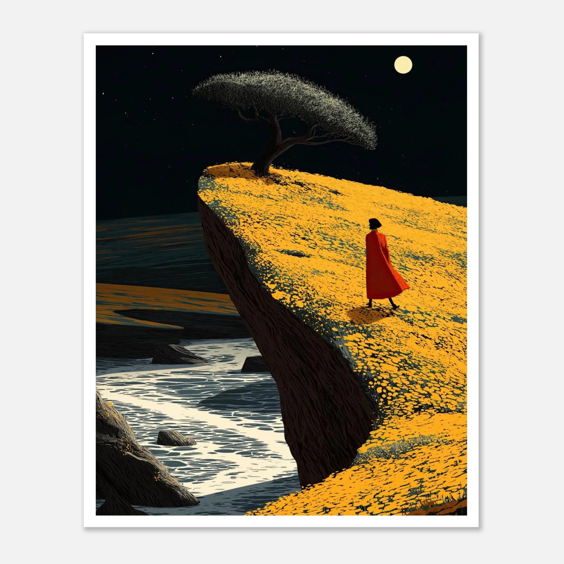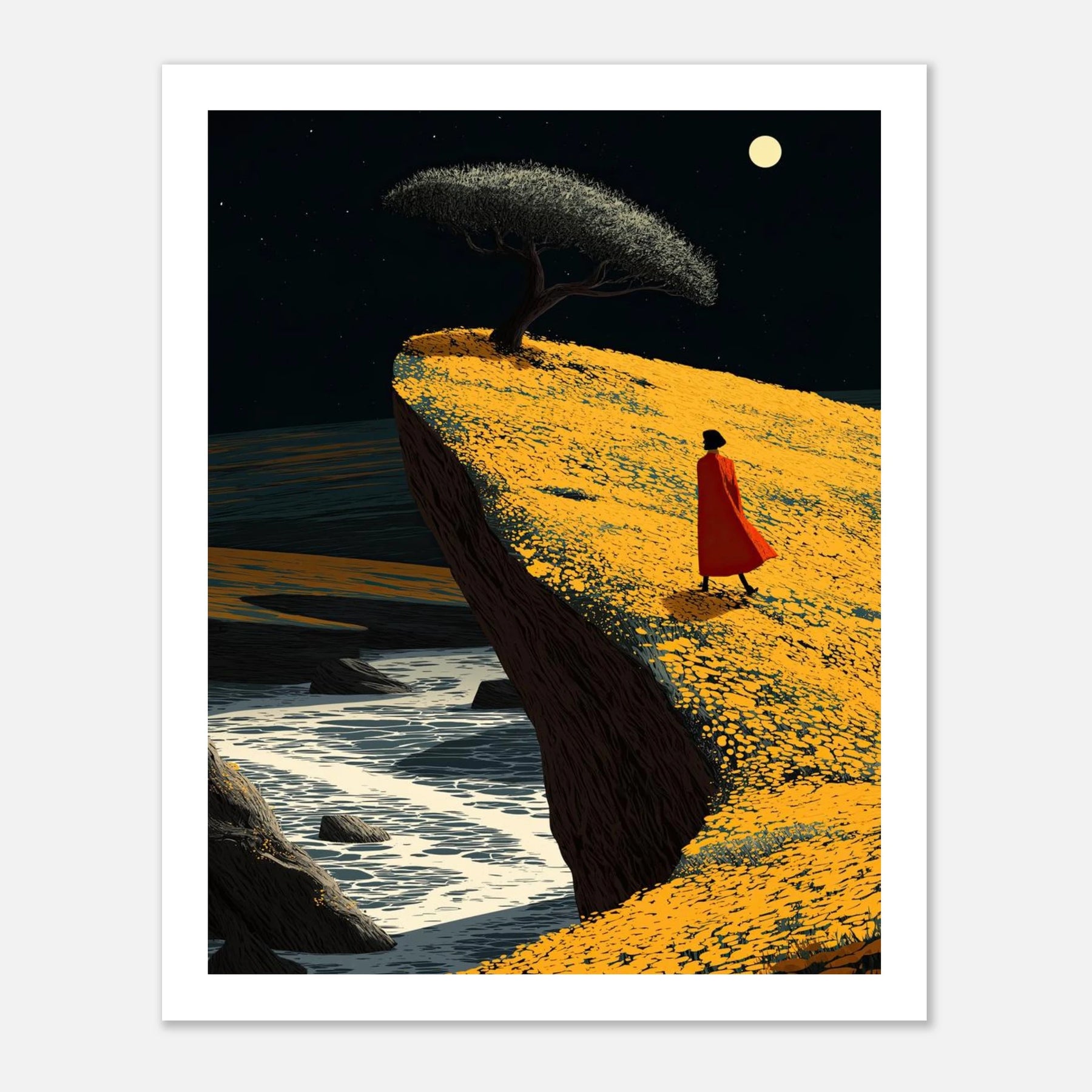 A person in a red cloak walks along a bright yellow cliff above the moving water. A single tree stands against the night sky. This piece is all about moving forward with confidence and trusting your path, no matter how close to the edge you feel.