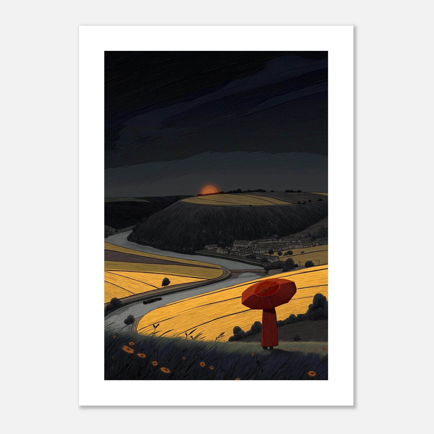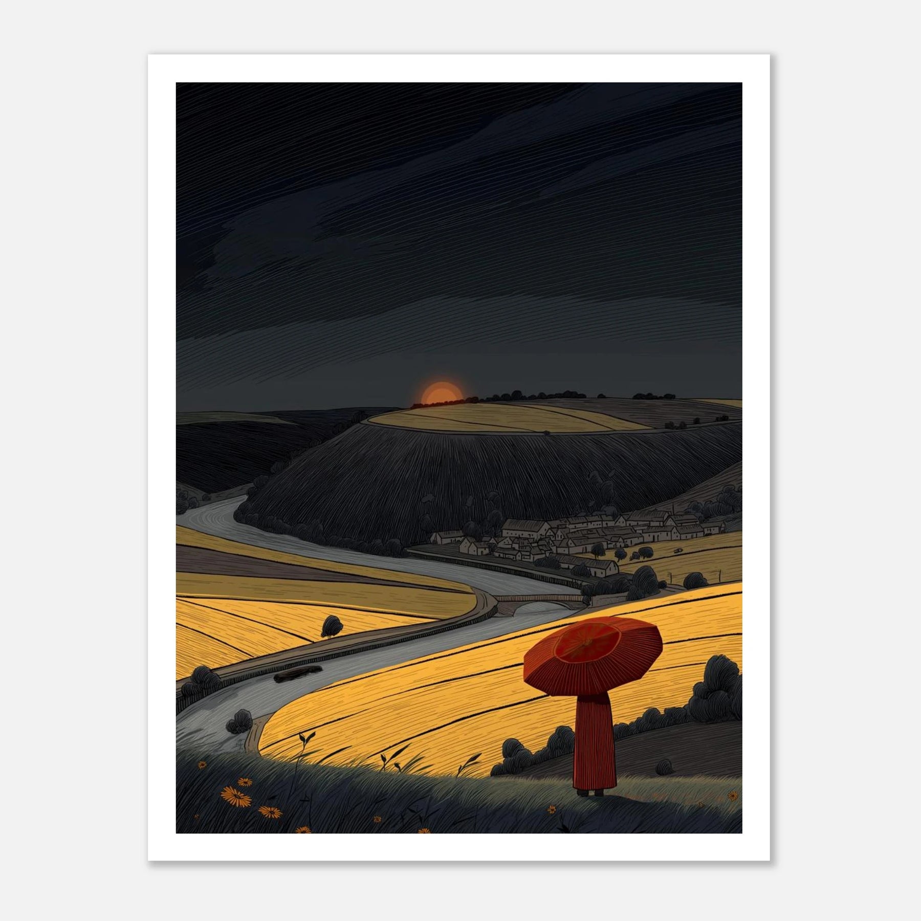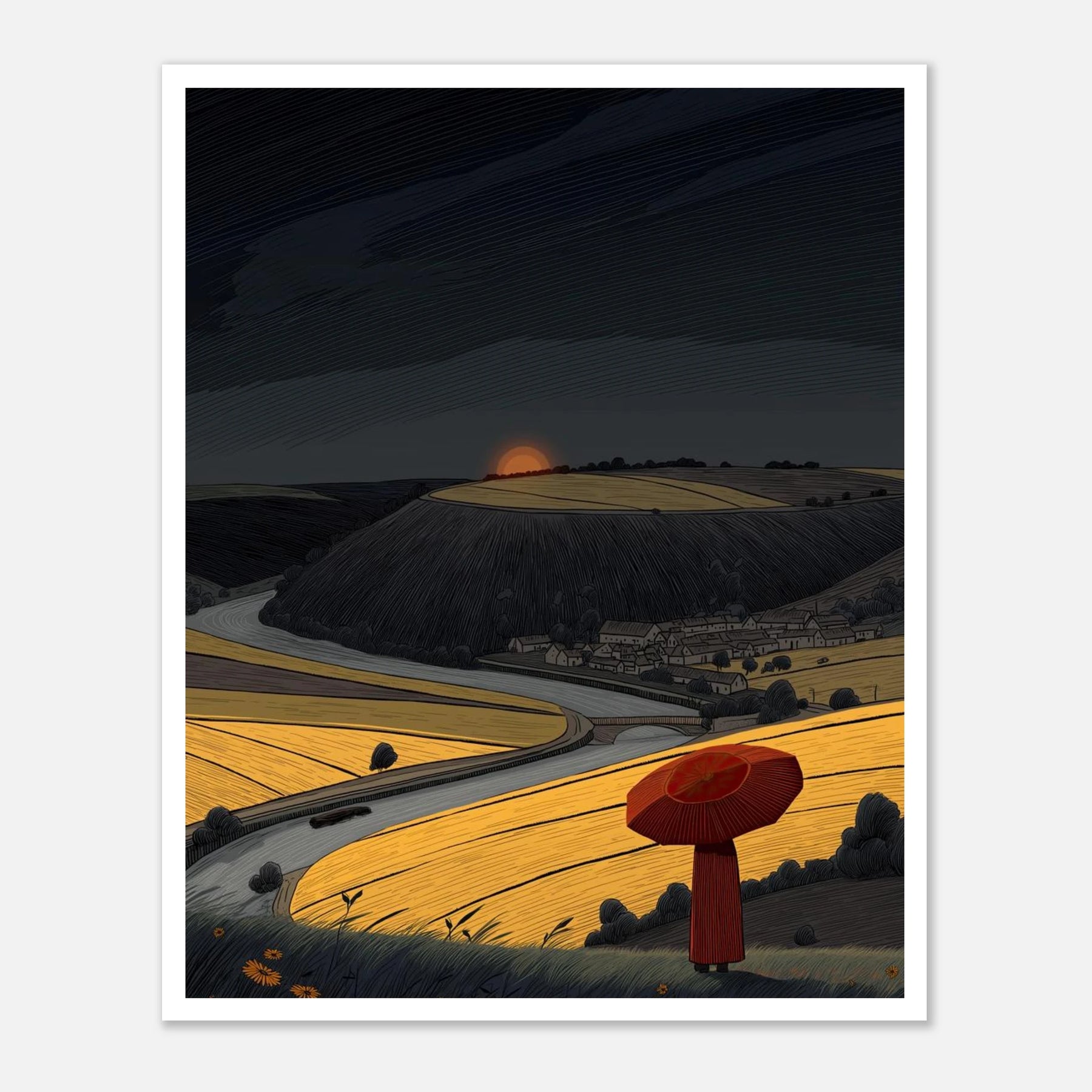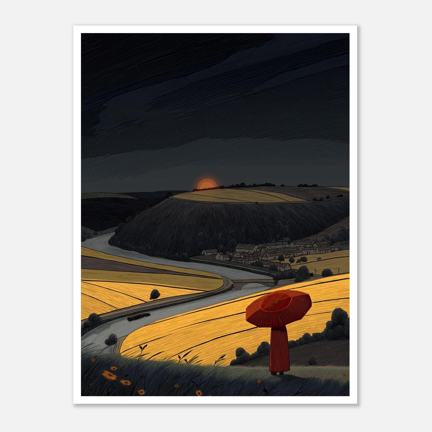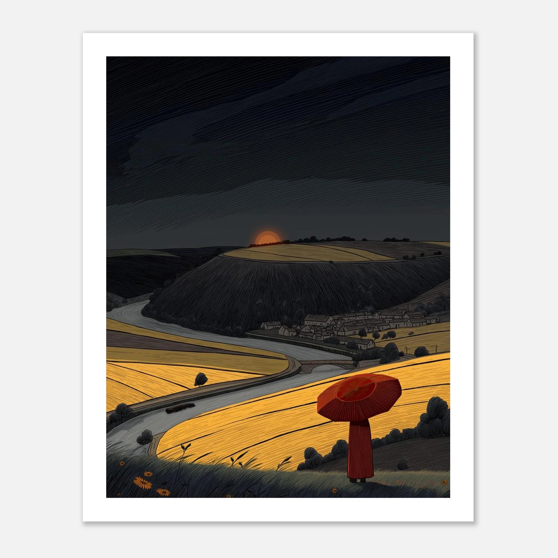 You can face the dark sky when you know your own path. A person with a red umbrella looks out over a winding road and bright golden fields. The sky above is heavy, but the ground below is full of light. This artwork speaks to having the integrity and strength to keep going, even when things look tough ahead.
